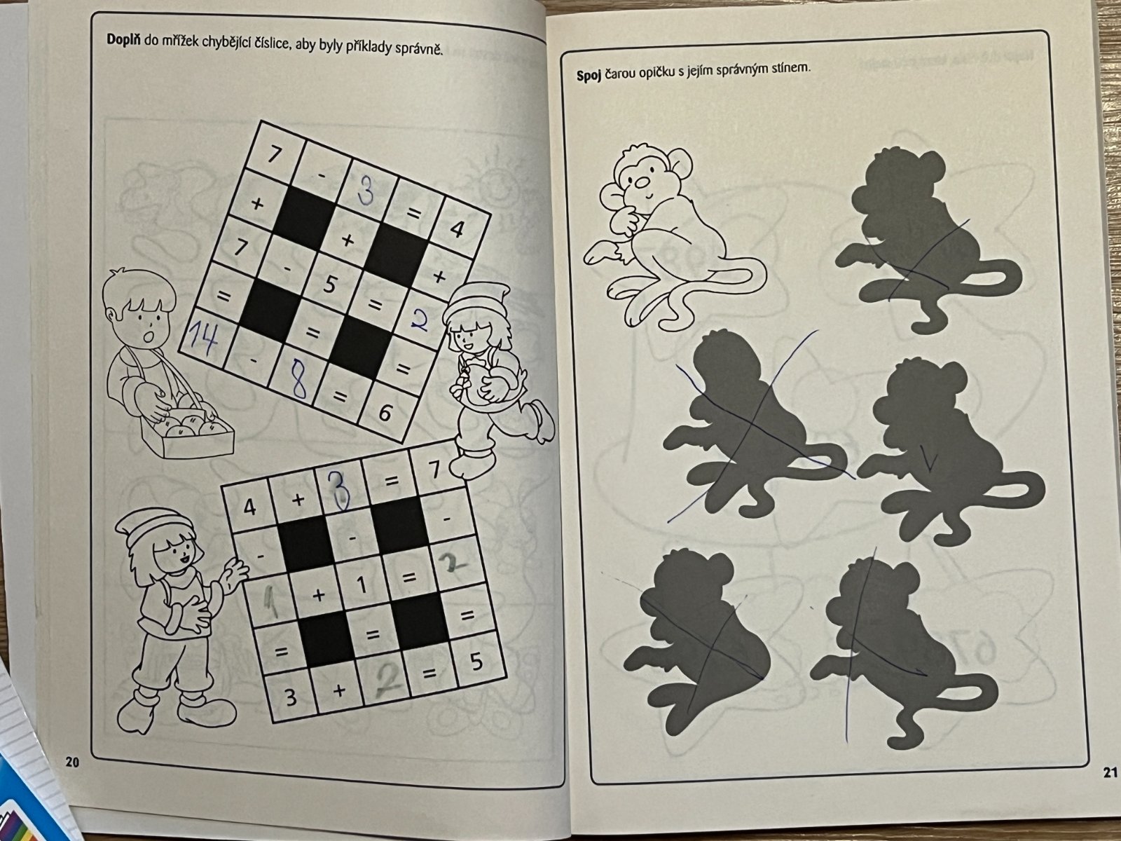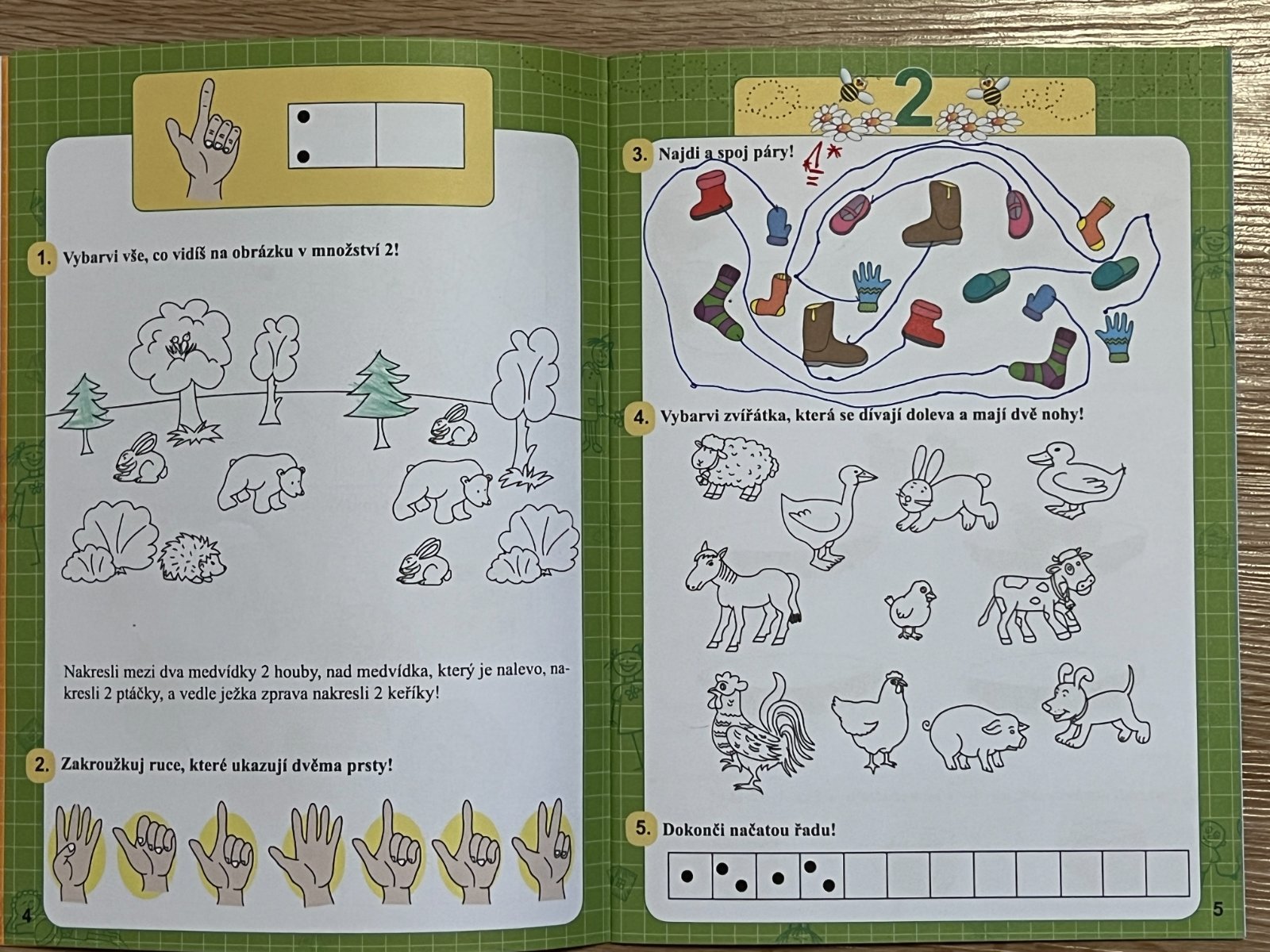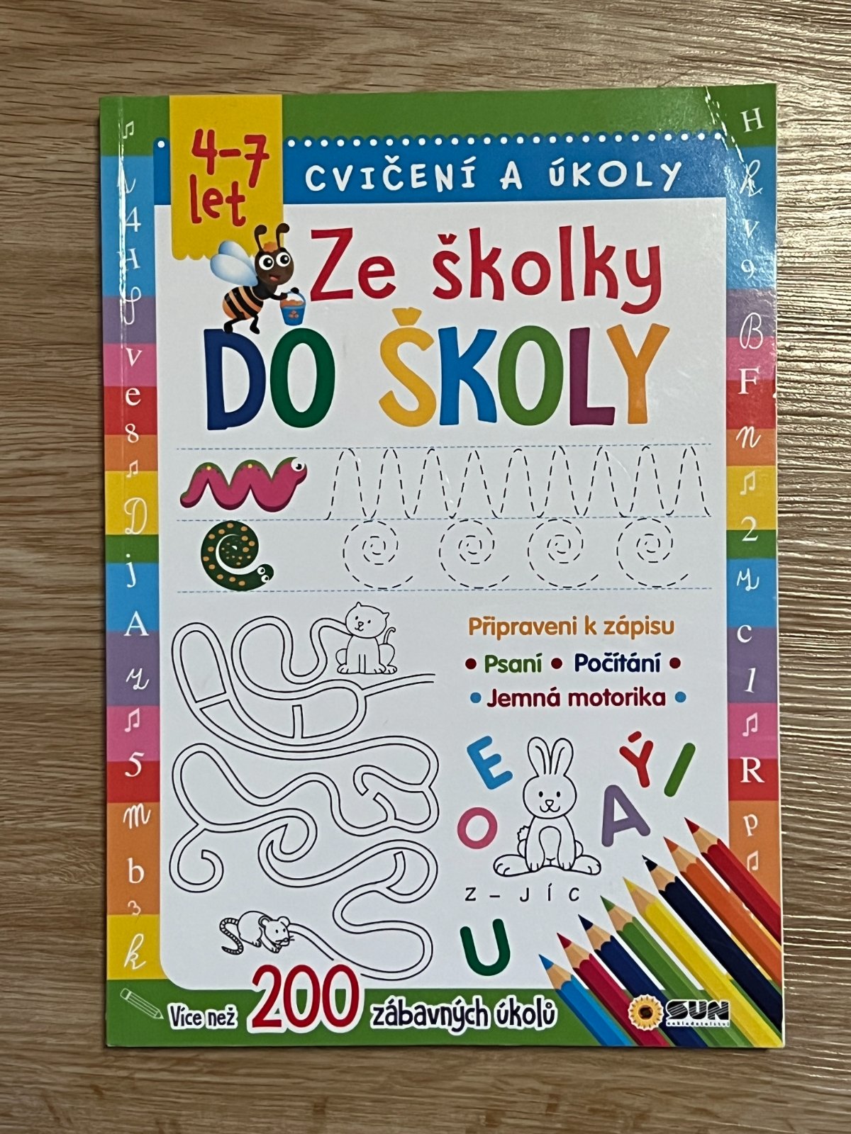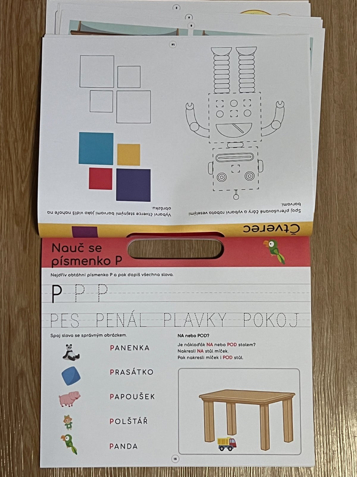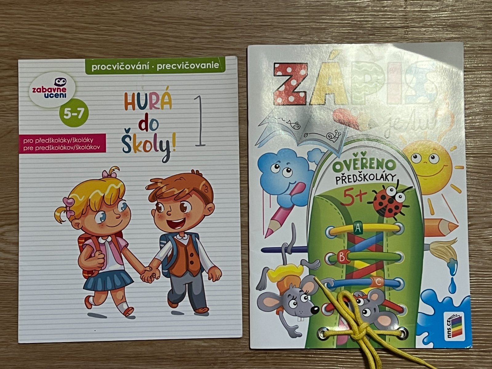Sešity pro předškoláky – jeden sešit z ca 40 % vyplněn, jeden zcela nepoužit a zbytek ca 10 % vyplněno.