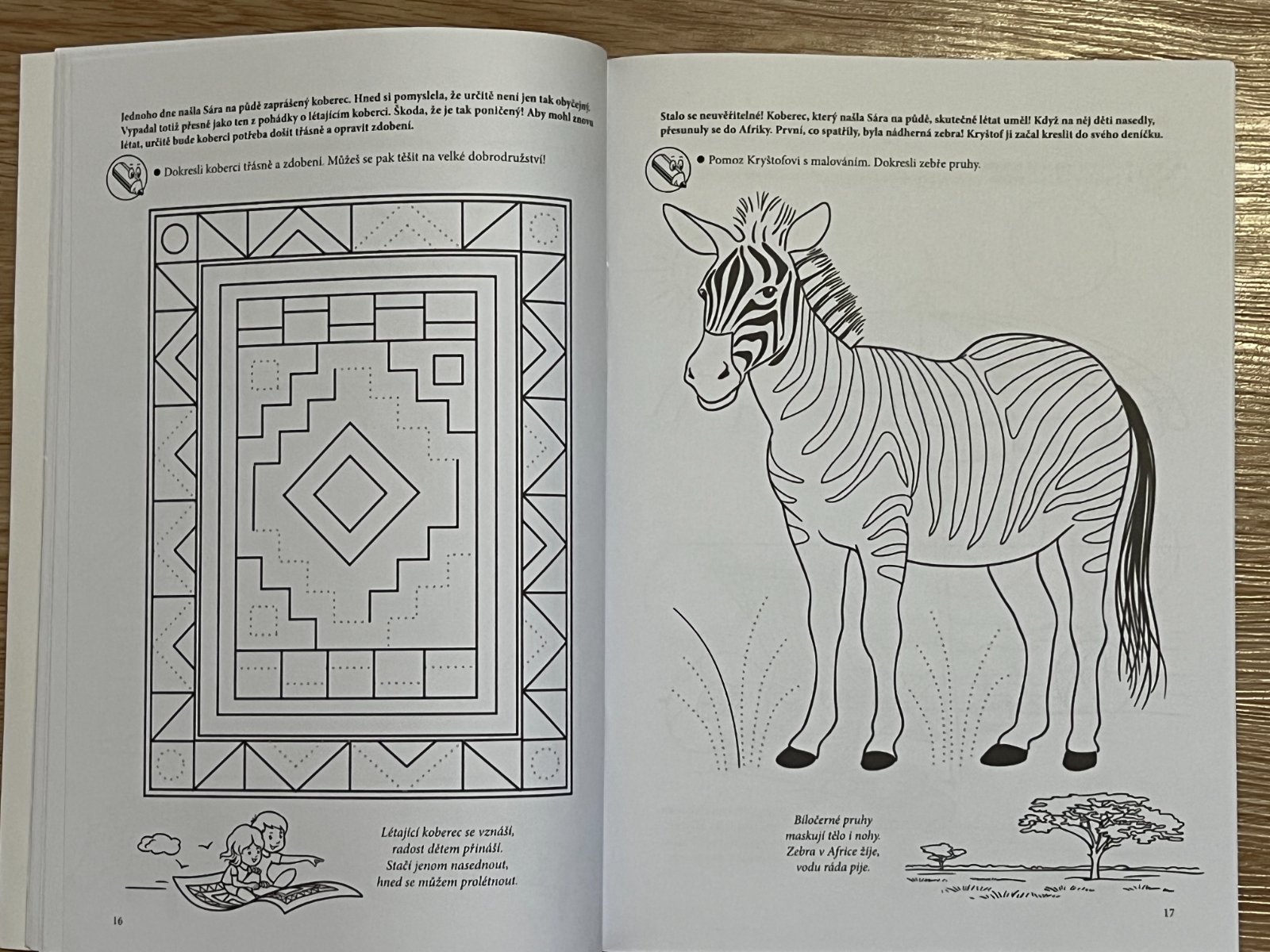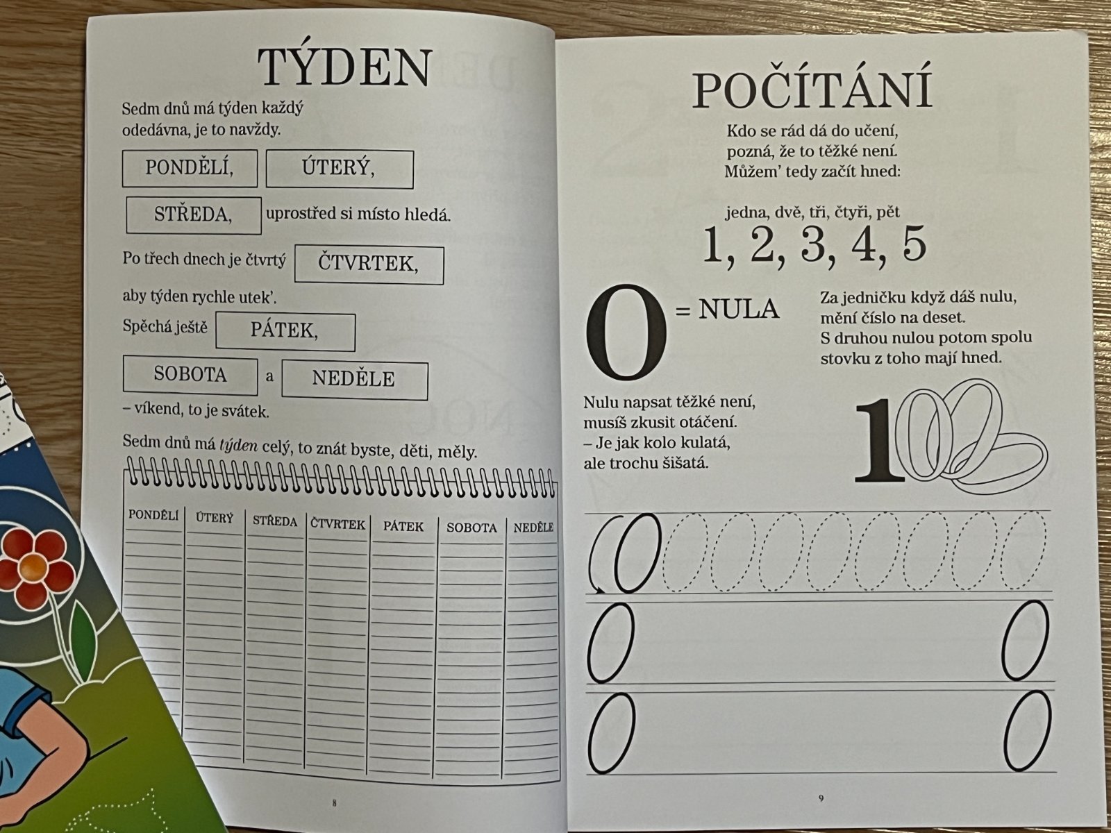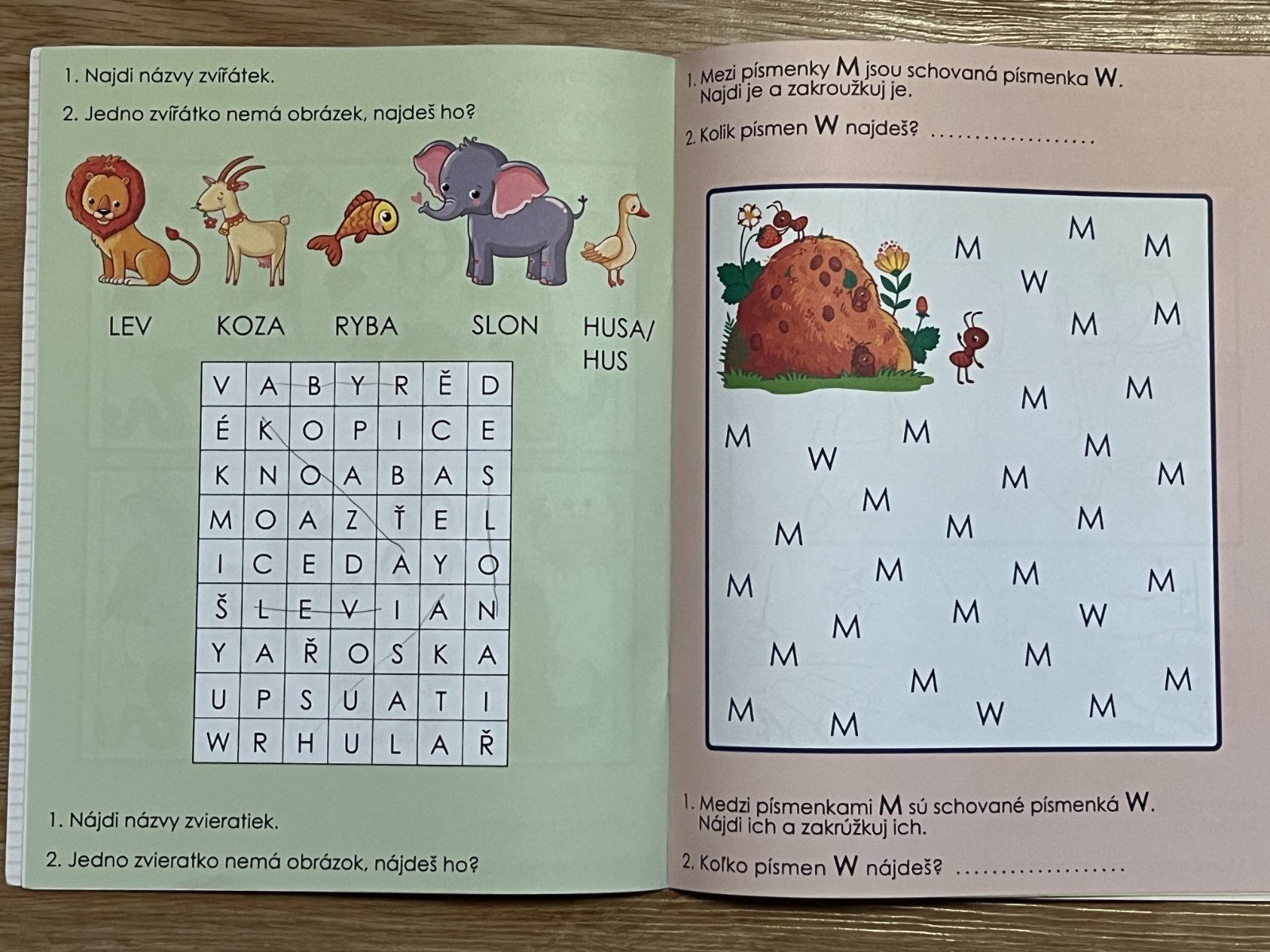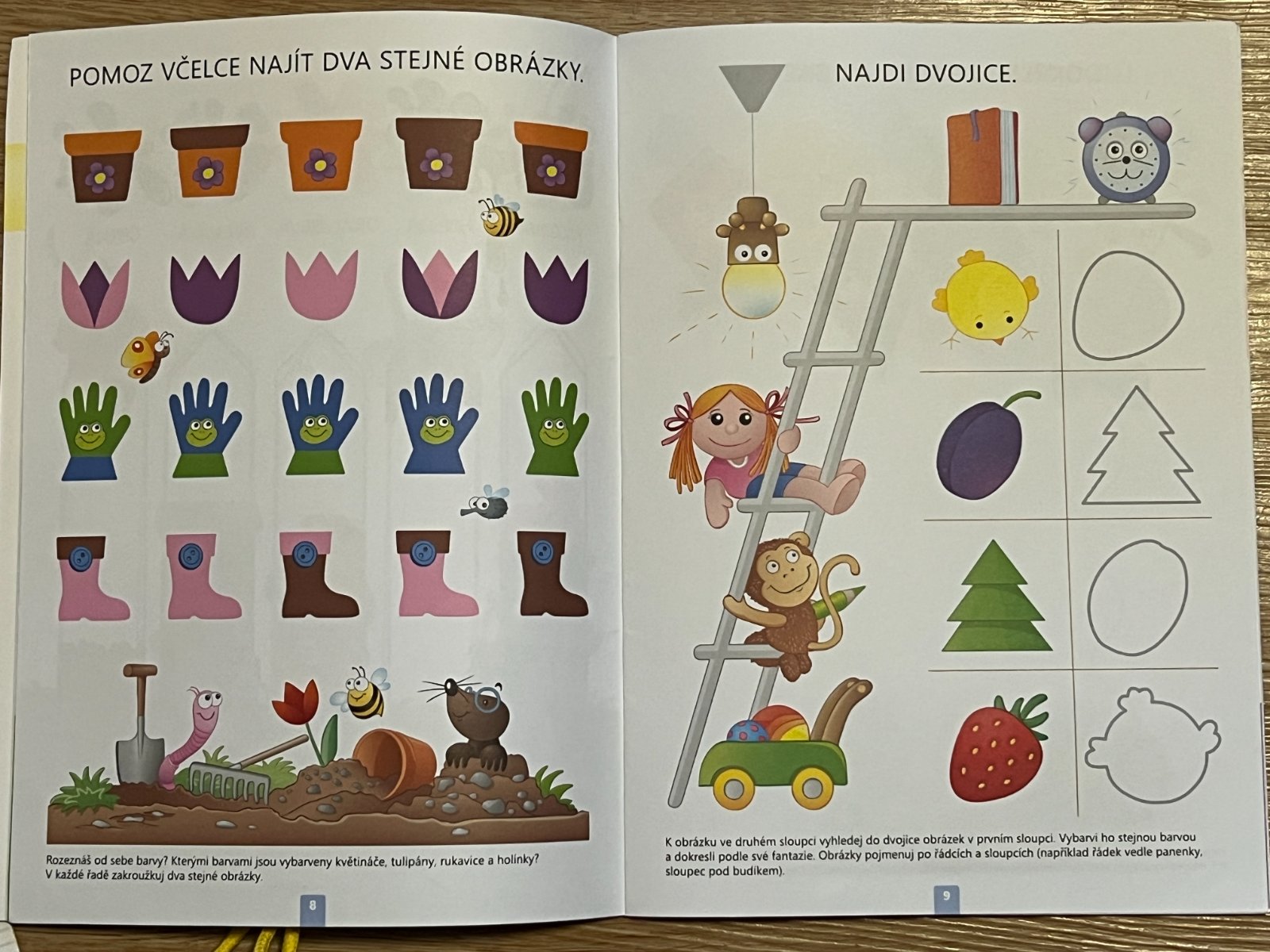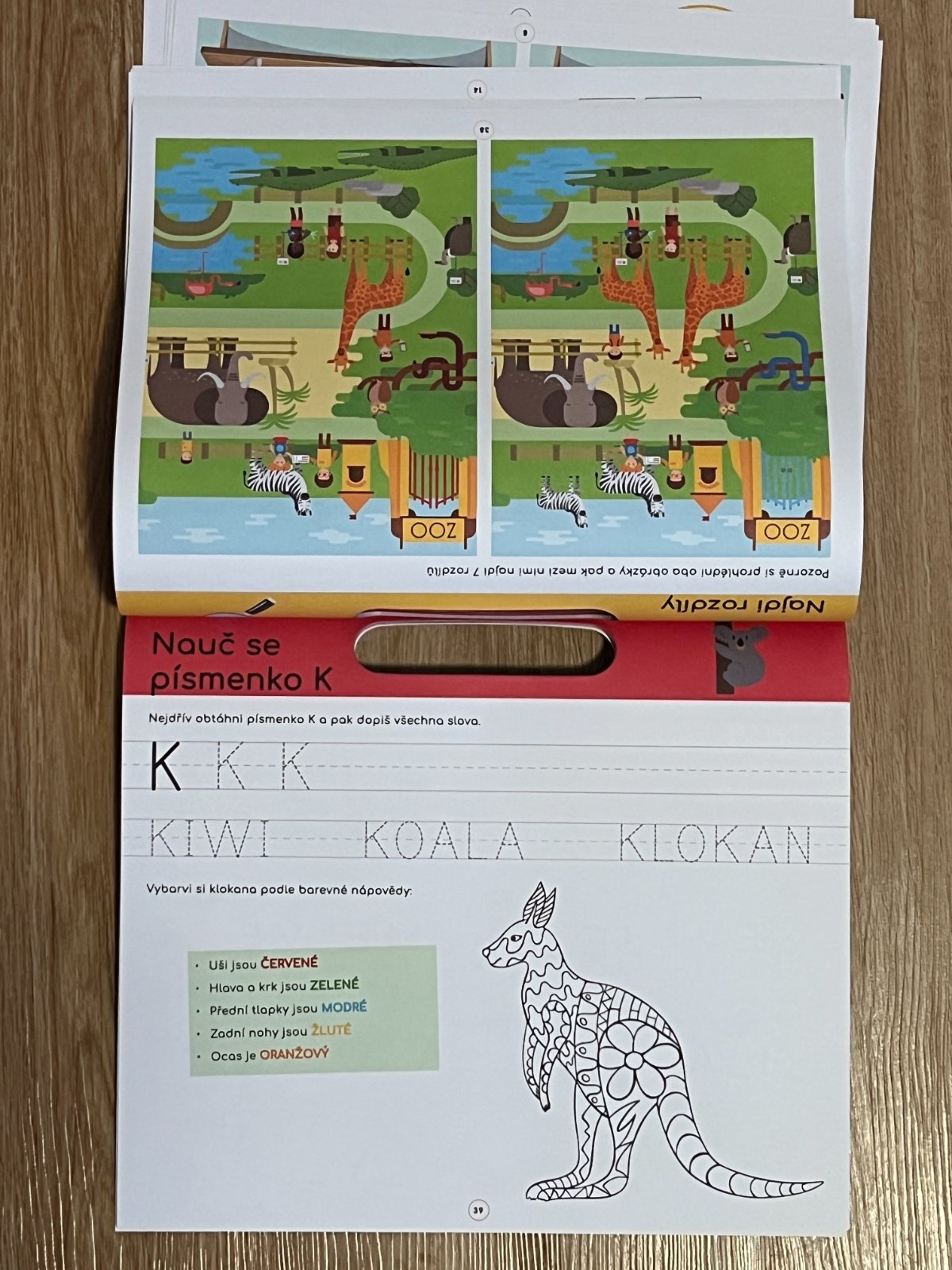 Sešity pro předškoláky – jeden sešit z ca 40 % vyplněn, jeden zcela nepoužit a zbytek ca 10 % vyplněno.