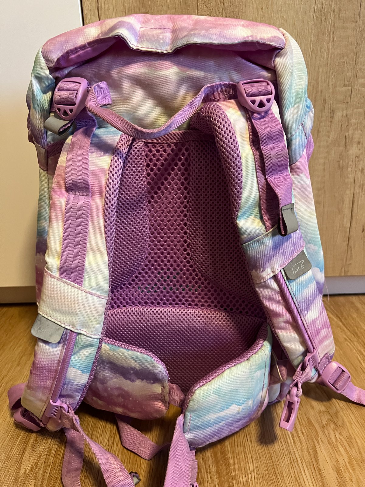Prodám kvalitní ergonomický batoh. Je vyroben z odolného materiálu a vybaven řadou reflexních prvků. Součástí batohu je 7 ks placek s výměnnými obrázky na suchý zip, integrovaná pláštěnka ve víku batohu, oddělená kapsa na svačinový box a systém odvětrávání zad.
