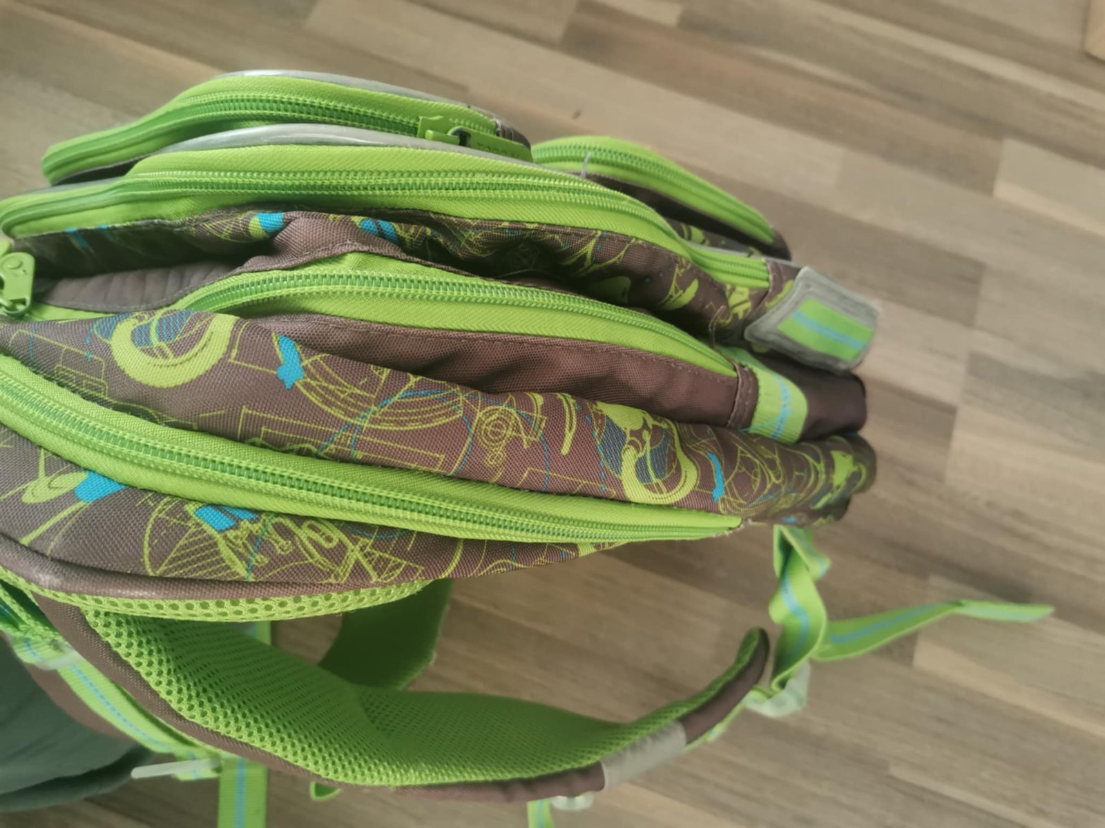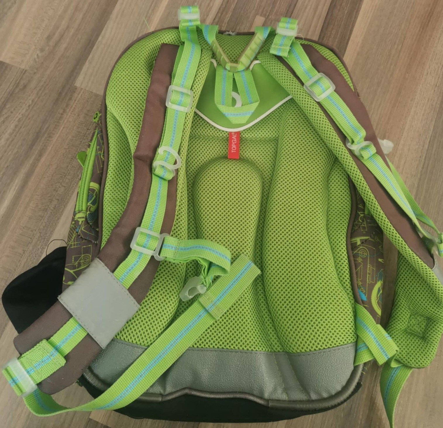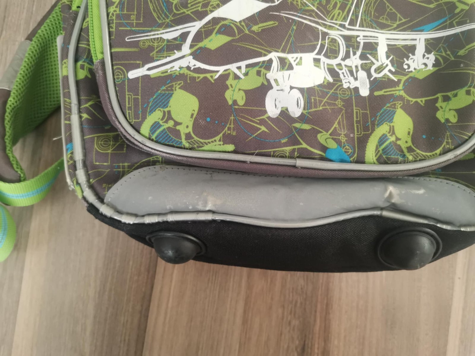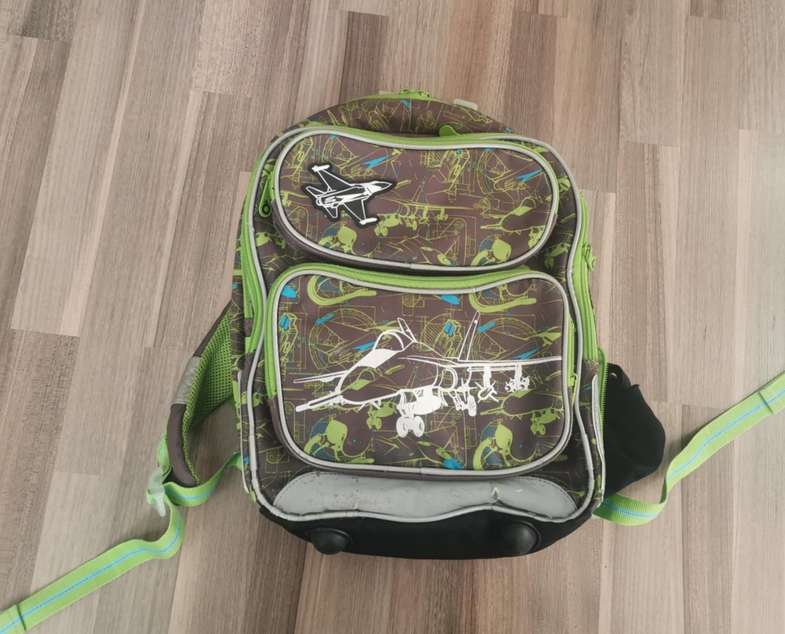 po dětech, známky nošení, trhlá kapsa na pití, trohu sedřený reflexní prvky