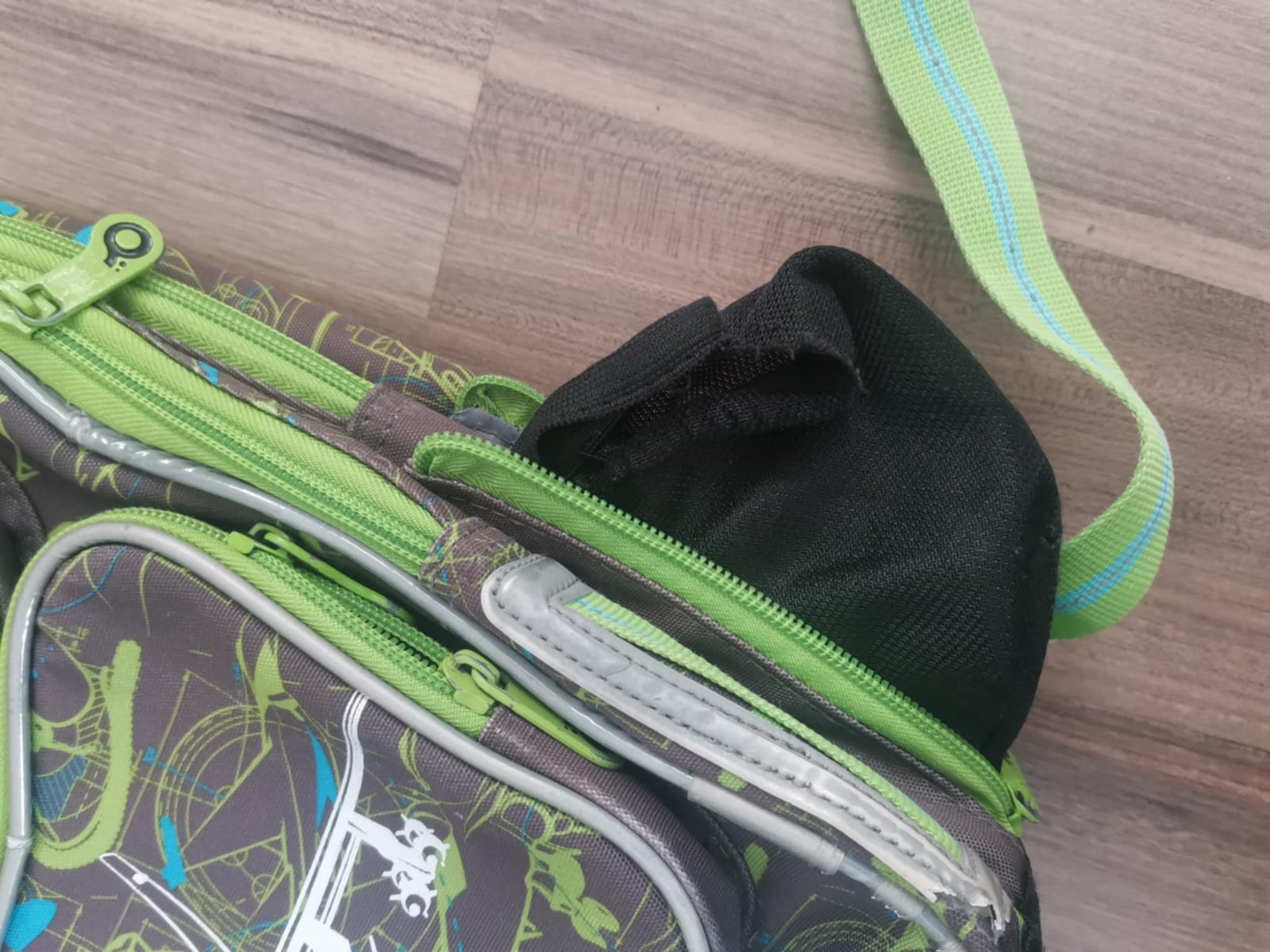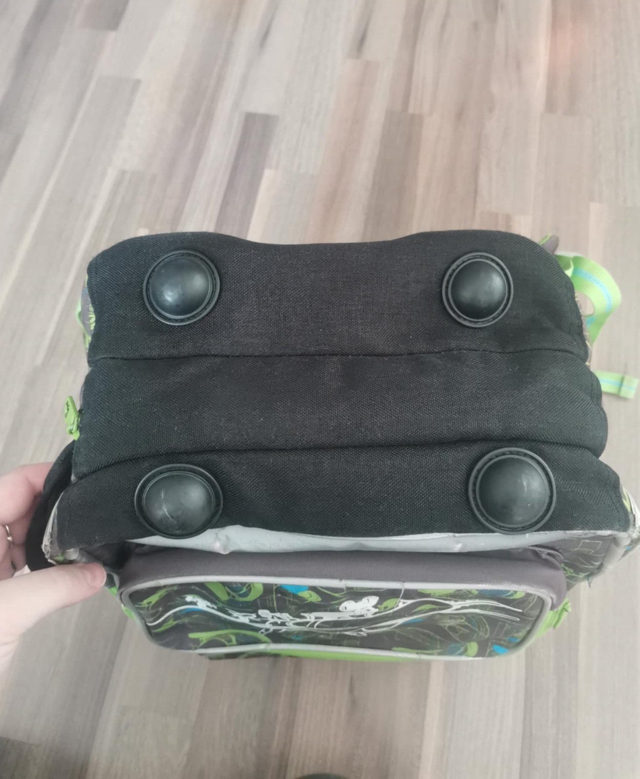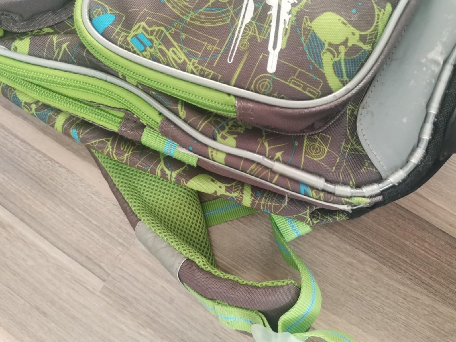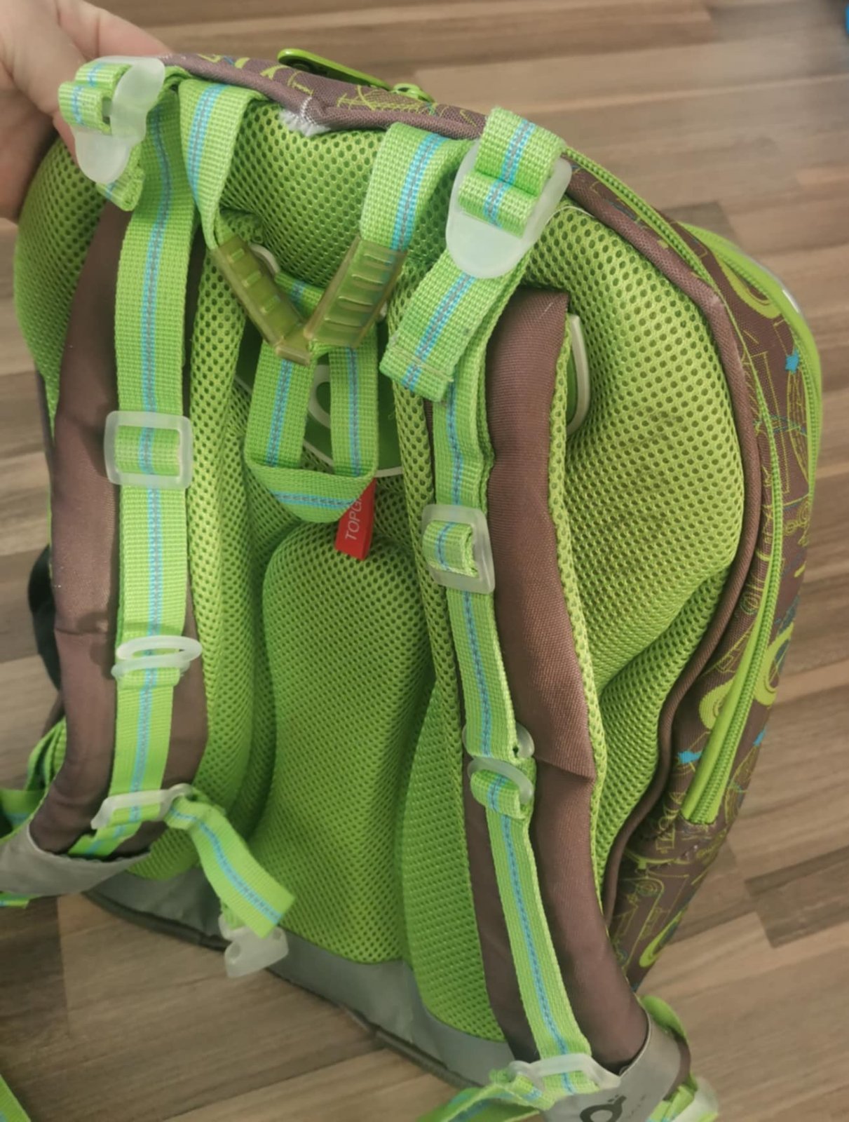 po dětech, známky nošení, trhlá kapsa na pití, trohu sedřený reflexní prvky
