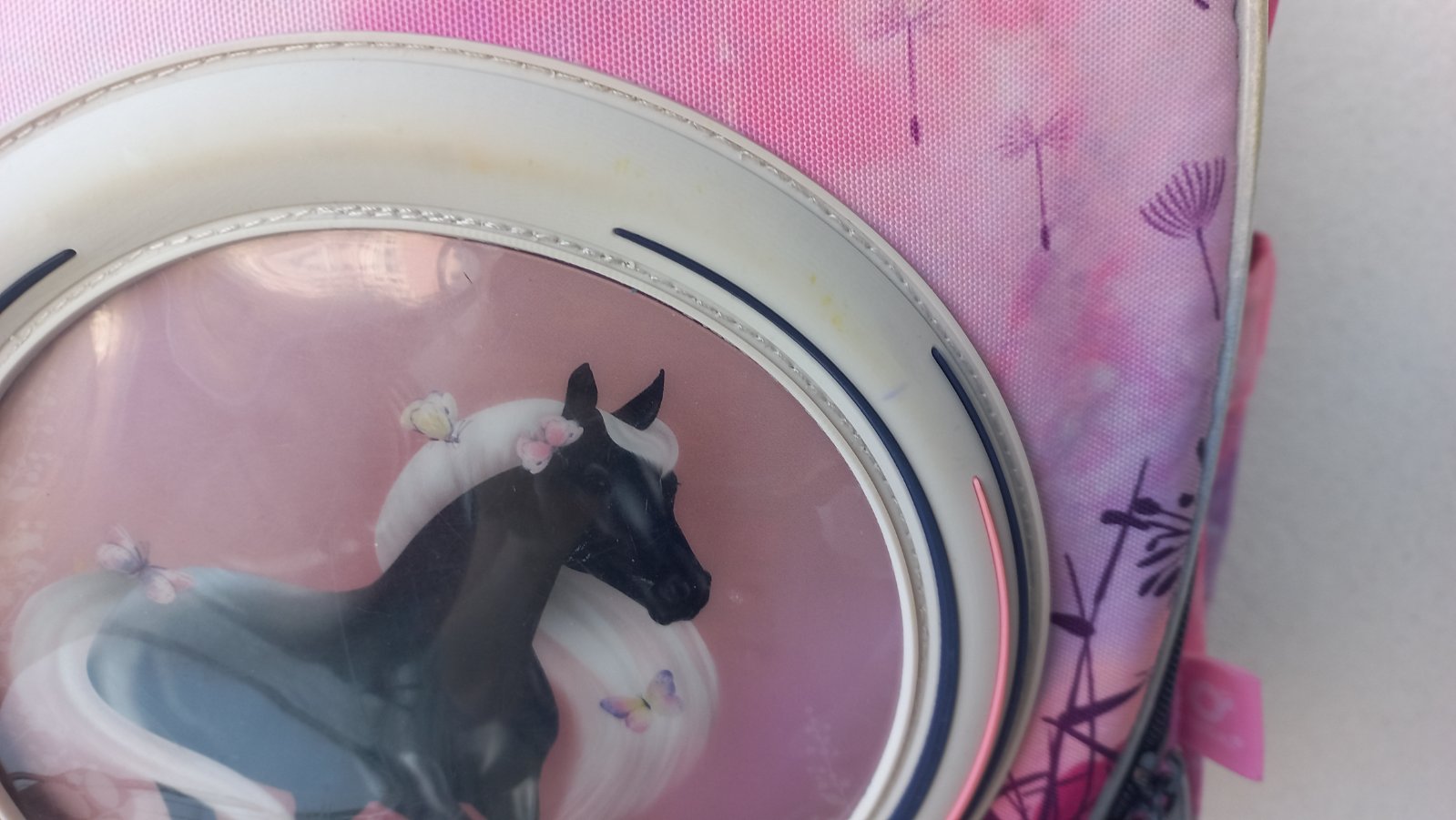 Školní batoh Topgal Endy s výměnnými obrázky koňů. Nese běžné známky použití, ale stále funkční, zipy fungují pefektně. Dno neprodřené, síťka plně funkční. Před prodejem vypraný.