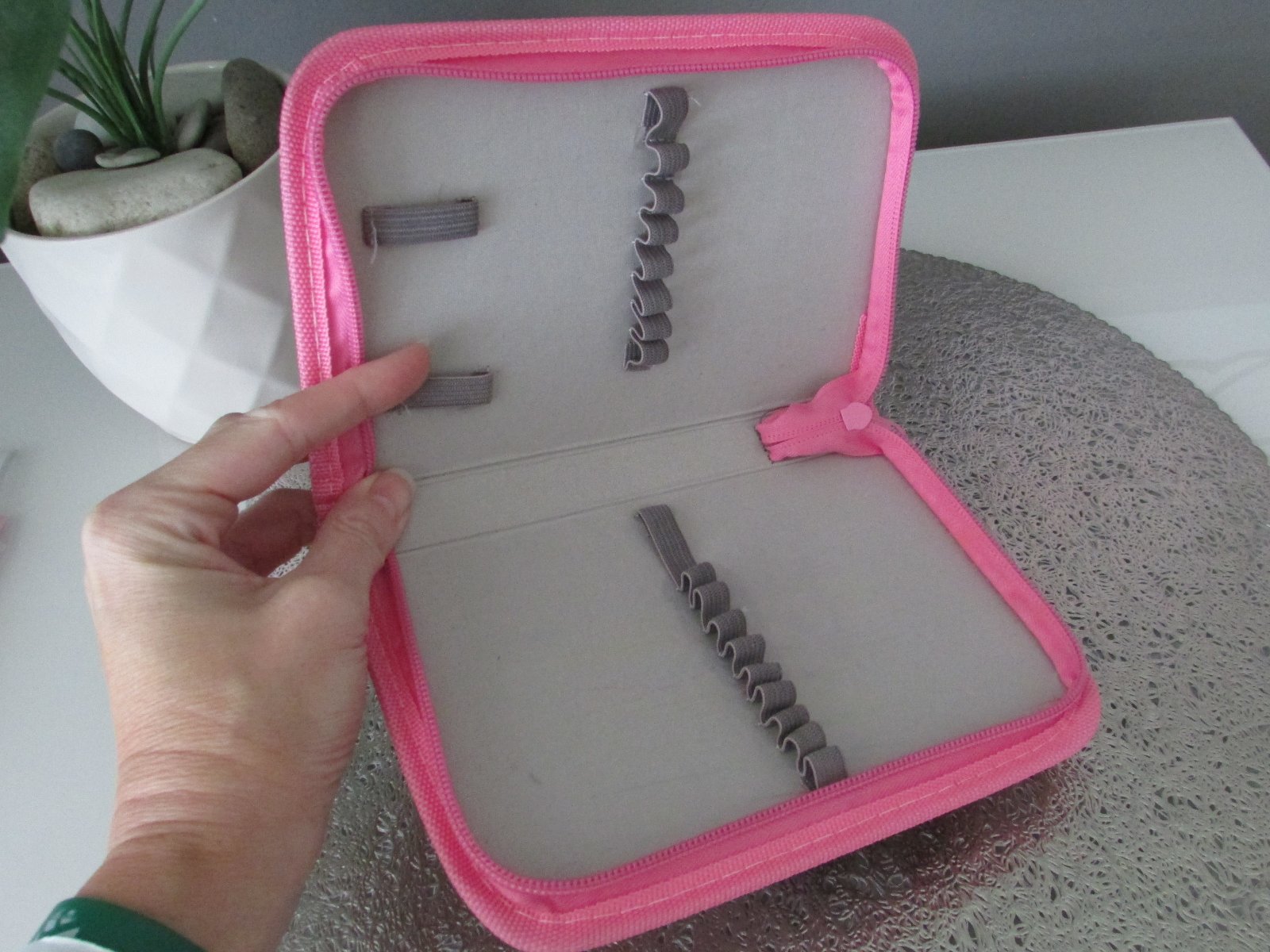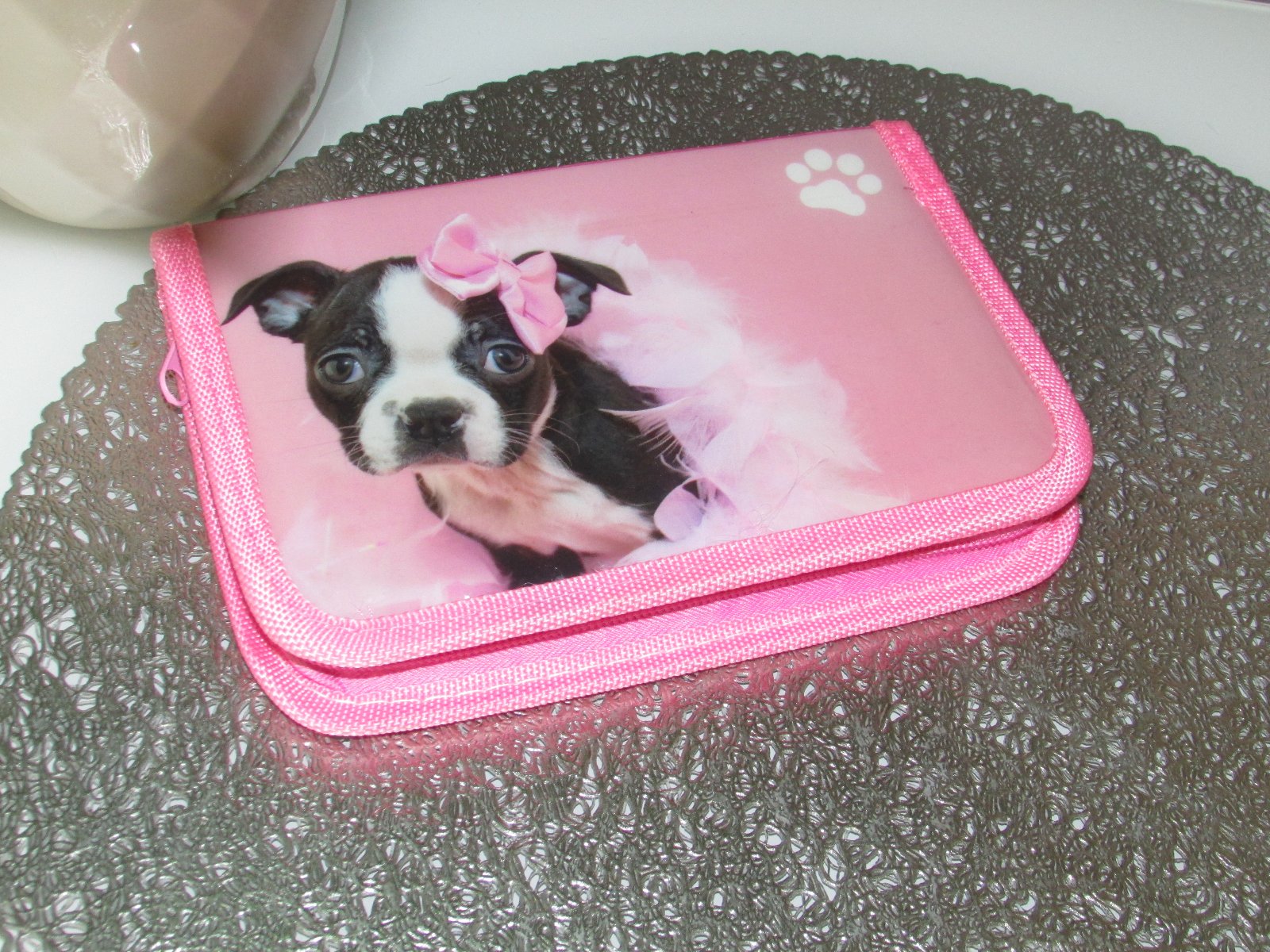 Růžové pouzdro /penál s pejskem. Nošené chvíli v 1. třídě.