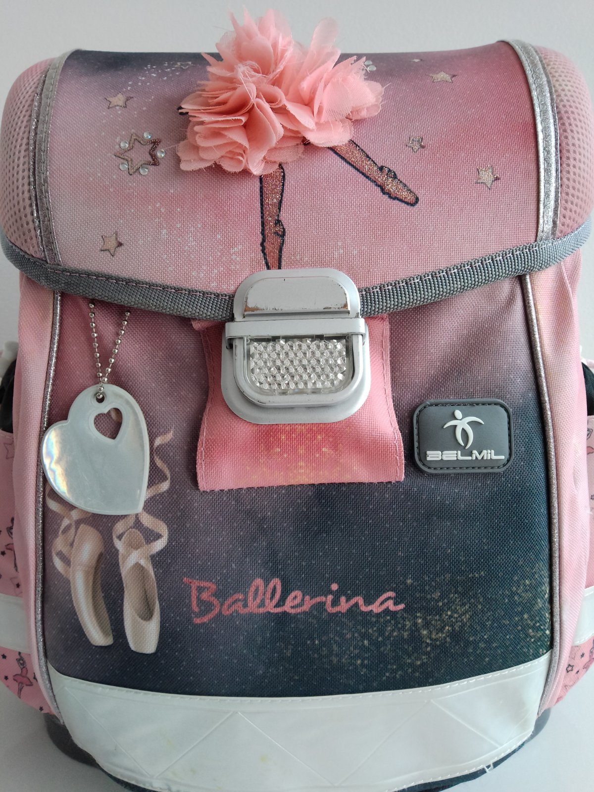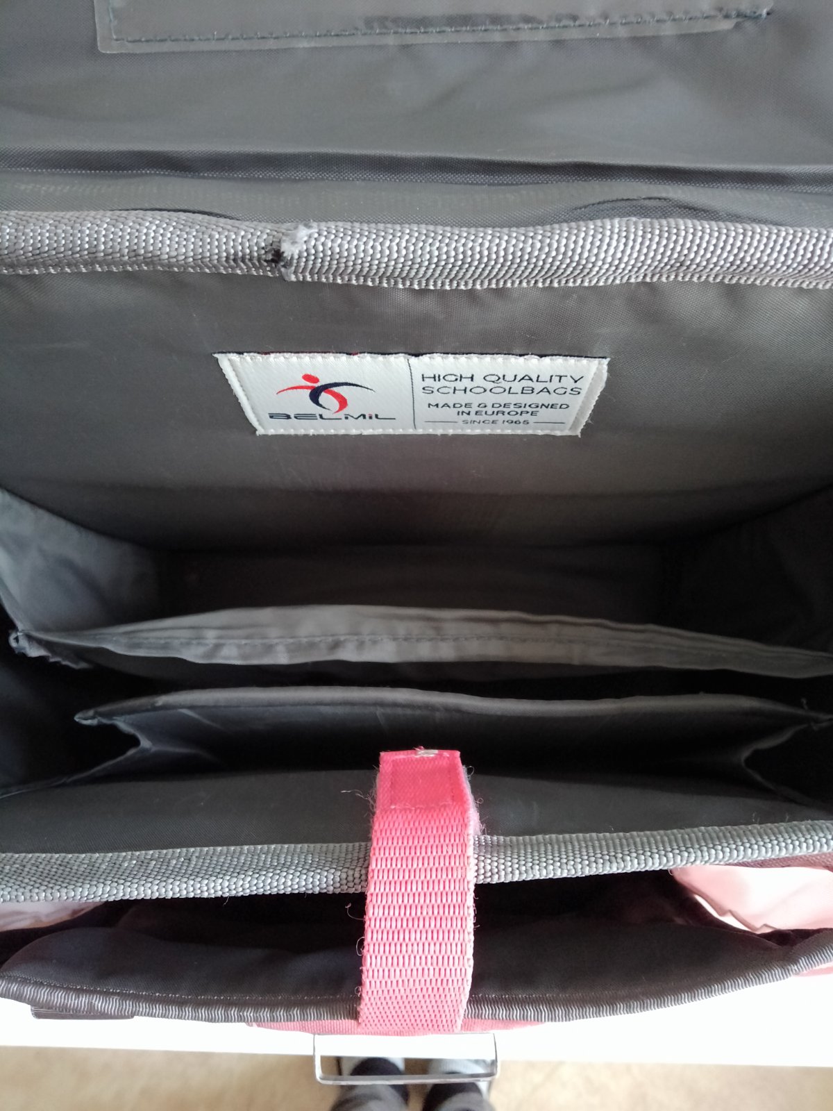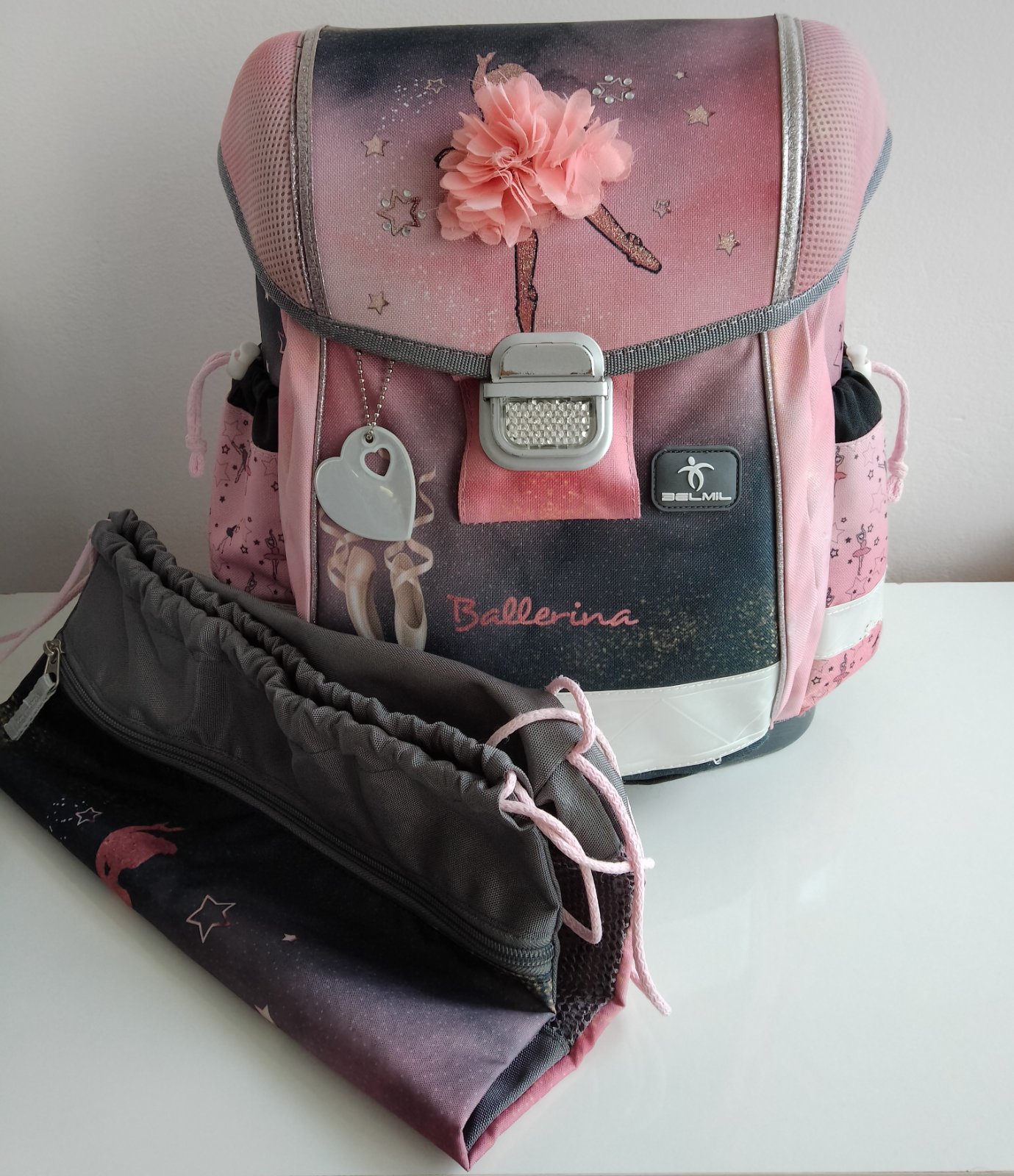 Dívčí školní aktovka Belmil, váží jen kolem 920 990 g. Je zpevněná ze všech stran a pevná spodní část také zvyšují stabilitu a životnost. Drží tvar, nepřevrací se a je voděodolná. Ergonomický tvar a prodyšná zádová část zajišťuje, že tlak na záda dětí je minimalizován. objem: 19 l, hmotnost aktovky: 920 - 990 g, rozměry: 37 x 30,5 x 19 cm. Pytlík na přezůvky. Pořizovací cena 1 790 Kč. Cena 490 Kč.