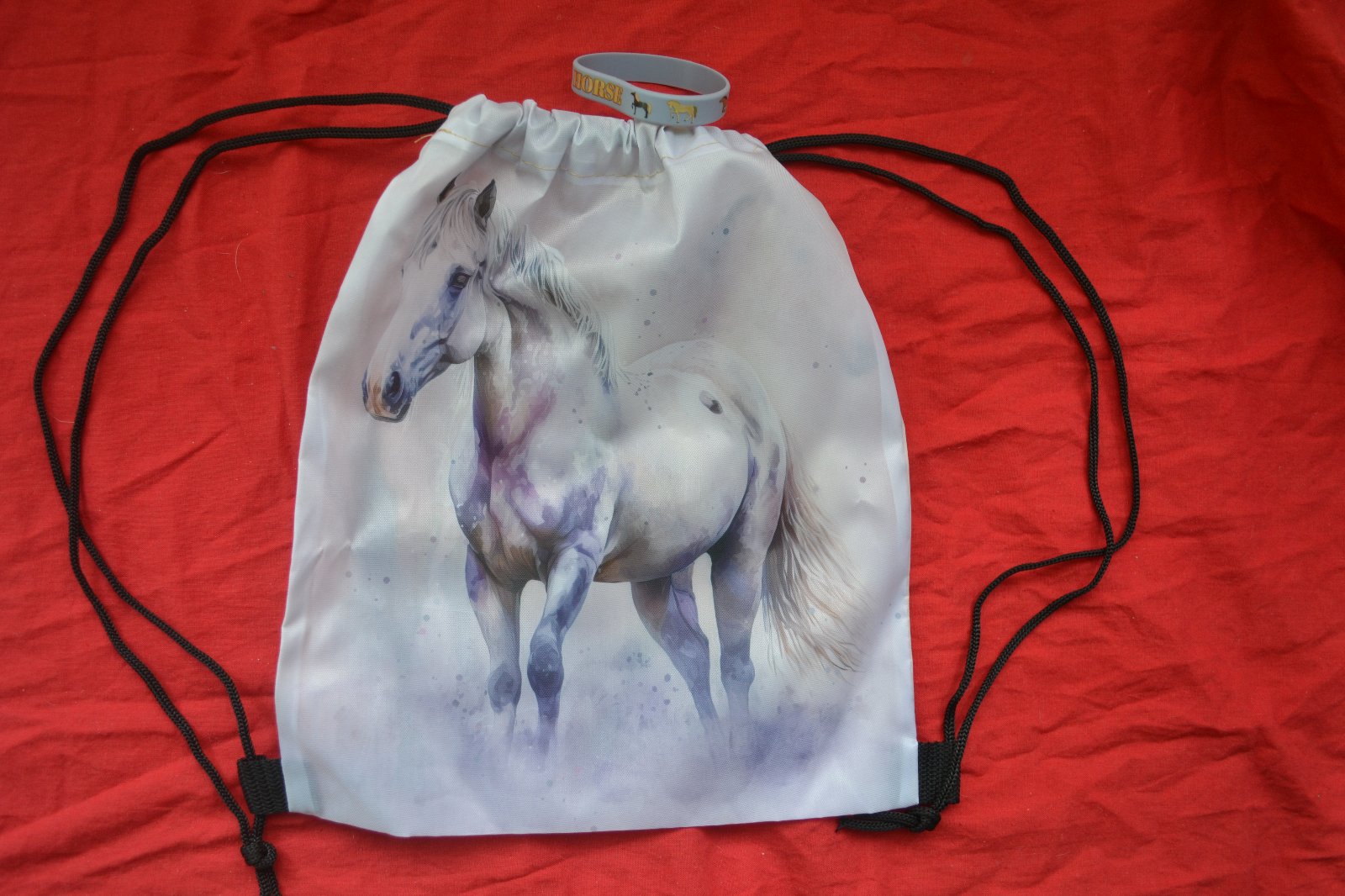 praktický moderní vak- pytlík na záda+ módní náramek s koníky, na vaku krásné obrázky koní, na každé straně jiný, stahuje se jednoduše pomocí šňůrek, které si nastavíte na požadovanou délku,do vaku můžete schovat boty, přezůvky ,oblečení,knihy,sportovní potřeby,26x31cm, lehoučký, mohou nosit děti už od tří let a více, nahradí krásně baťůžky