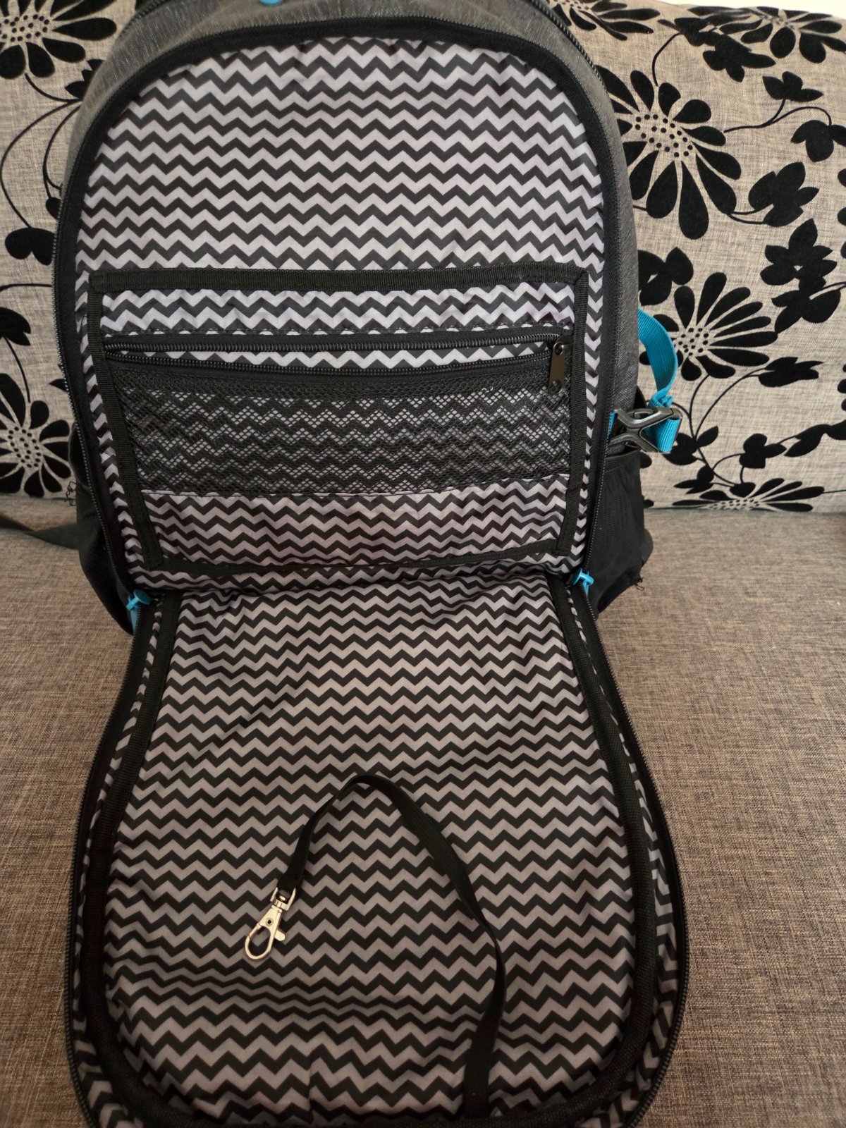 Ideální barva na které není nic vidět s reflexními prvky. Má dvě komory, dvě přední kapsy v tmavě šedé barvě s decentními doplňky petrolejové barvy. Má objemné hlavní komory, polstrovanou kapsu na notebook, na které je našita ještě menší polstrovaná kapsa na mobil nebo powerbanku. Kdo notebook do školy nenosí, ten tuto kapsu využije na sešity nebo různé složky.
