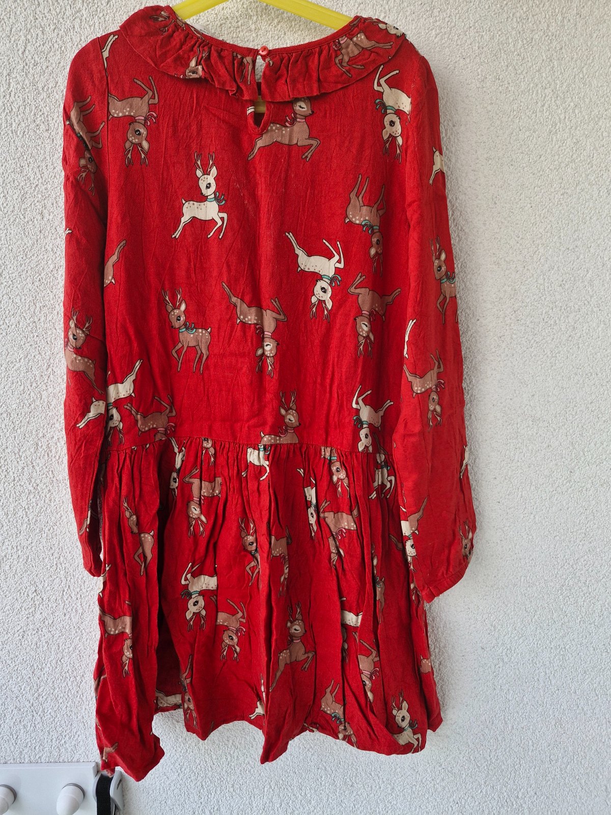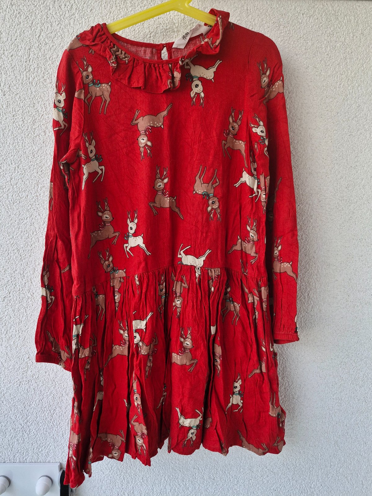 Vánoční šaty, uvedená velikost 140 (9-10 let), značka H&M. Šaty mají v několika místech posunuté a vytahané nitky (zejména na zádech), viz. poslední foto