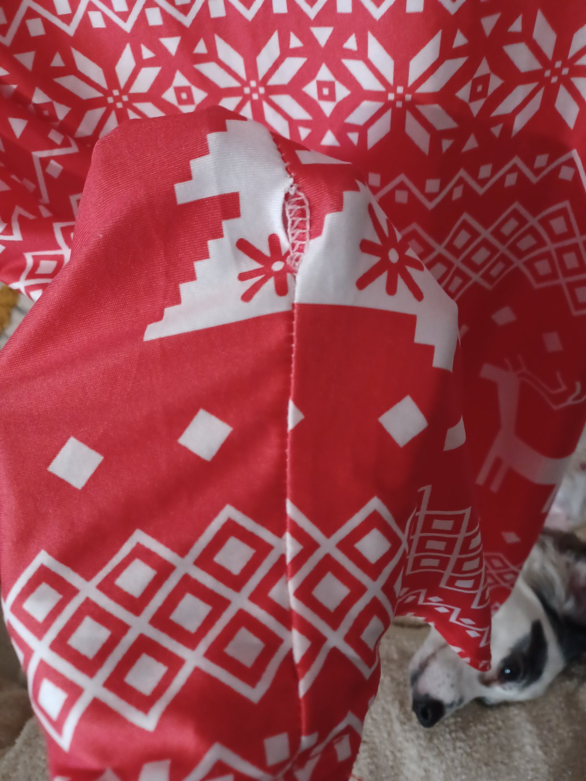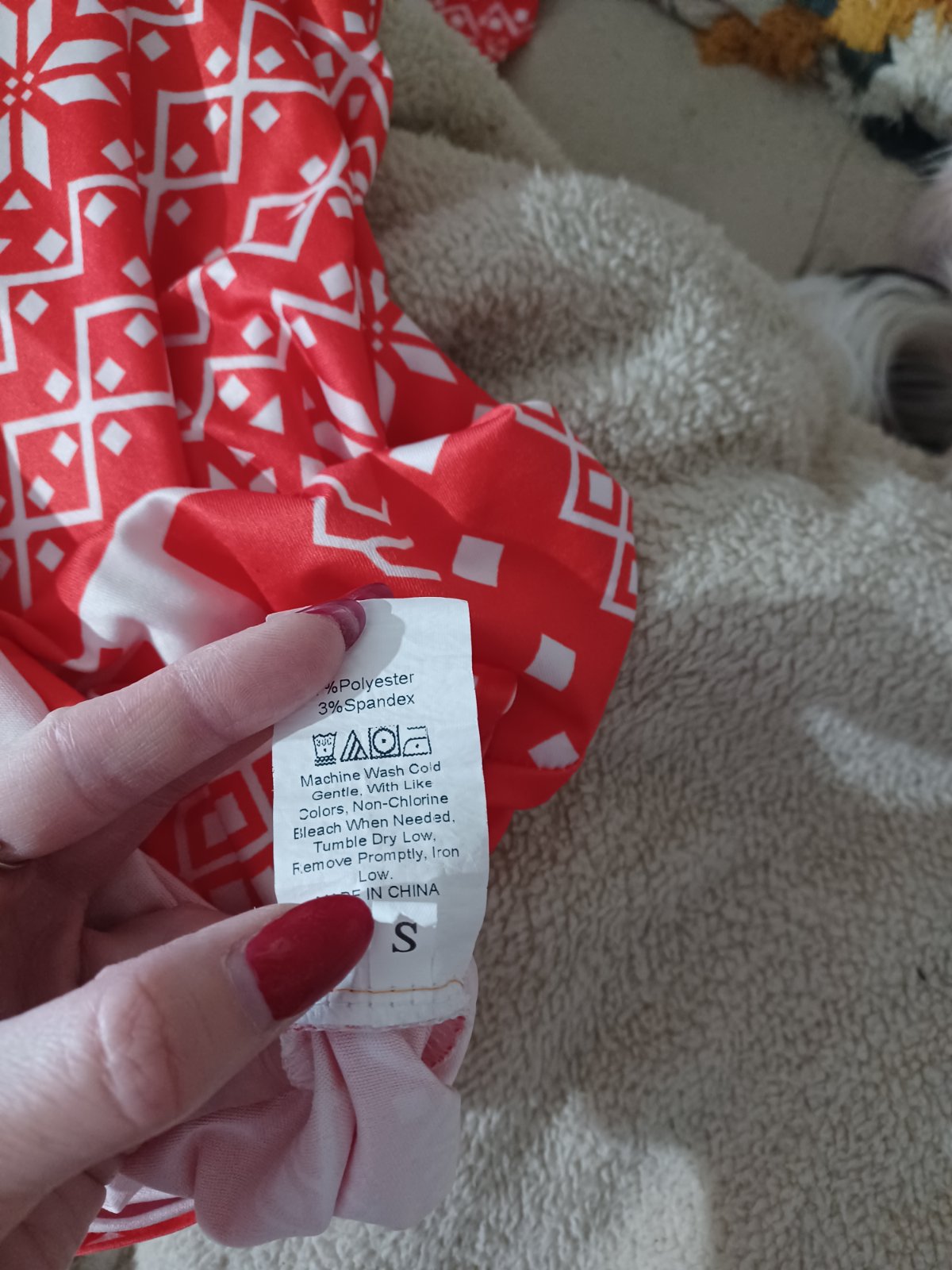 Jednou vzaté vánoční šaty S, ale jsou menší, pro velmi štíhlou postavu. Slabý polyester. Na boku díra ve švu, po zašití nebude znát.