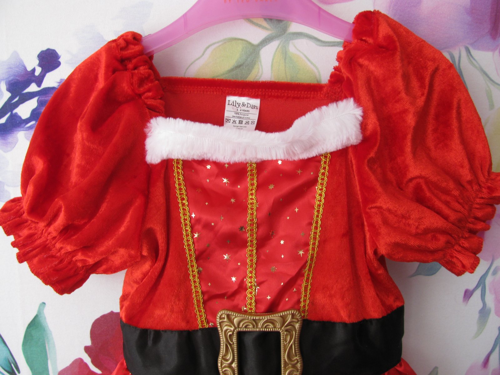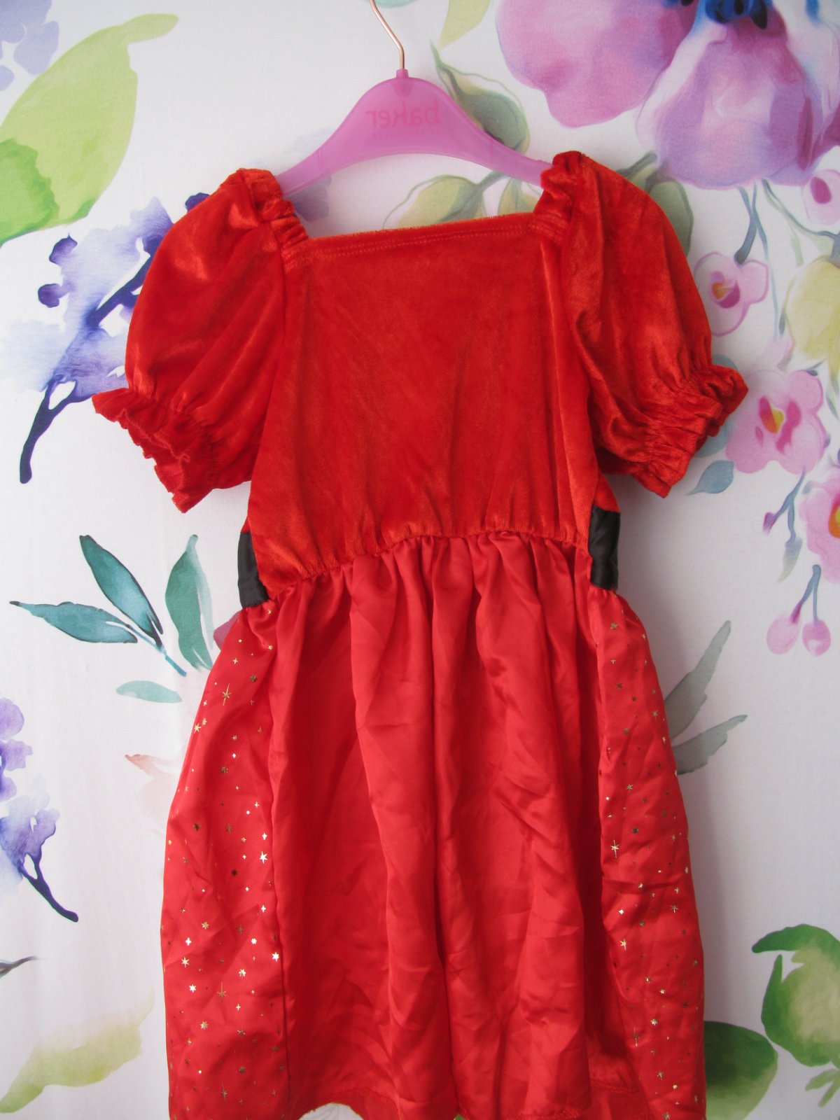 Krásné velurové šaty, se saténovou sukní, zdobeno zlatými hvězdičkami, v pase, ramínka a konce rukávů pružné do gumy, plastová spona v pase. 100% polyester.