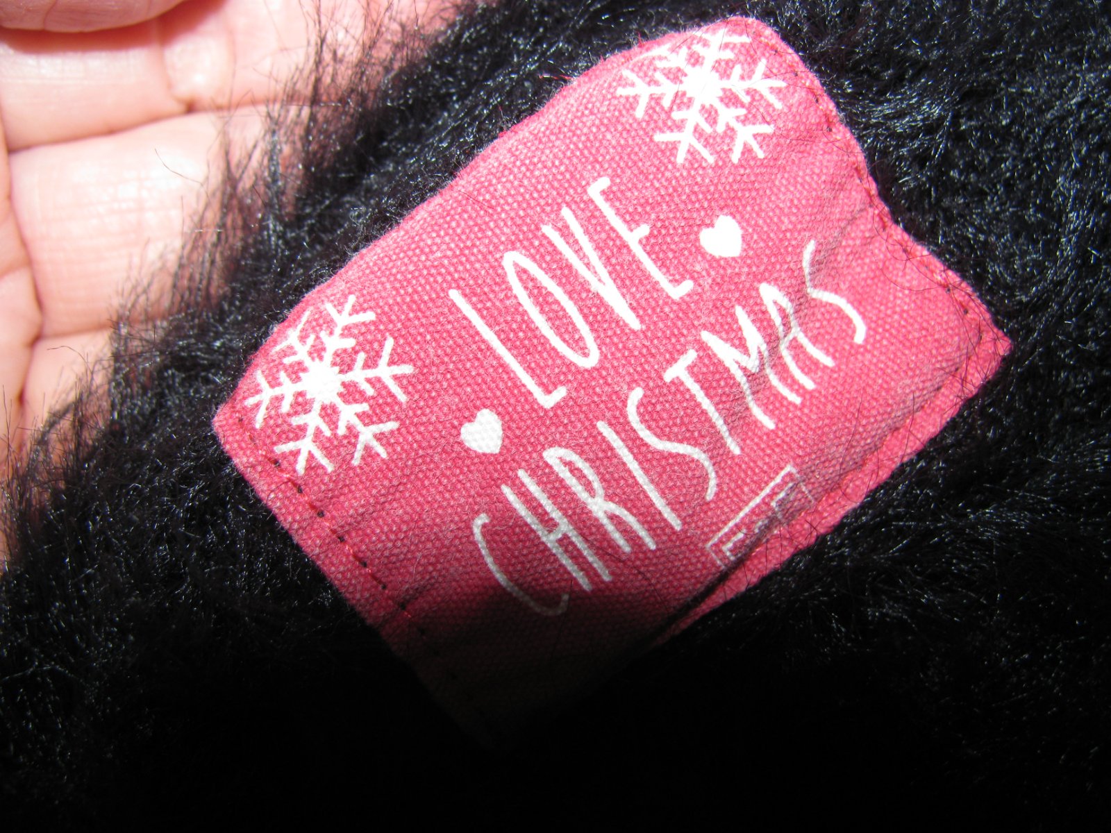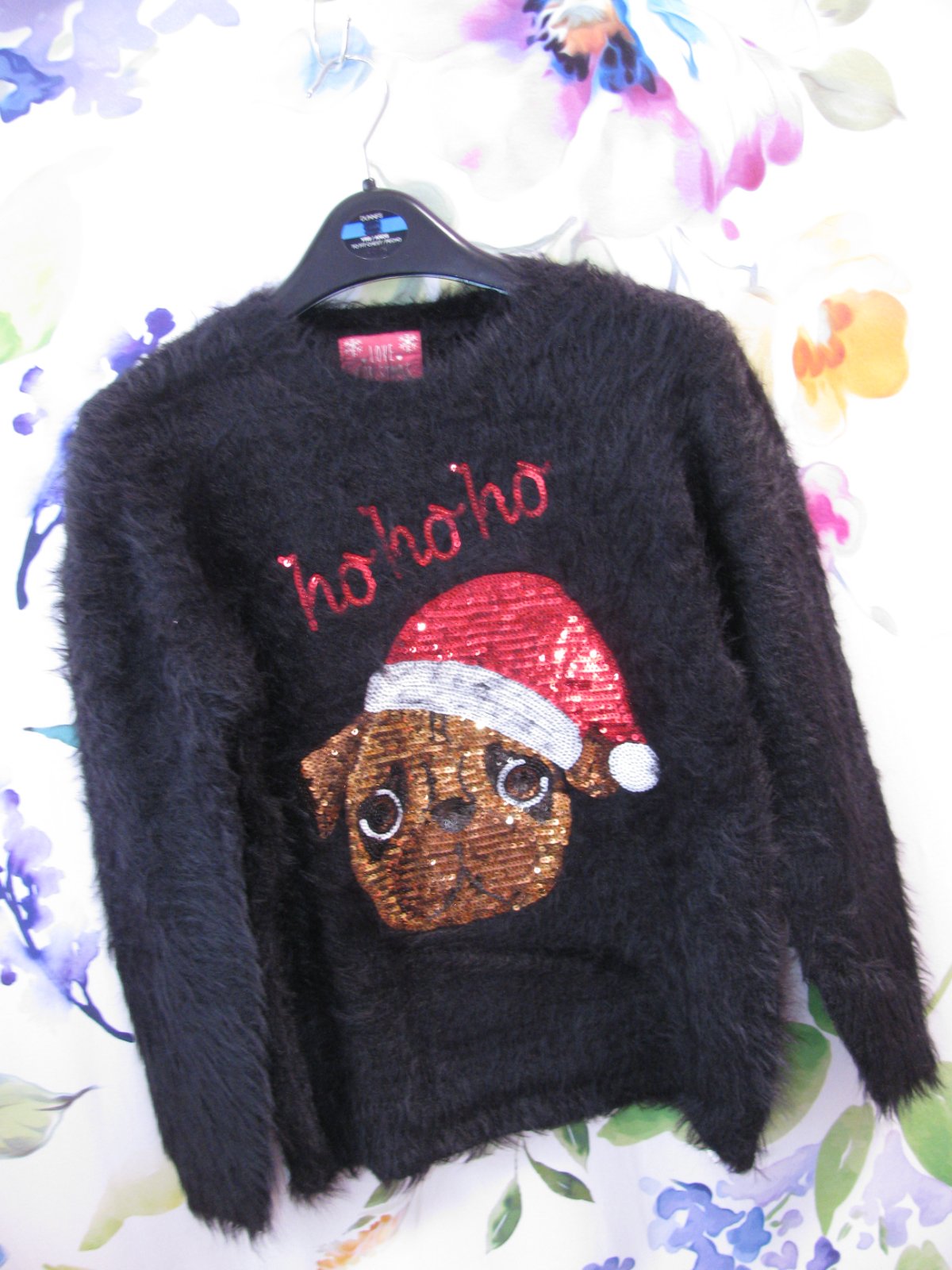 Hezký jemný černý pružný svetr, obrázek z našitých flitrů, 73% polyamid, 27% acryl.
