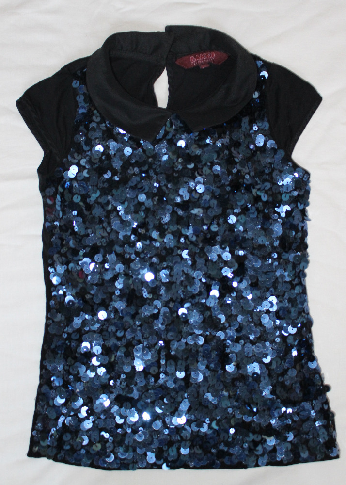 Top stav, přední díl dvojitý. flitry kobaltově modré, poklad černý, zapínání za krkem na knoflík (+náhradní), délka. 47cm, šířka pod průramky: 33cm, 100% polyester.