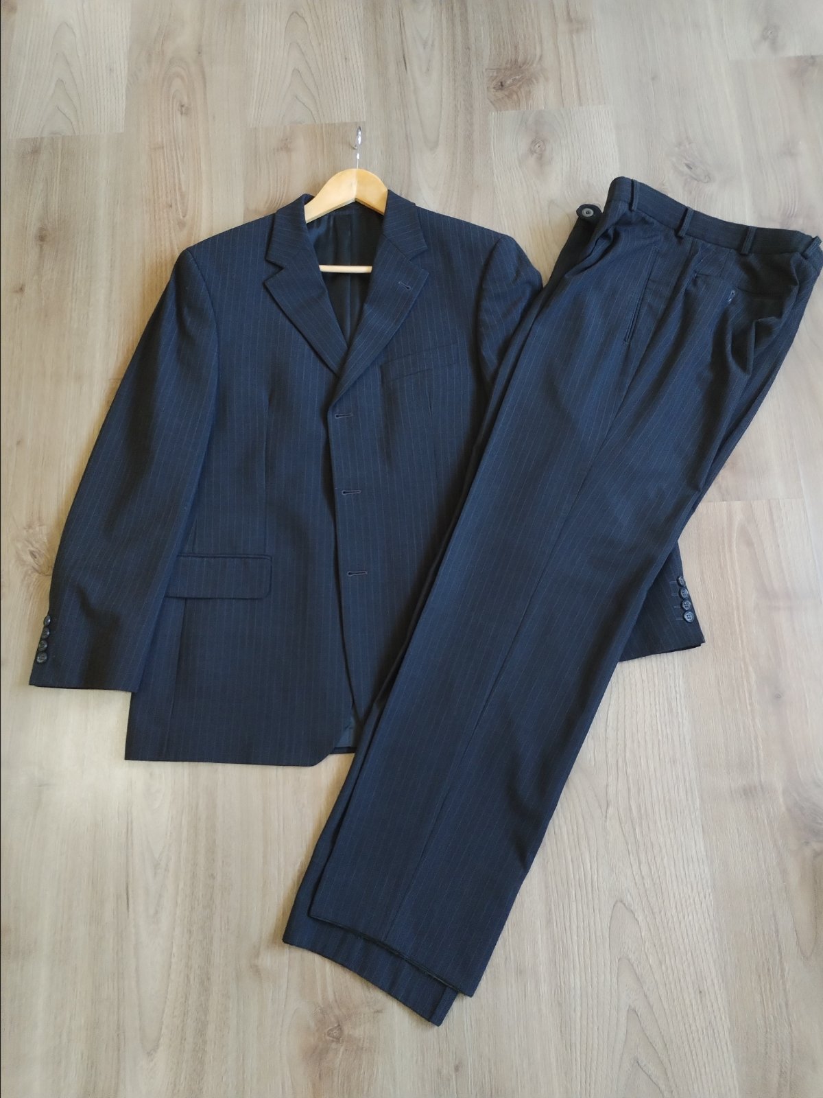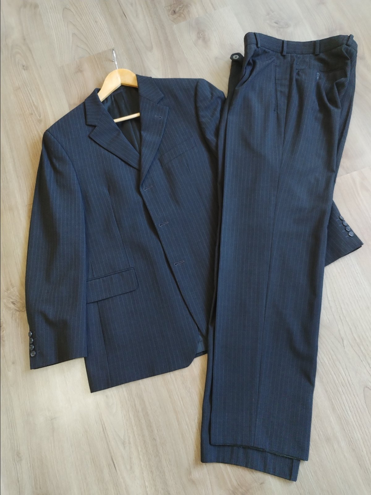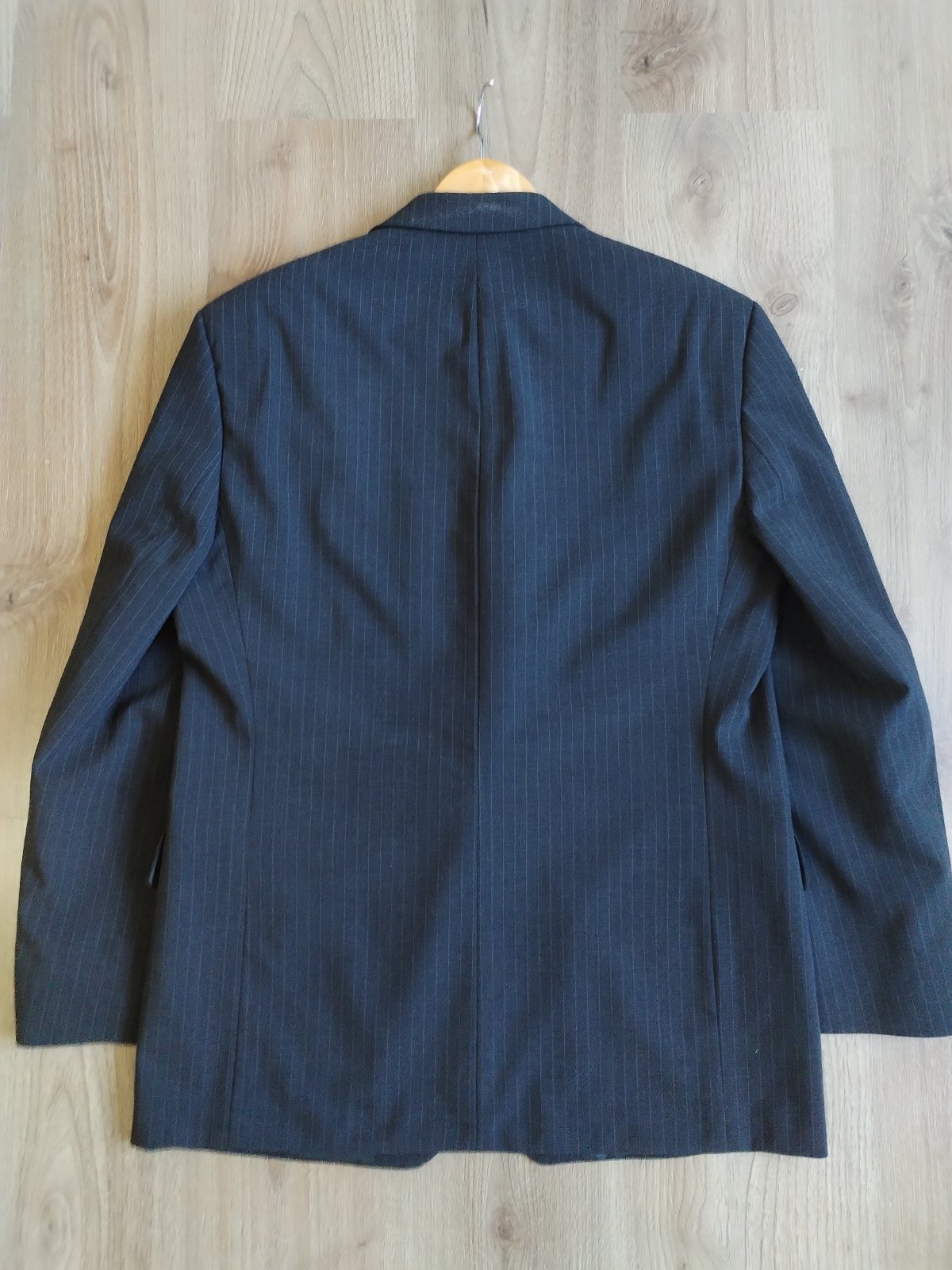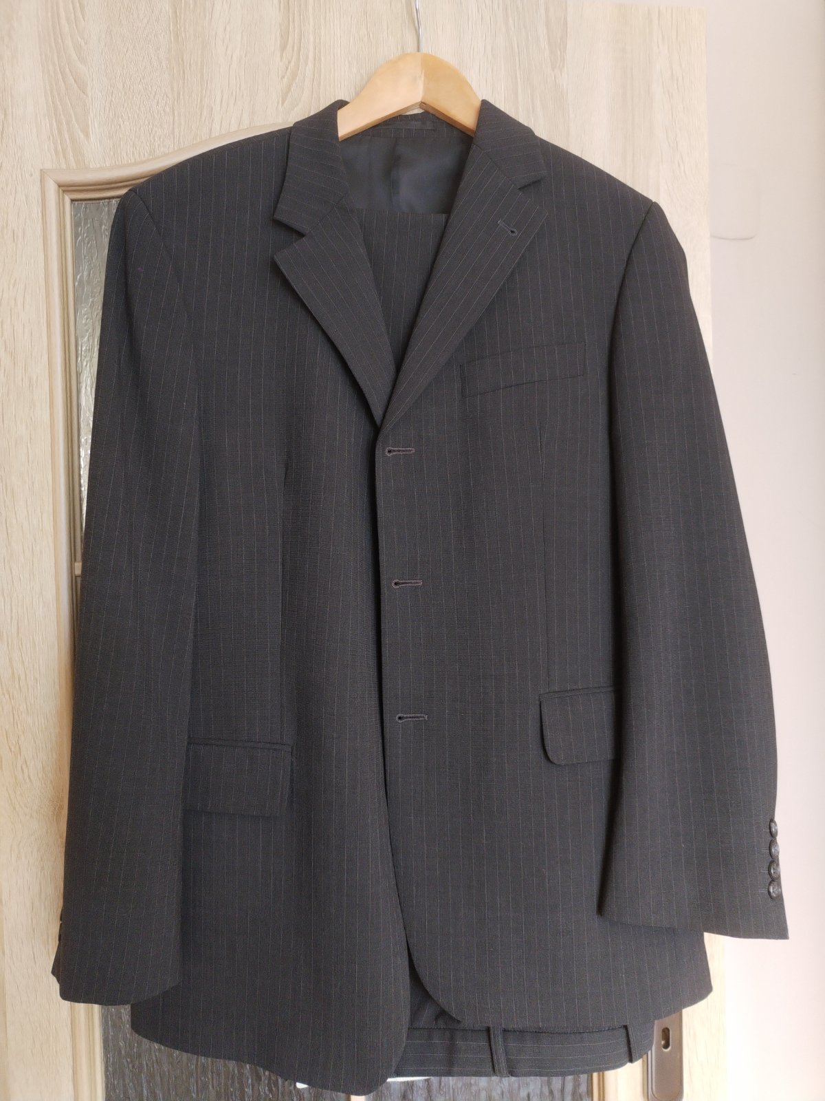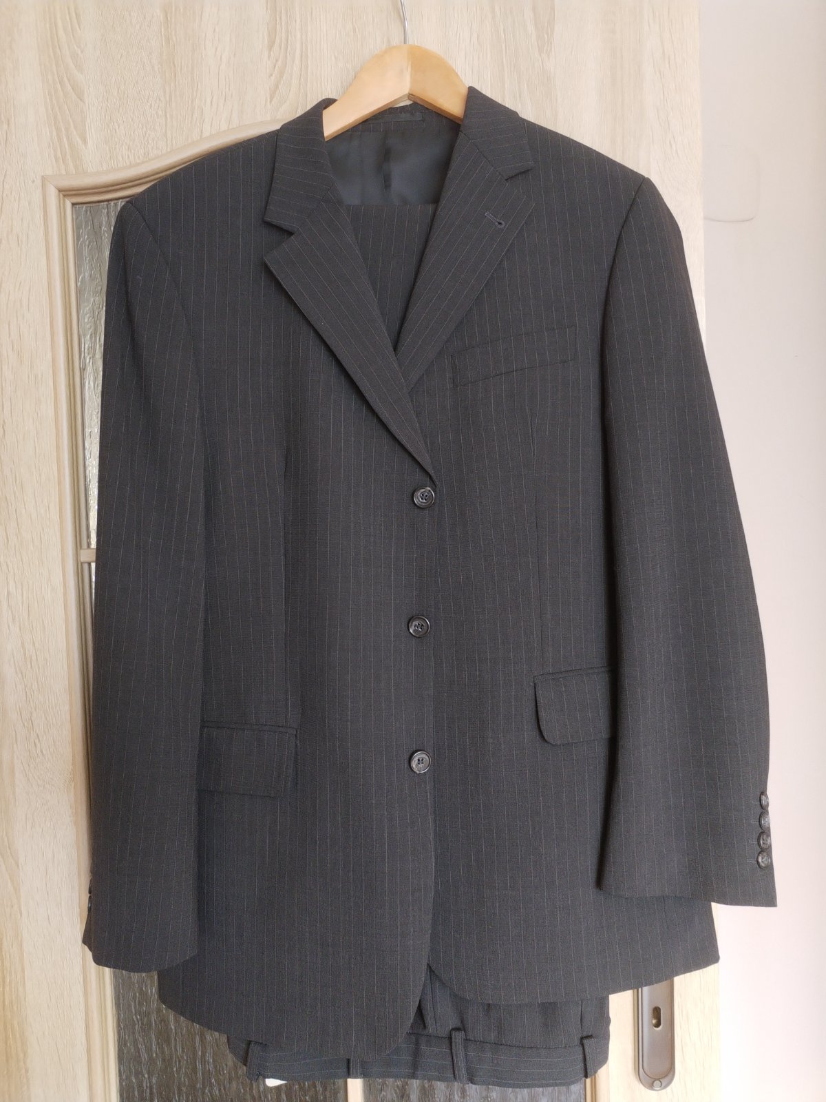 Kompletní pánský oblek kalhoty a sako. Sako rozměry prsa (průramky) 2x56 cm, pas 2x53 cm, délka 83 cm, rukáv od ramene 64 cm.