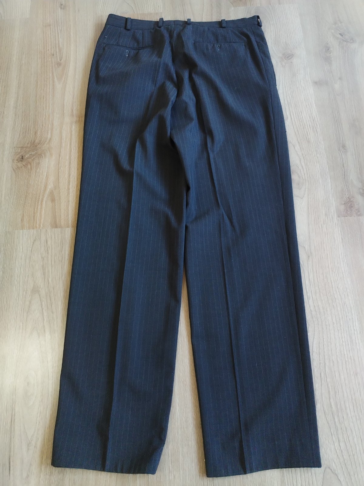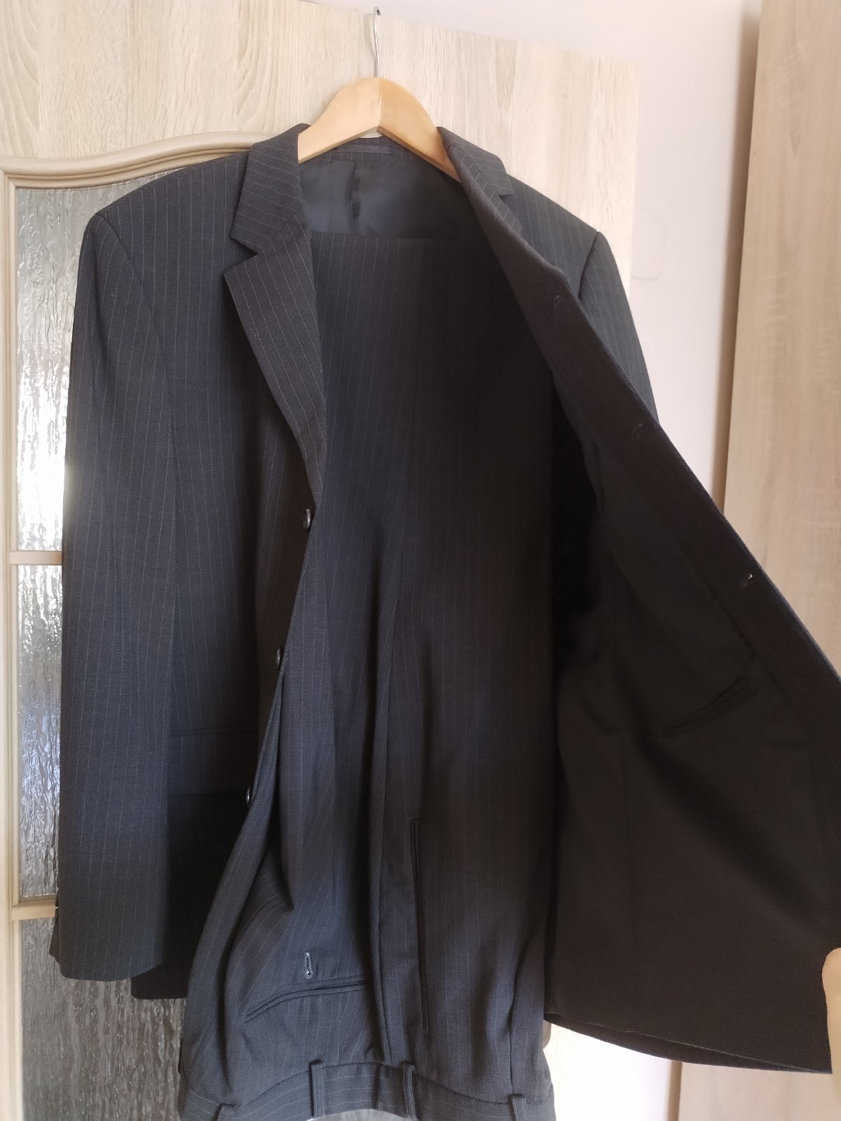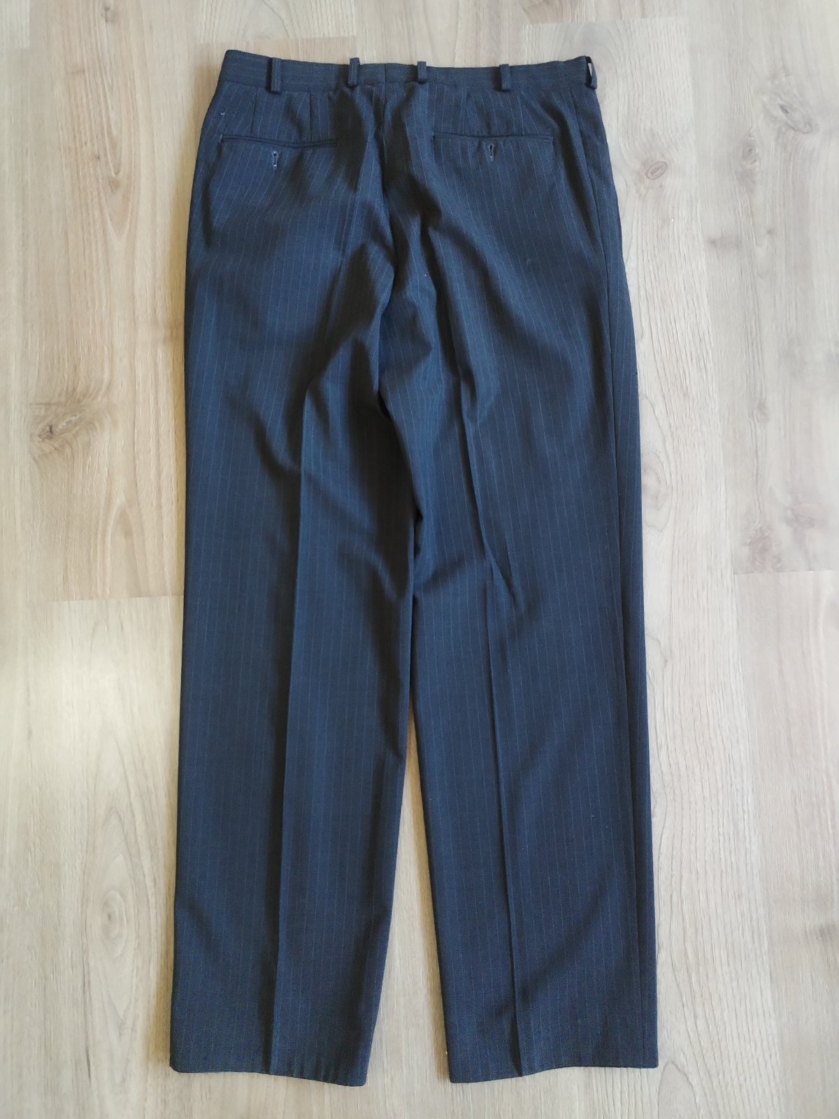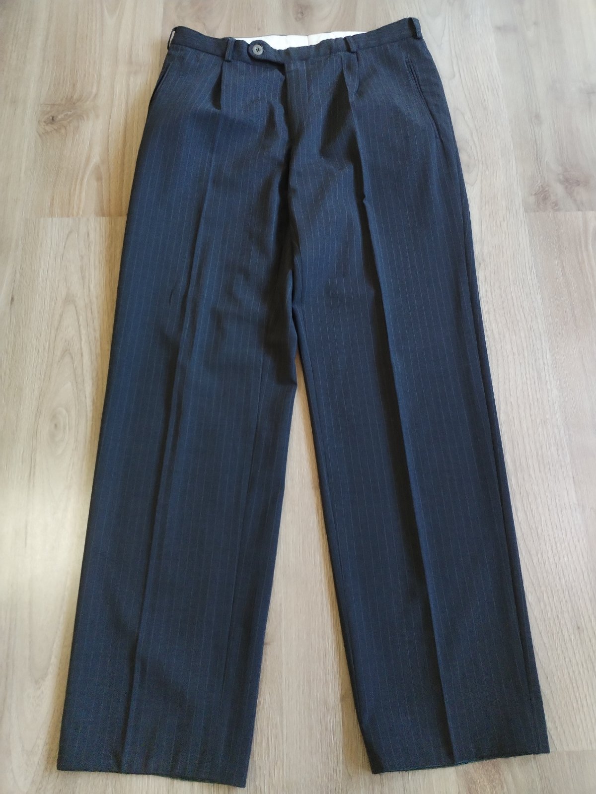 Kompletní pánský oblek kalhoty a sako. Sako rozměry prsa (průramky) 2x56 cm, pas 2x53 cm, délka 83 cm, rukáv od ramene 64 cm.