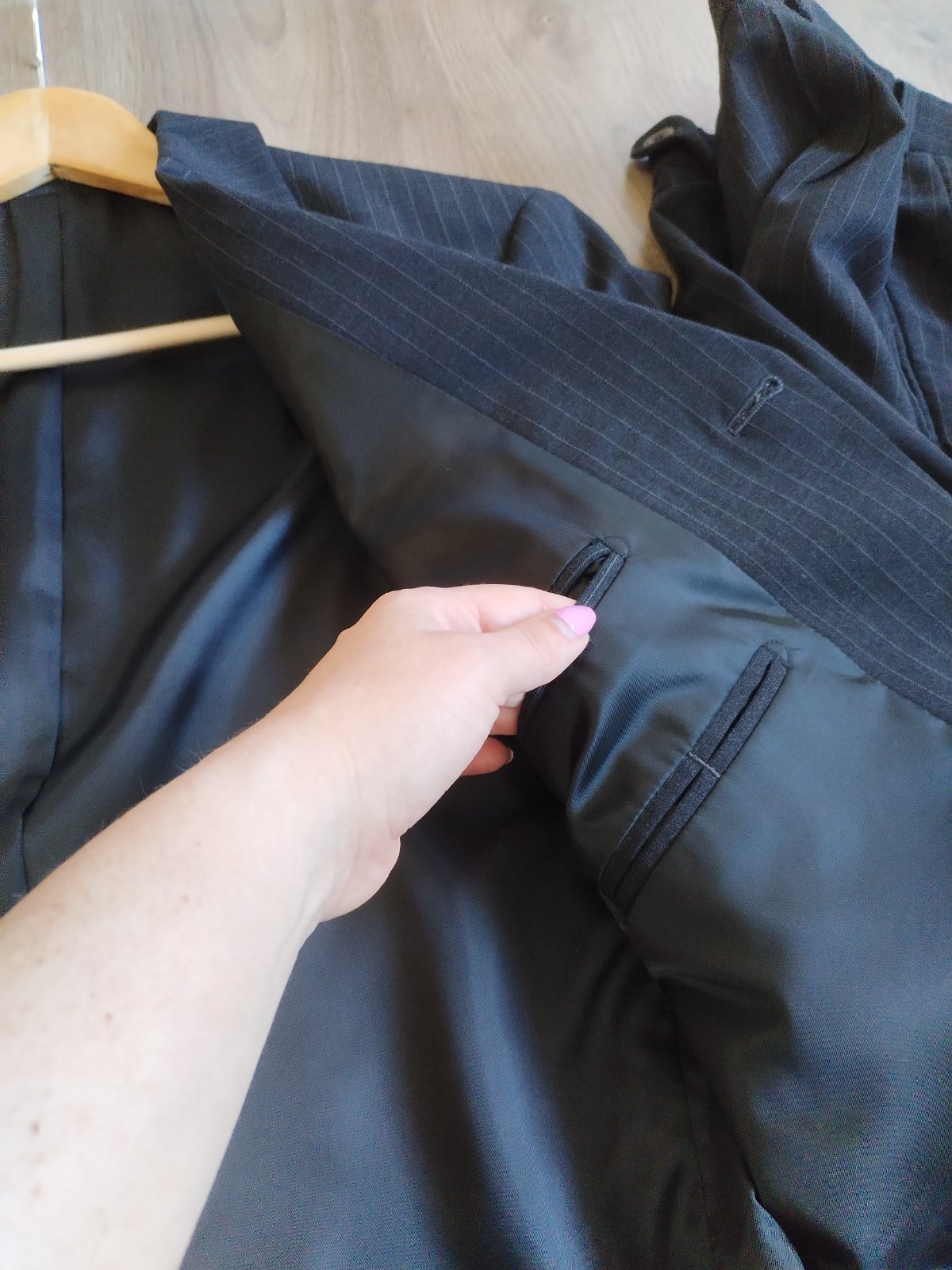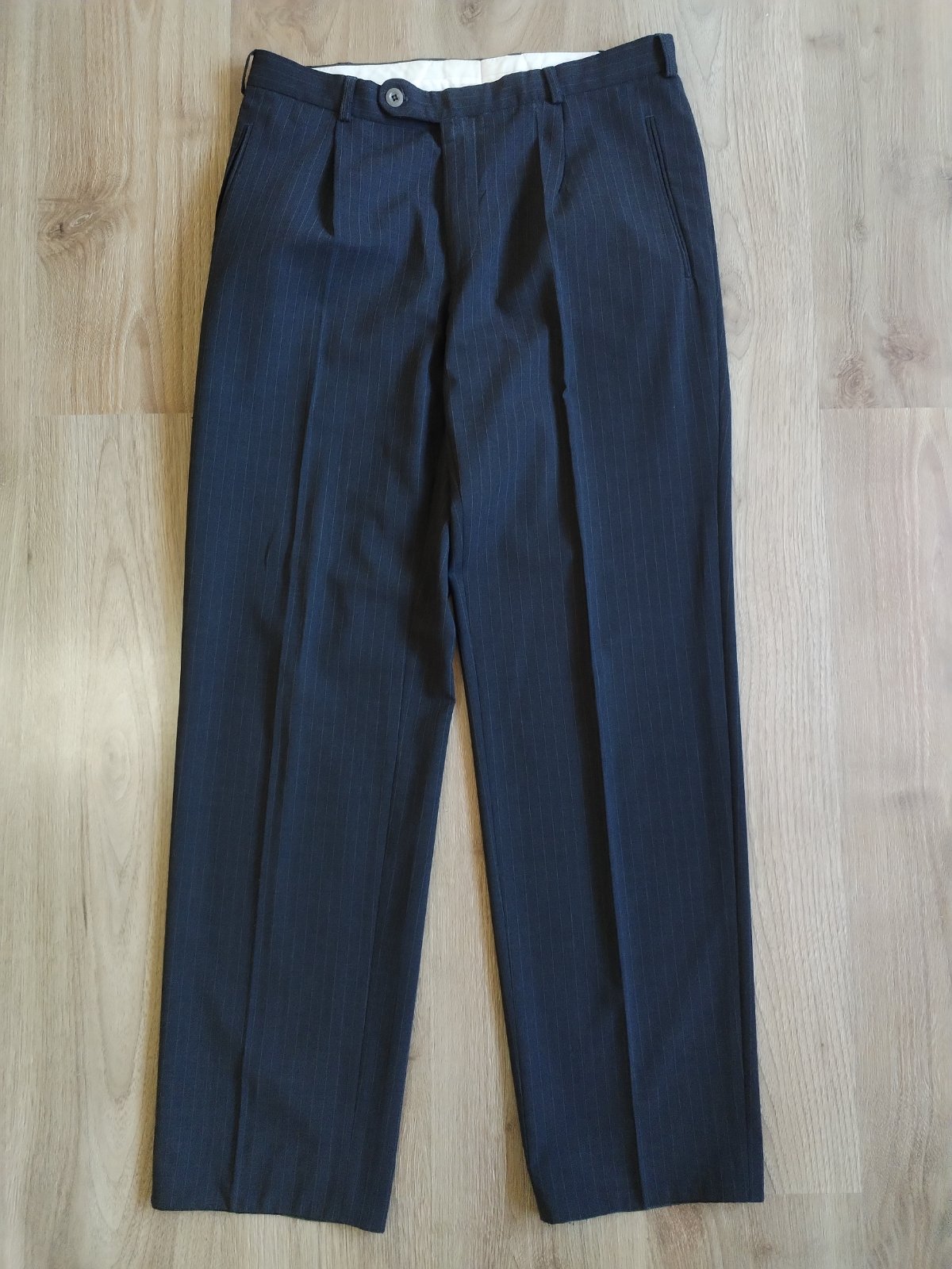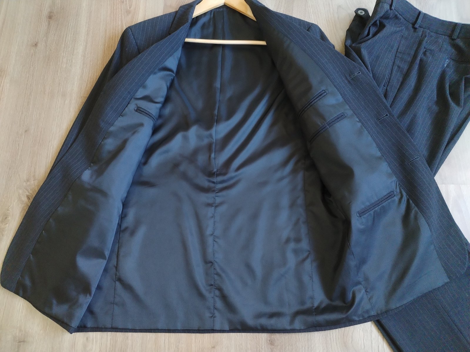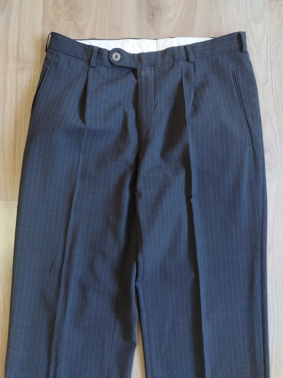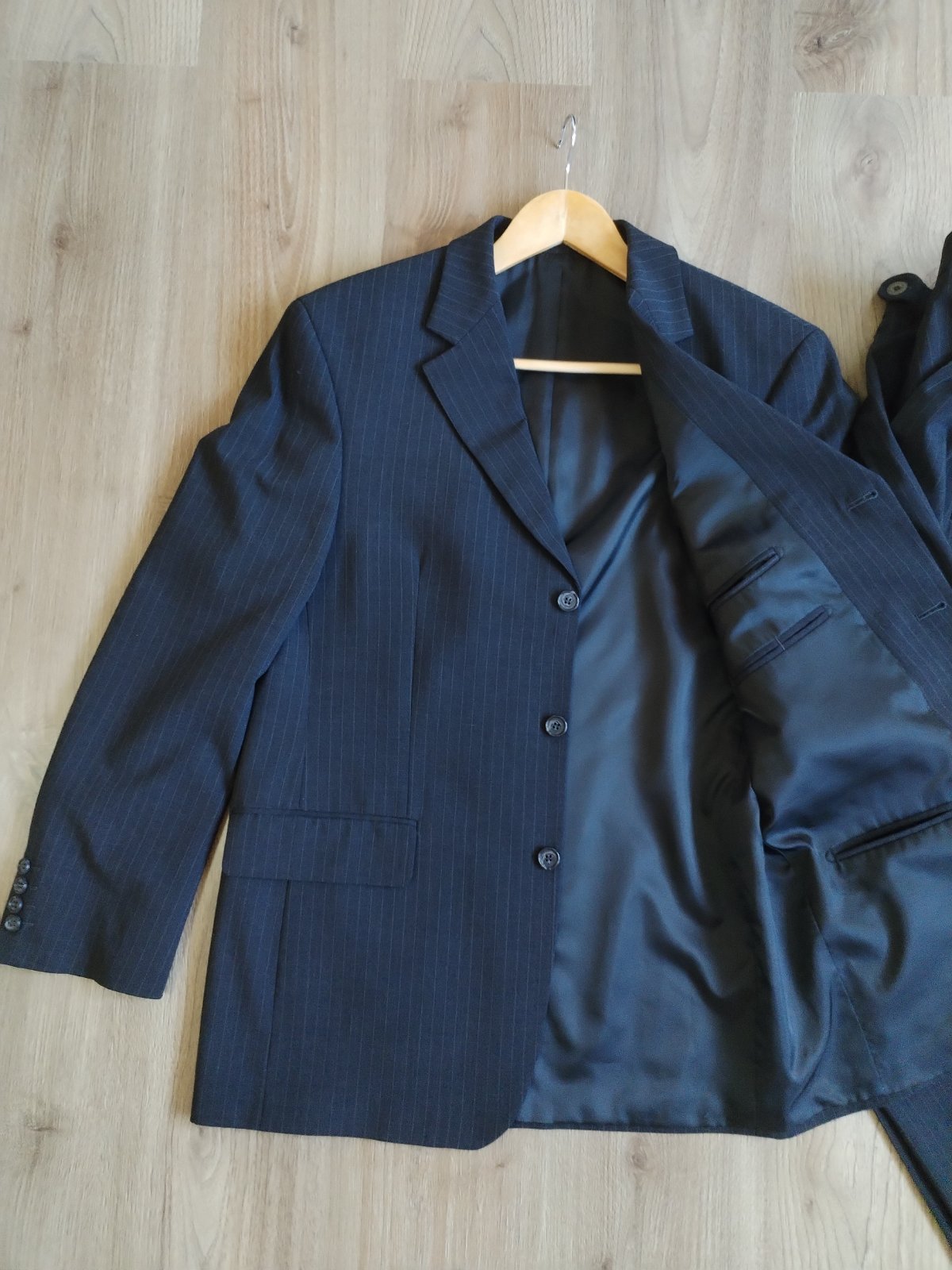 Kompletní pánský oblek kalhoty a sako. Sako rozměry prsa (průramky) 2x56 cm, pas 2x53 cm, délka 83 cm, rukáv od ramene 64 cm.