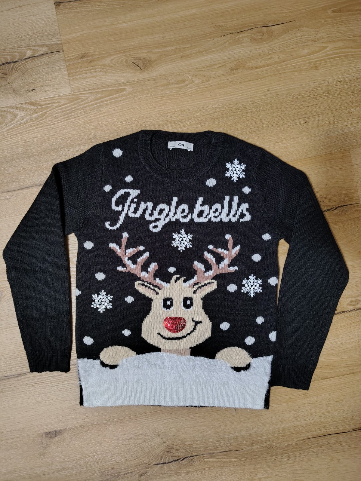Dívčí teplý vánoční svetr C&A 146/152 (11-12let) jingle bells se sobem, nos má vyšitý z červených flitrů, vločky vyšité z bílých flitrů a sníh je delší bílý chloupek. Krásně měkkoučký příjemný svetr.