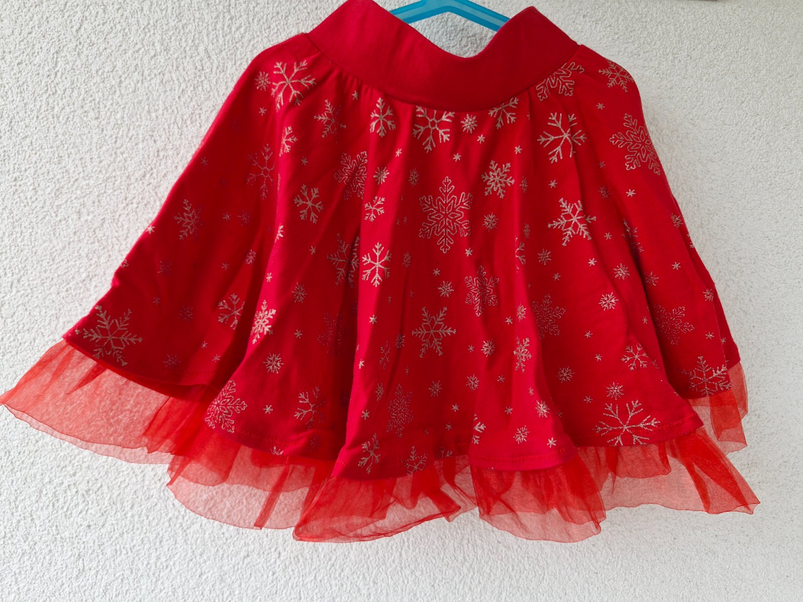 Mnou šitá kolová vánoční sukně se zlatými vločkami z teplákoviny, jedná se o originál. V pase na gumu, šíře 24,5 cm, celková délka i s volánem 40 cm.