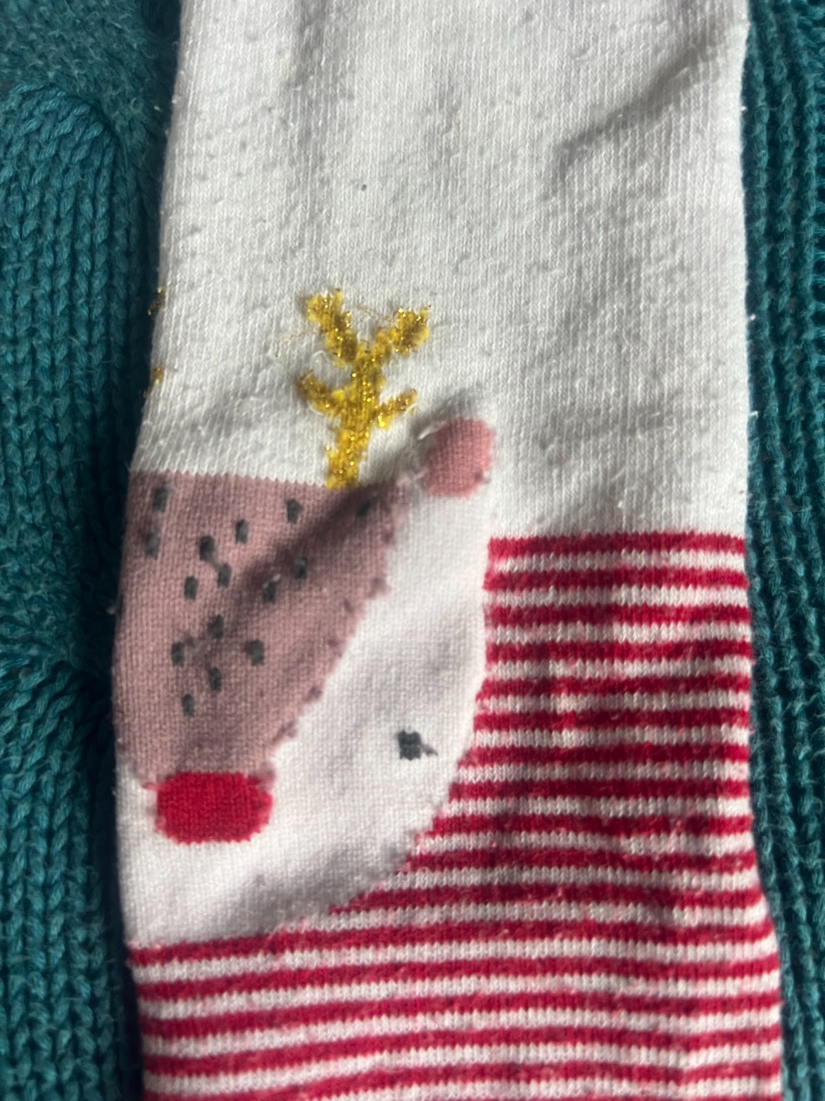 Po dvou dětech. Se zlatou nitkou. Sobík a punčochy mají prací žmolek a sukýnka je párkrát zatrhnutá.