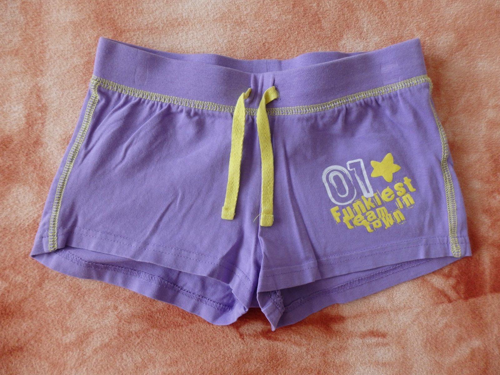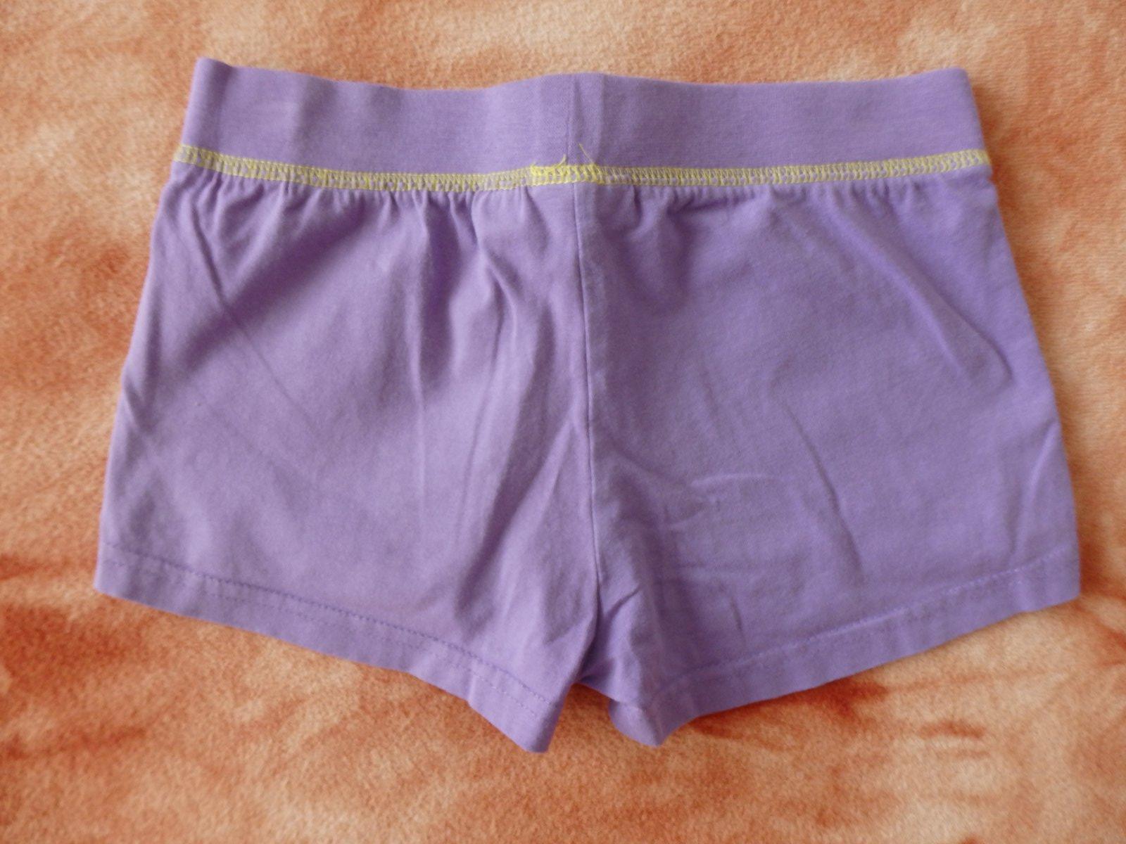 Pěkné fialové kraťasy s obrázkem, ozdobná tkanička v pase neslouží k utažení, velikost 122/128. Dobrý stav.