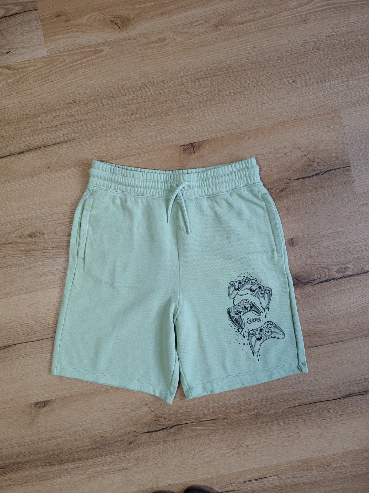 Chlapecké teplákové kraťasy H&M 158 (12 - 13 let) zelenkavé s obrázky ovladačů PlayStation, uvnitř chloupek.