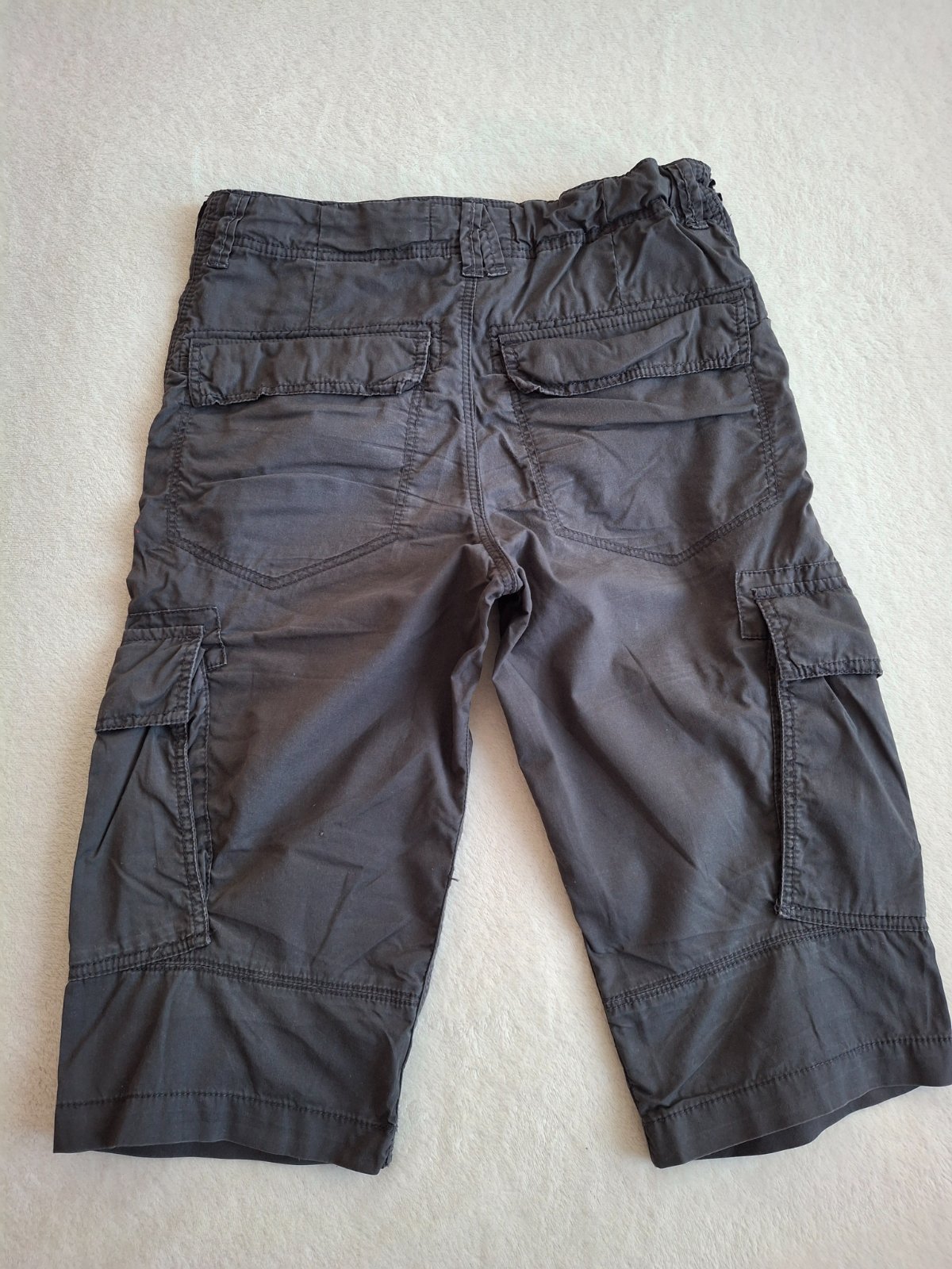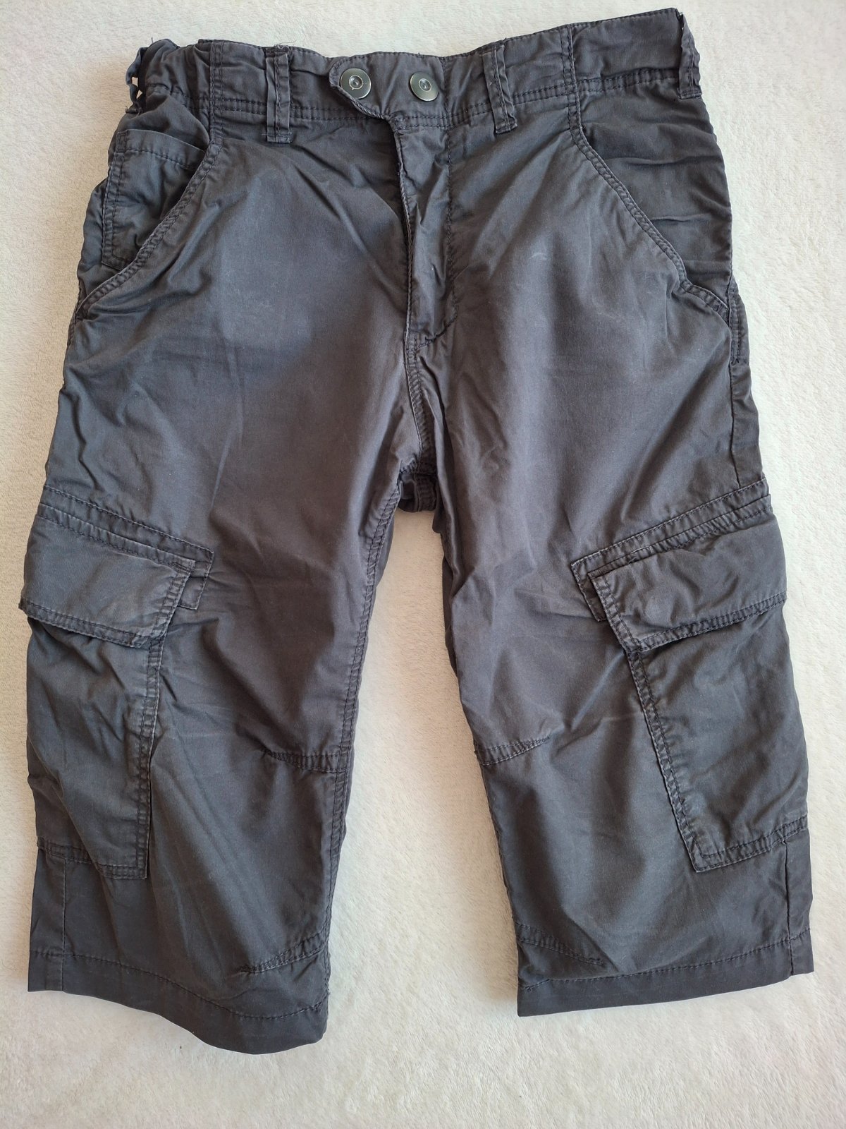 Nošené šedé chlapecké plátěné kraťasy, vel. 10-11 let. Jsou delší až na kolena. Délka 56,5 cm. V pase 2x32 cm. Možnost regulace.
