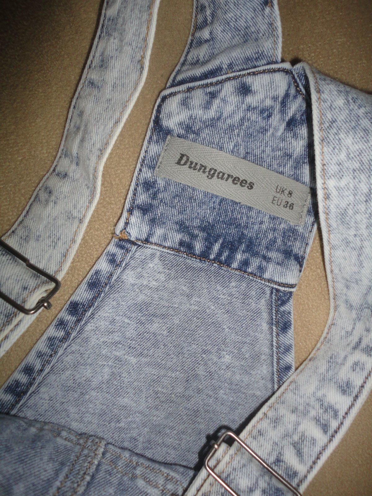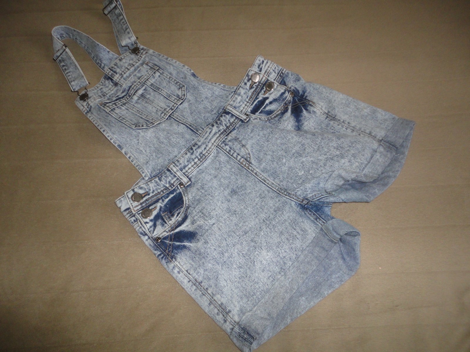 Pouze 1x prané, bavlněné, hezky šislé lacláče, regulace kšand, zdobně ohrnuté konce nohavic, boční kovové knoflíky na rozepínání, falešný poklopec, kapsy vpředu i vzadu, d. od náprsenky dolů 59, od pasu dolů 32cm, š. nohavice dole 30, pas 44,5cm, má být volný, celková výška s kšandami dle potřeby