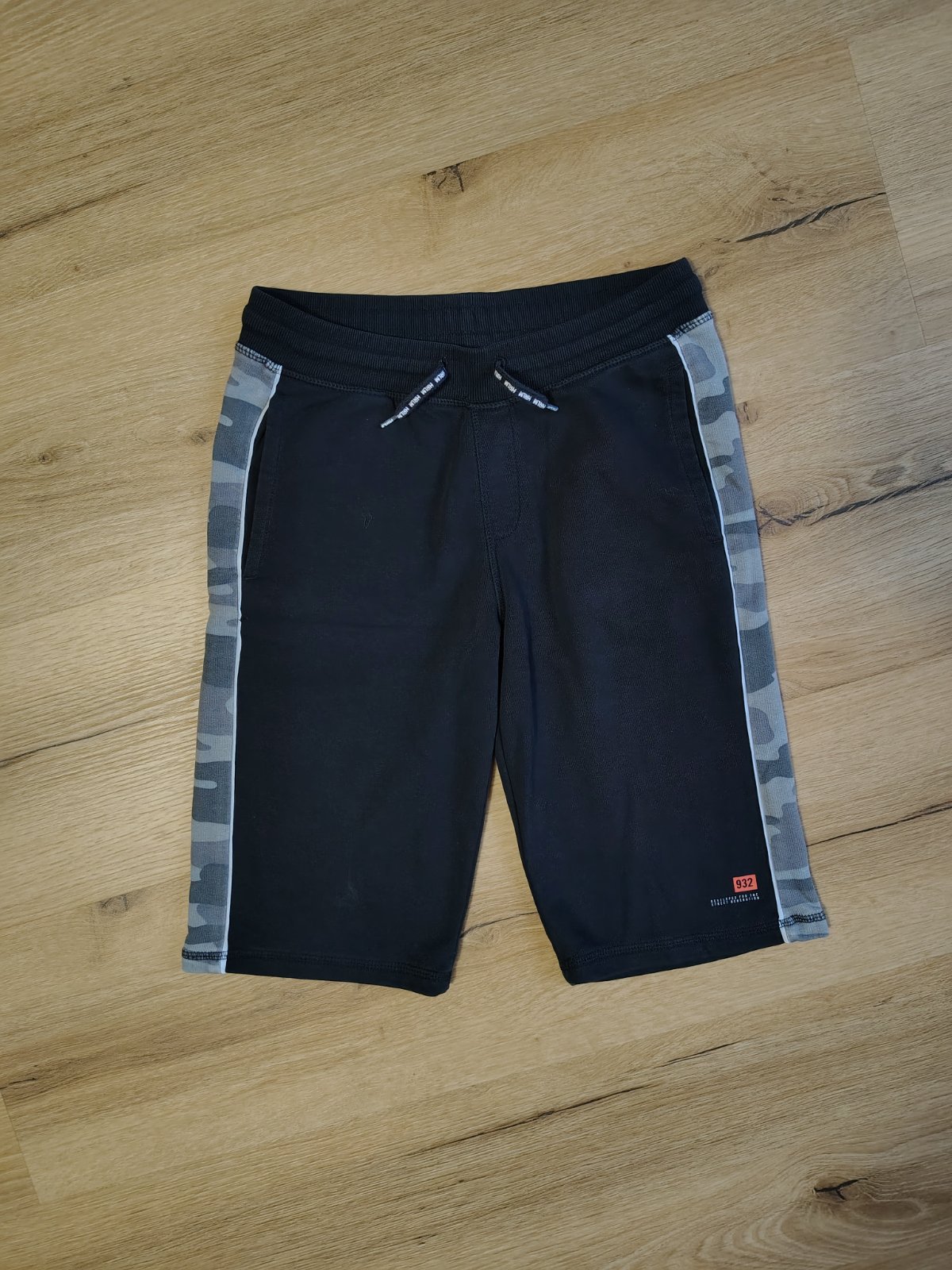 Chlapecké bavlněné teplákové kraťasy C&A 146/152 barva černá a zboku šedý maskáčový pruh, funkční šňůrka v pase, 2 funkční kapsy, uvnitř smyčka. Nabízím zvlášť triko stejné velikosti, které ladí ke kraťasům (stejná kolekce).