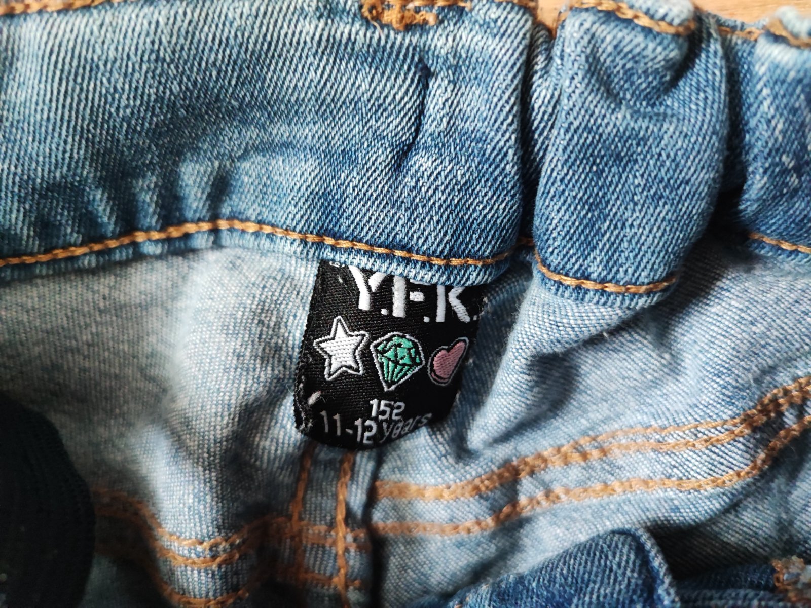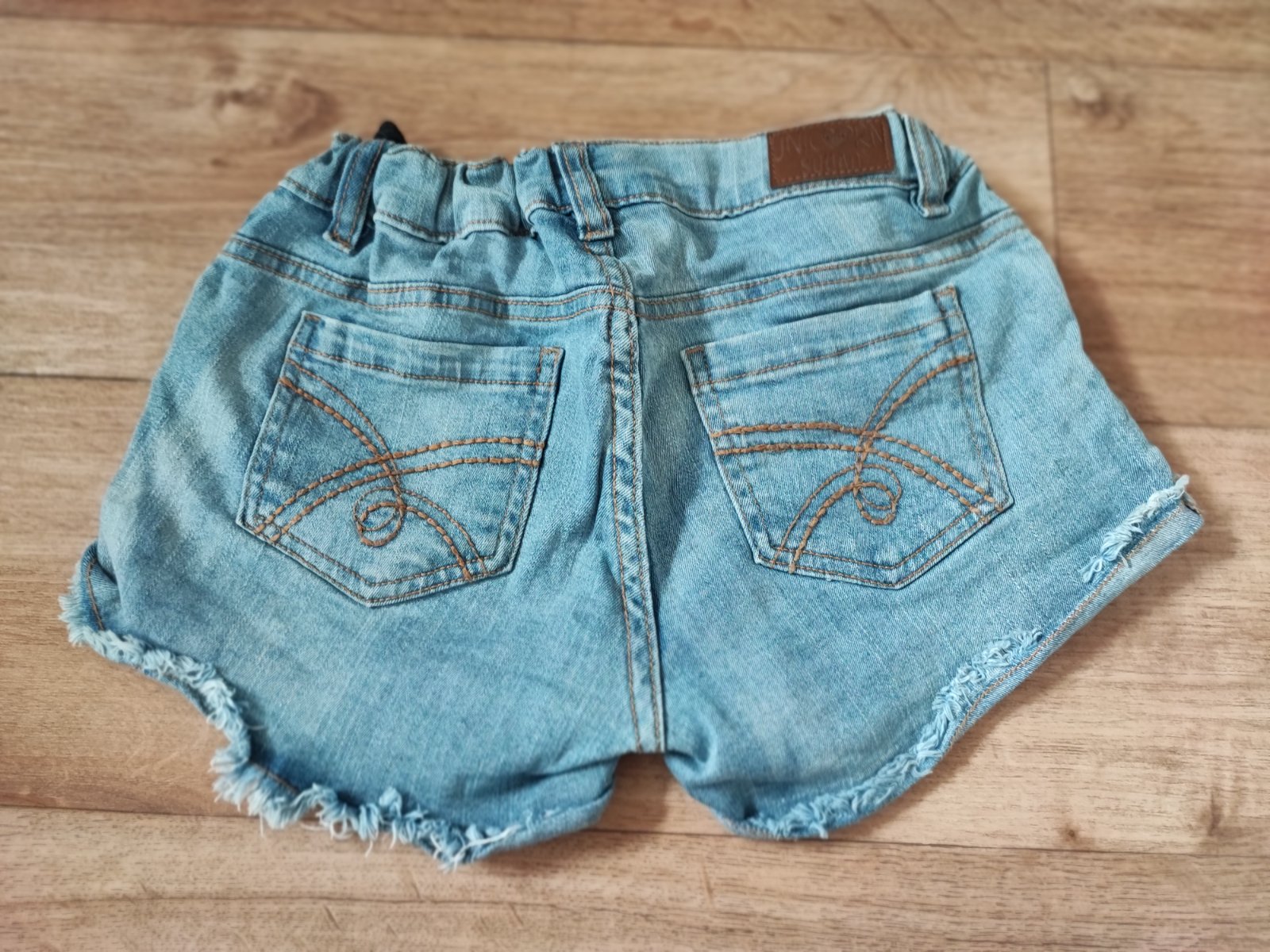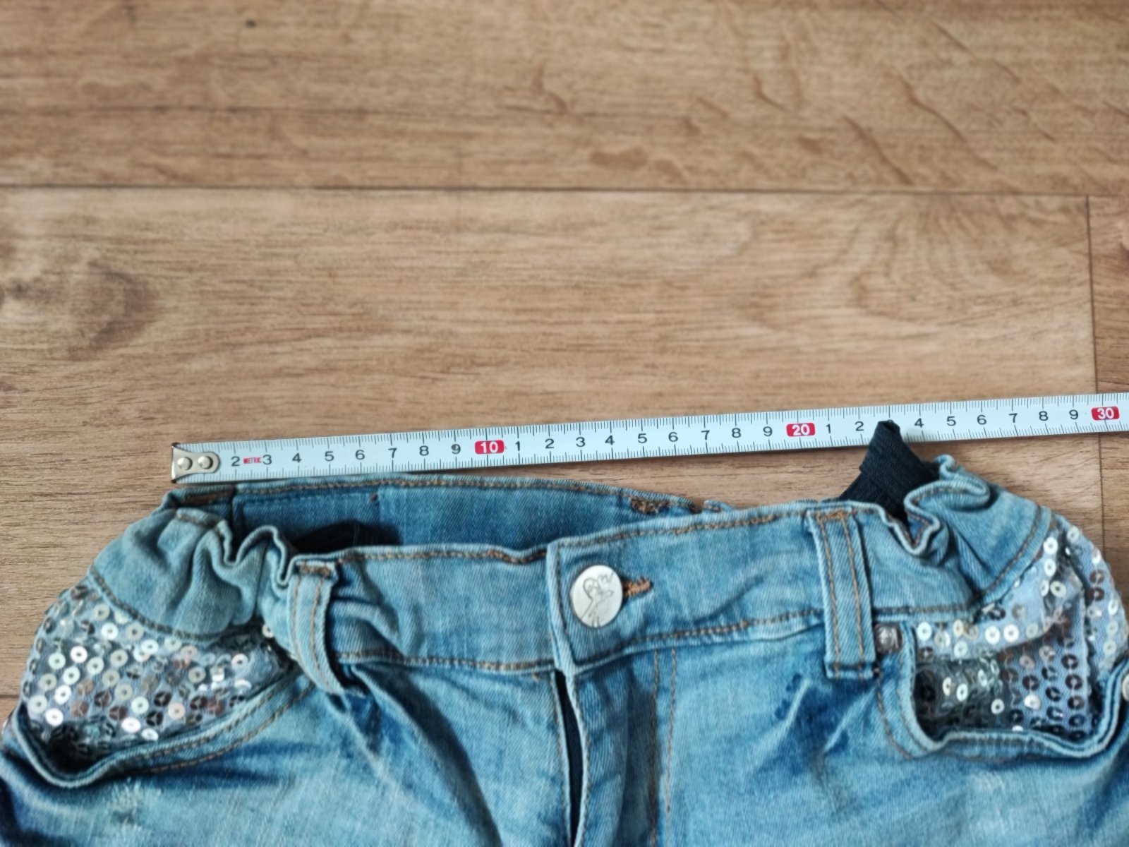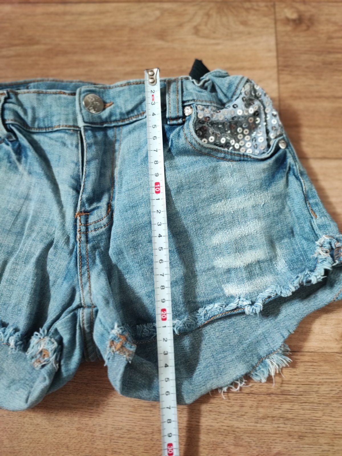 Džínové šortky s třpytivými aplikacemi na kapsách. Regulace v pase (na fotce staženo a lze prodloužit). Velikost 152 (11-12 let).