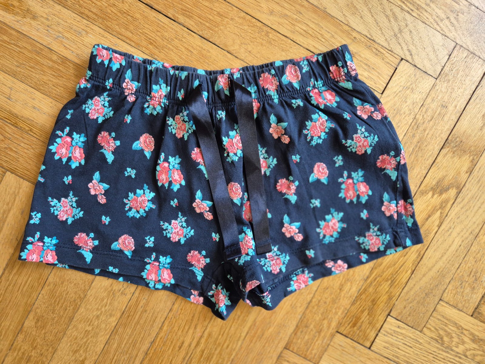 Barva tmavě modrá, v pase ozdobná stužka (nedá se stáhnout), bez vad