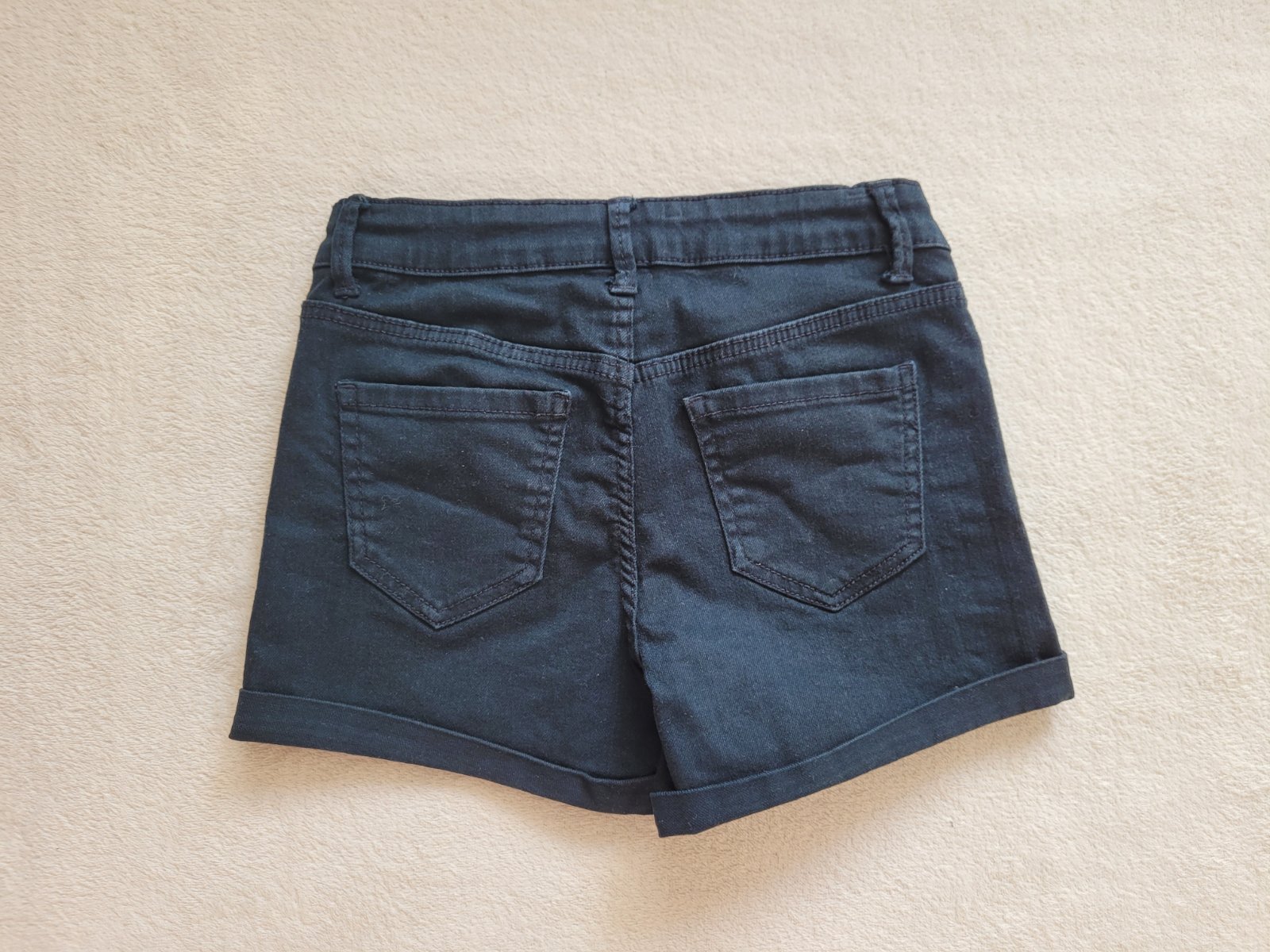 Džínové šortky černé barvy (barva sytější než na fotce) koupené v C&A, regulace v pase, zapínání na zip a knoflík, 3 přední kapsy, 2 zadní kapsy, poutka na pásek.