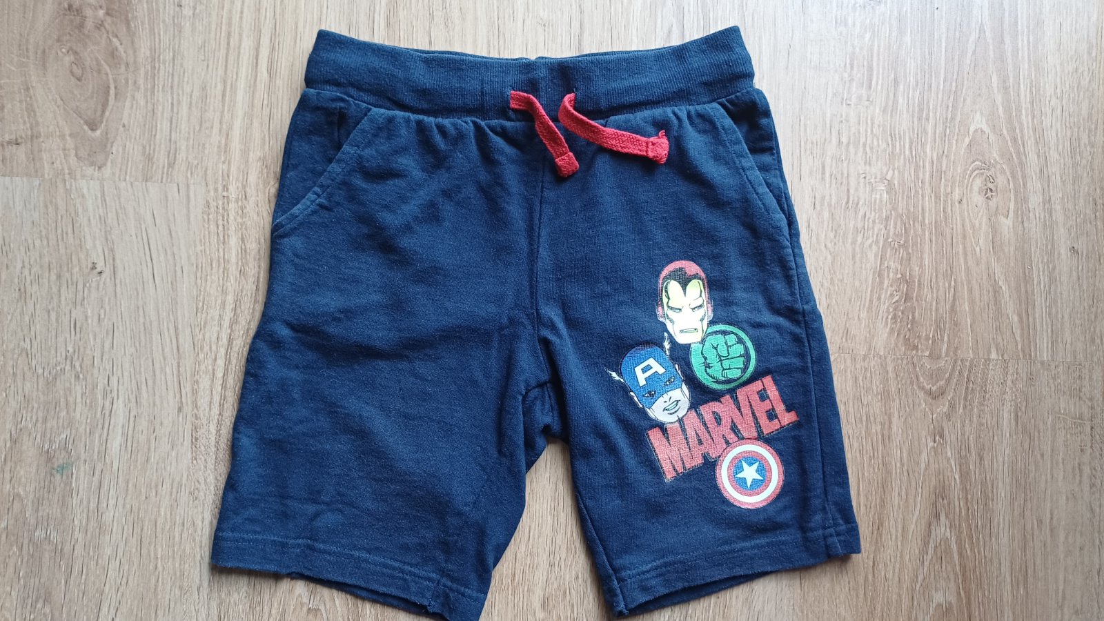 Bavlnene, tmave modre kratasy. Praci chloupek a sisly obrazek. Bez der, fleku. Na litacku urcite poslouzi paradne. Tkanicka funkcni. Pas v klidu 26, delka 33.