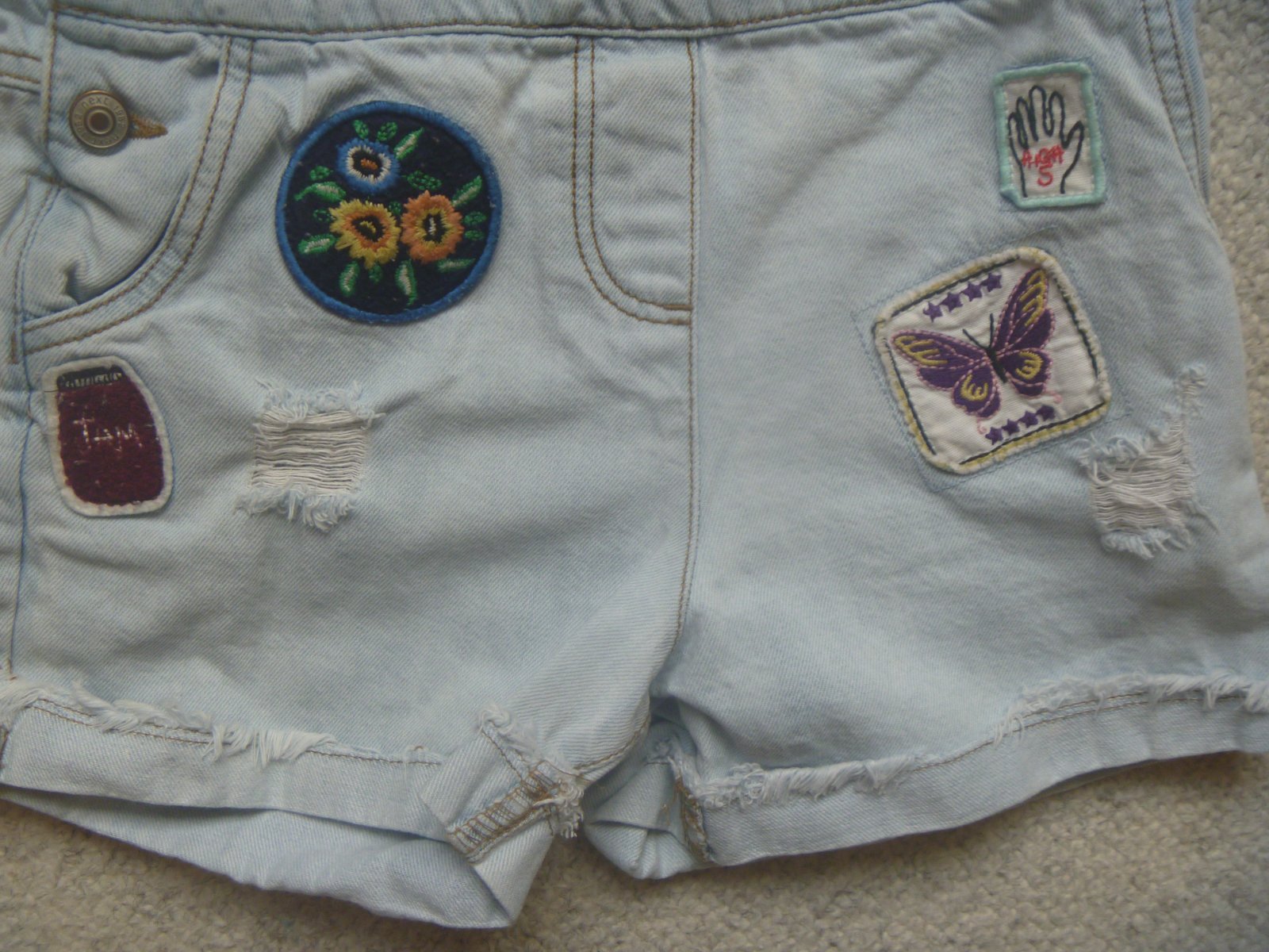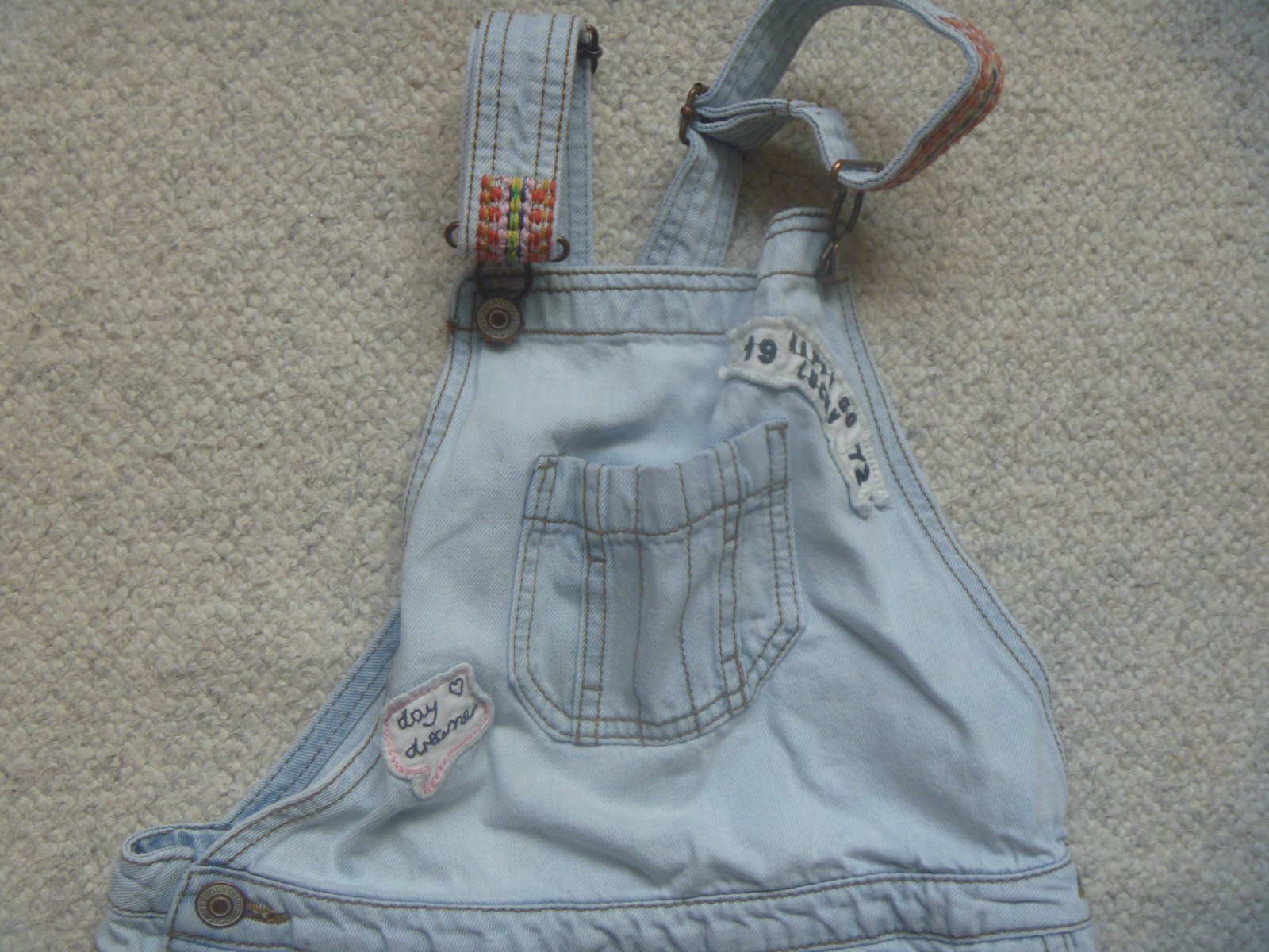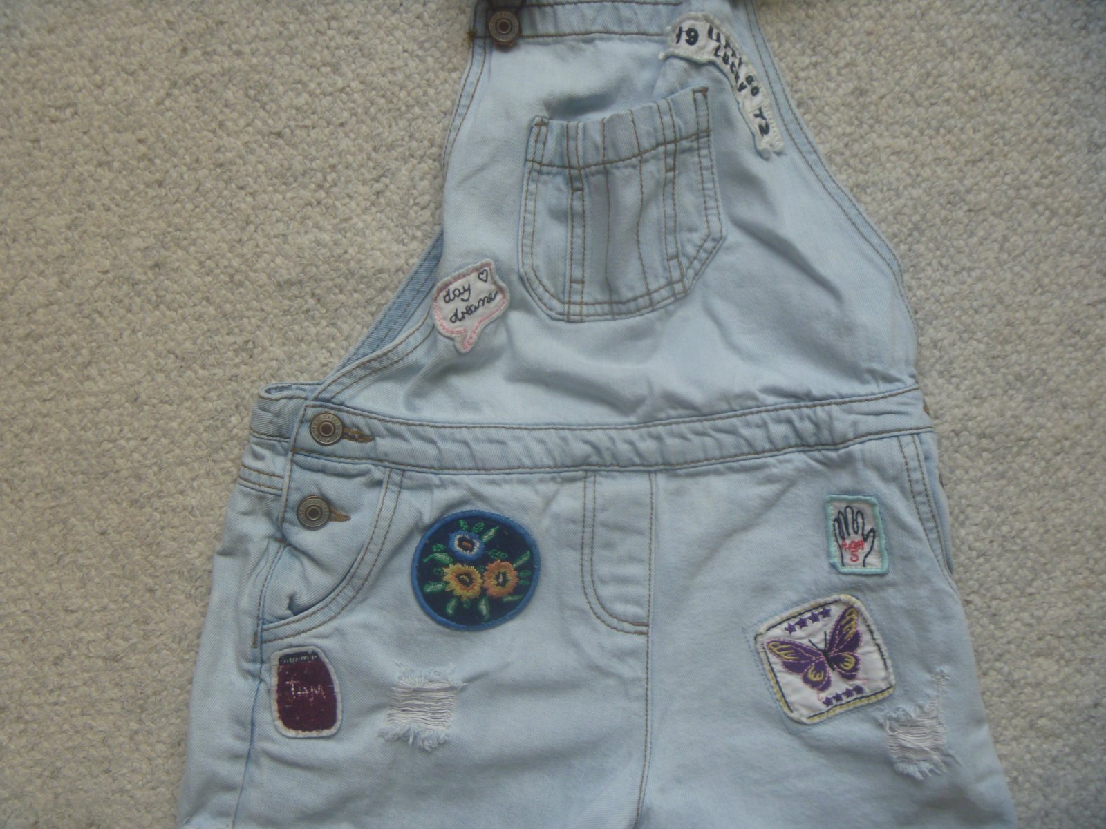 Prodám světlé riflové kraťasy s laclem, s aplikací kytičky, nastavitelné kšandy, na bocích po dvou knoflících, s kapsami vpředu i vzadu, značka Next, velikost 134 (9 let), materiál 100% bavlna, ve velmi dobrém stavu.