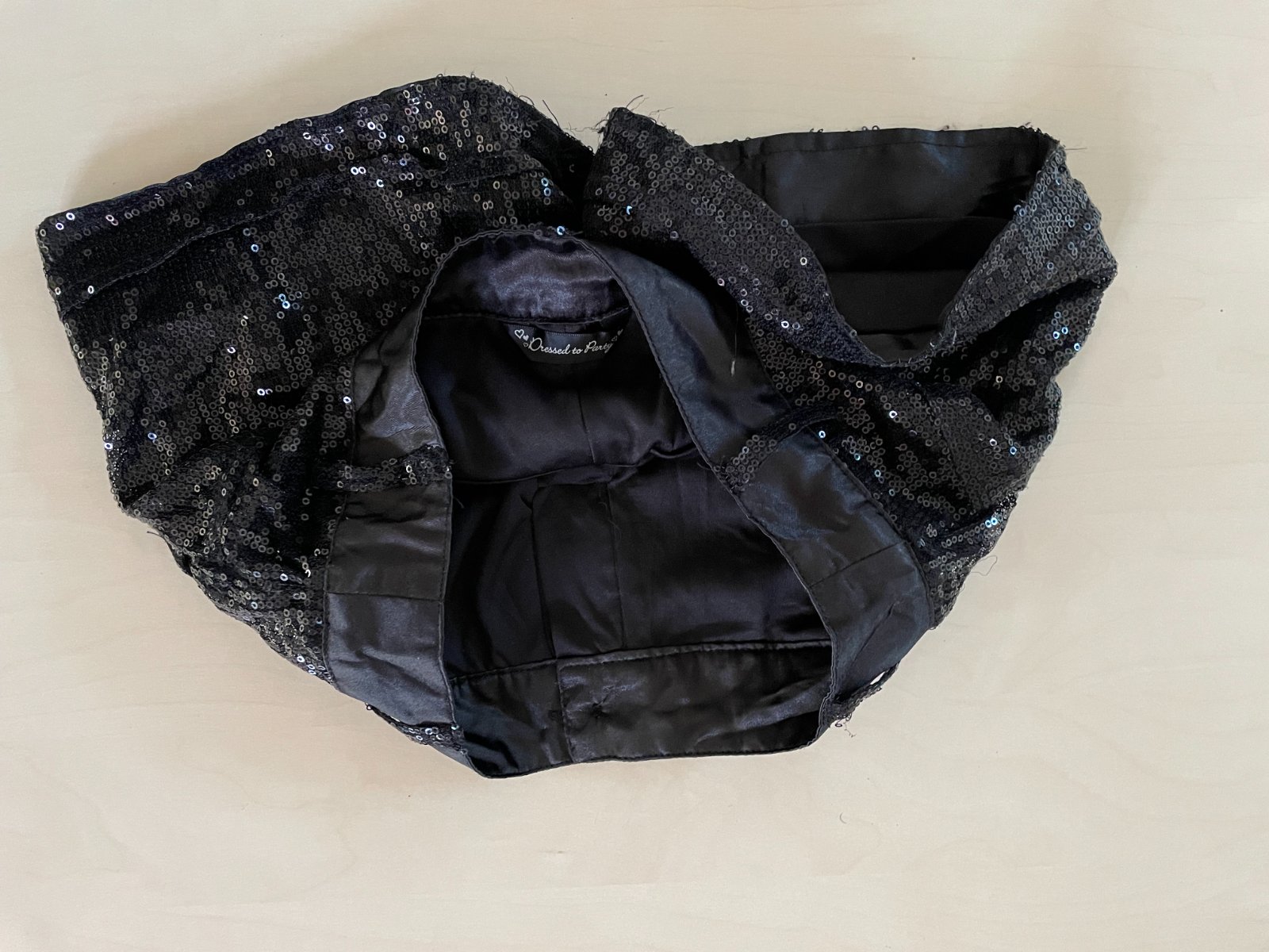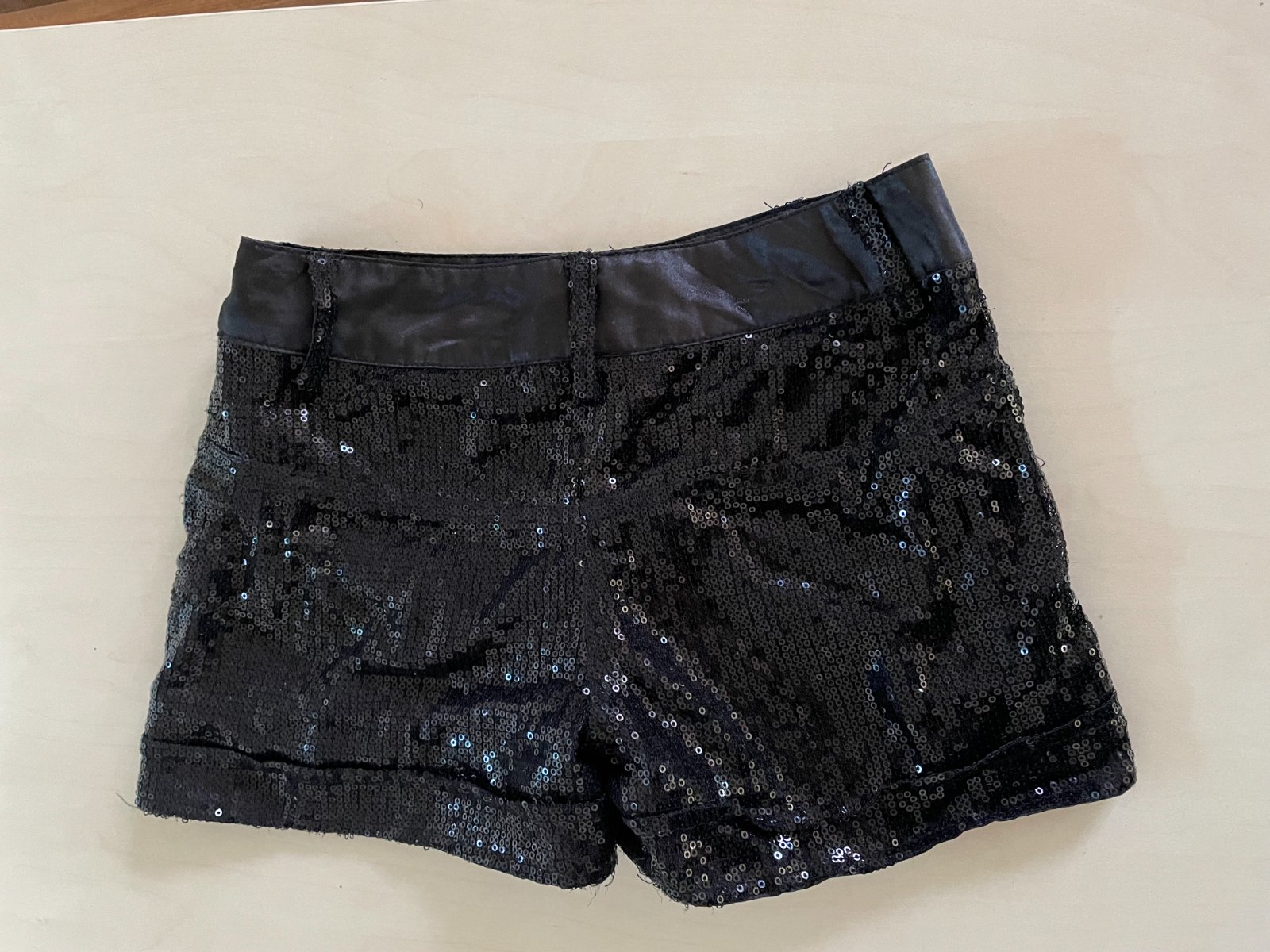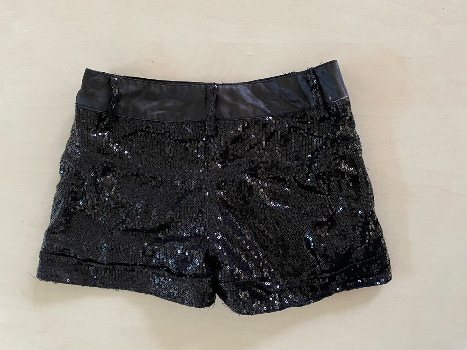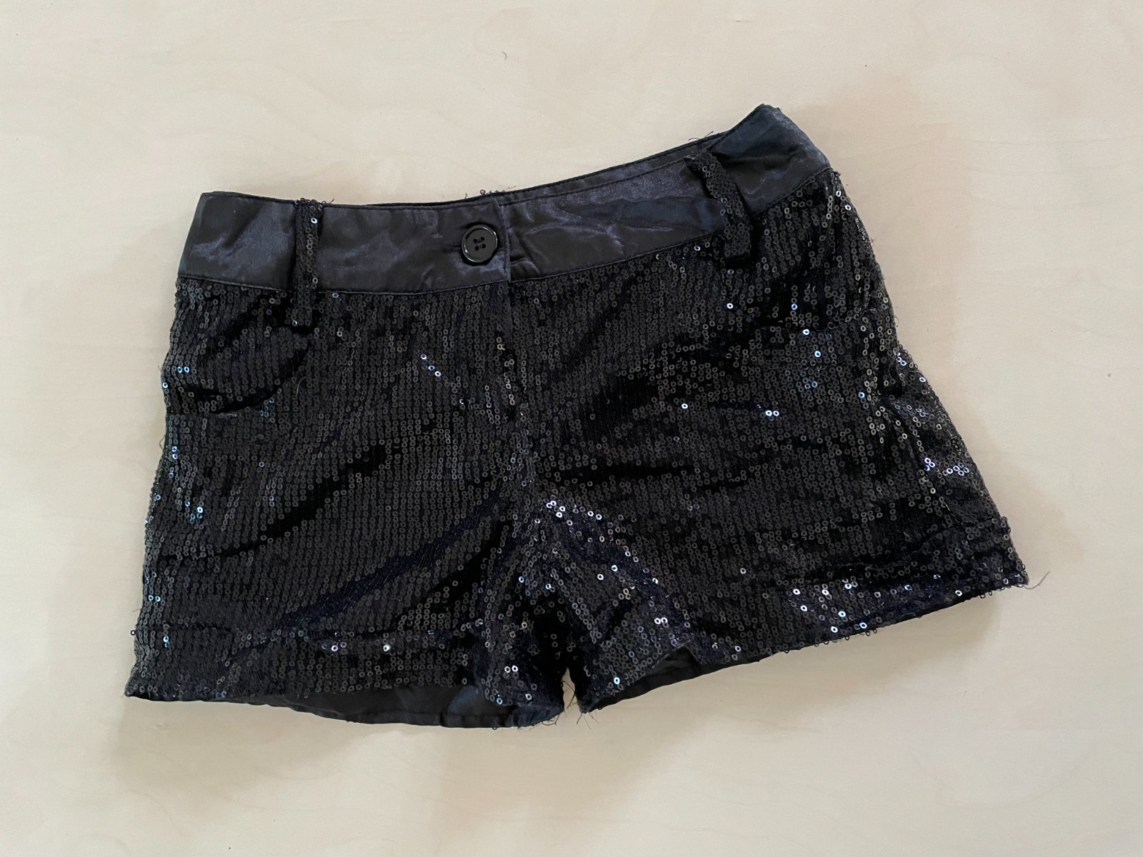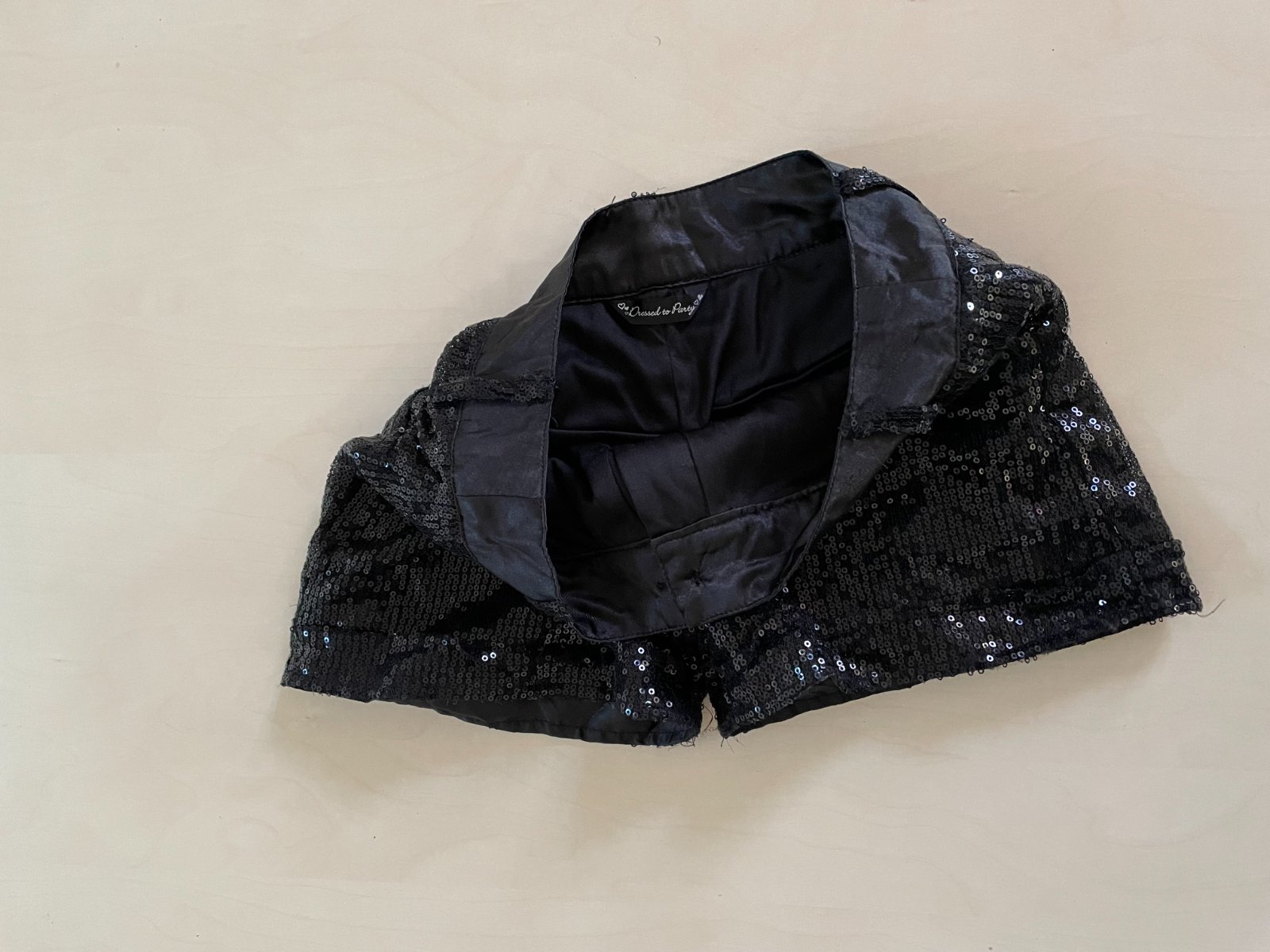 hol. nabízím k prodeji tyto černé kraťásky s flitry, vel 10/11 let, Dressed to Party. Pas lesklý jako silonový satén, spodní látka umělá , příjemná podšívka. Na vrchu další vrstva síť s lesklými černými flitry. Nošené, nějaké flitříky mohou chybět, občas nějhaká nitka, ale nic rušivého, jsou stále krásné
