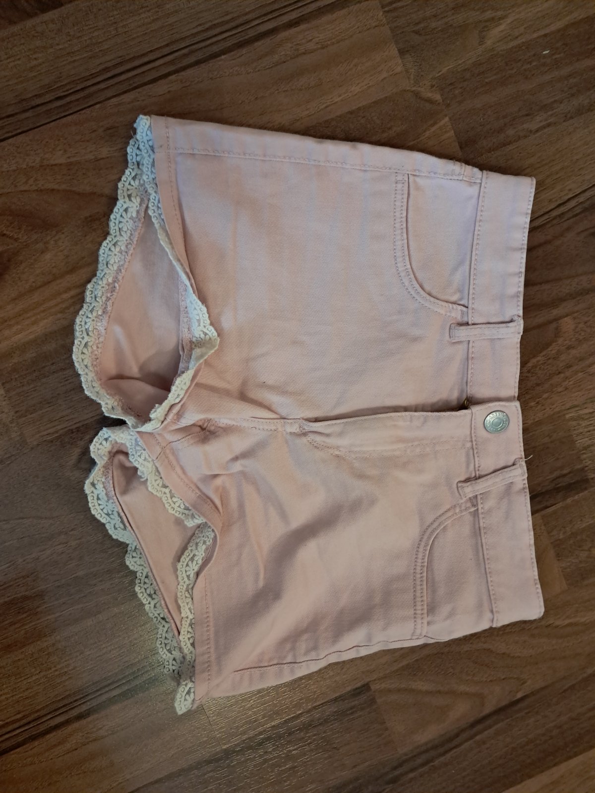 Dívčí strečové riflové kraťasy H&M 140 (9-10 let) světle růžové a kolem nohavice krajka. V pase na regulaci. Top stav jen po dceři.