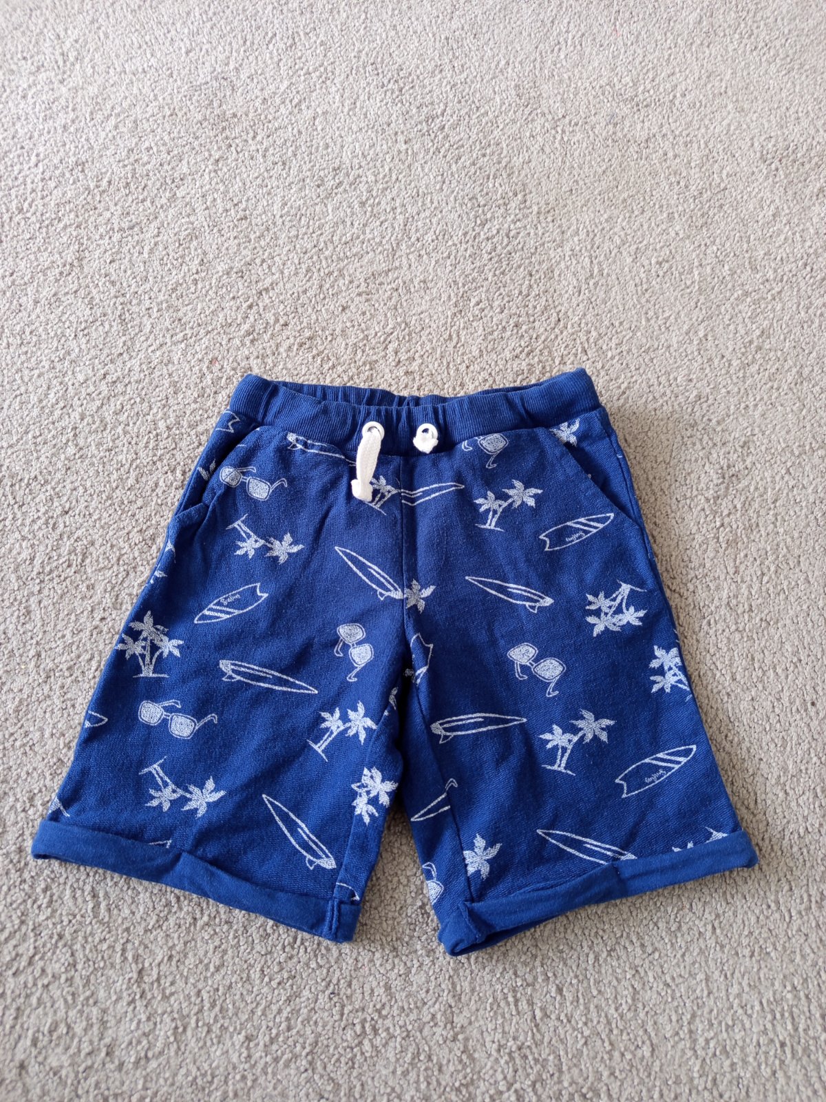 Tmavě modré šortky z tenčí bavlny. V pase na gumu. Velikost 110/116 V pase šířka bez natažení 26 cm.