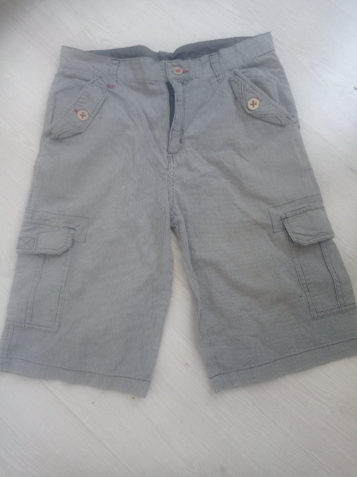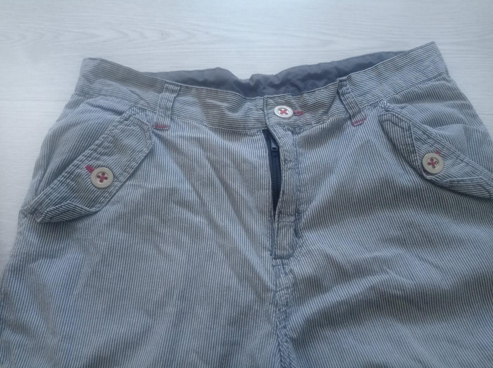 Proužkované kraťasy tříčtvrťáky vel 146_152,moc pěkné,pás knoflík pevný kapsy normální i boky délka 56cn,pás 39cm.
