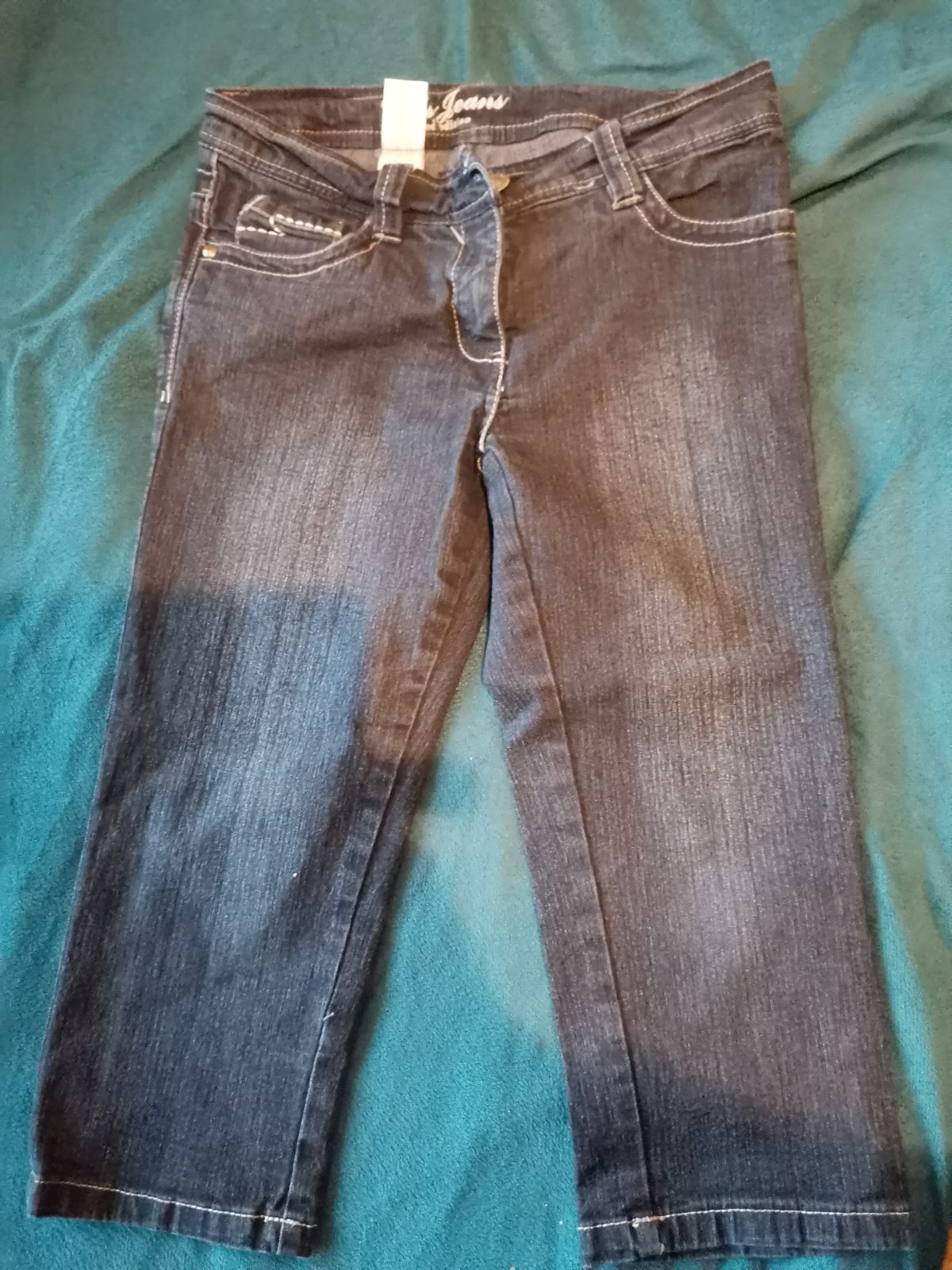 džínové 3/4 kalhoty, téměř nenošené, bez vad, složení 98% bavlna, 2% elastan, pruží rozměry: šířka 2x 32, délka 56, rozparek 3 cm :-)