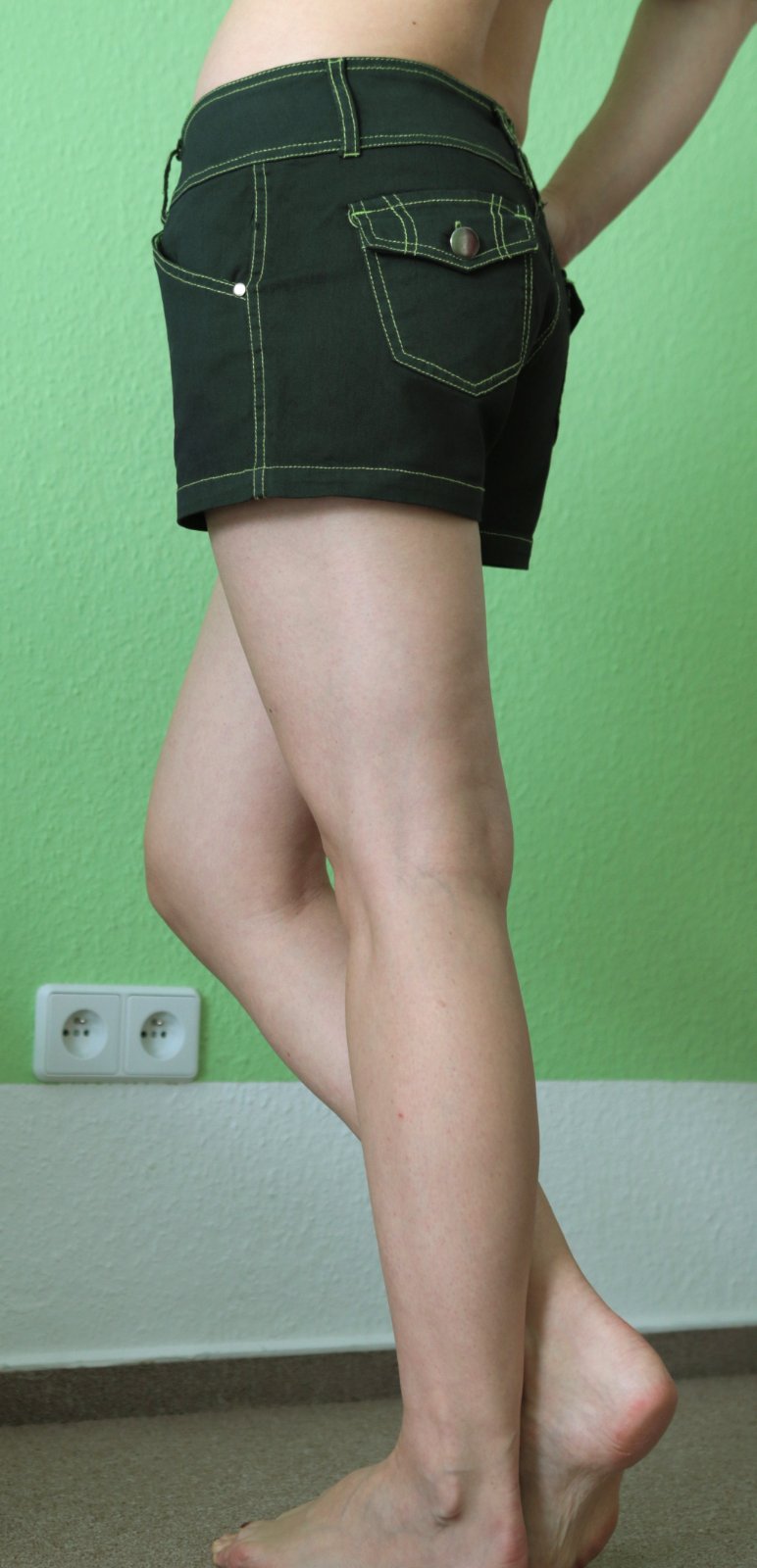 Kraťasy z elastické džínoviny, původně neonově zelené, obarvené na černo, s tím, že zelené zůstaly detaily - prošití, vnitřek kapes, zip atd. Kraťasy nemají žádnou vadu, nošené byly minimálně, jsou v perfektním stavu. Je možné že budou při praní pouštět, případně můžou lehce vyblednout a prostoupí zelená barva. Velikost značena L odpovídá, rozměry: pas 82 cm, boky 100 cm, přední sed 22 cm, zadní sed 33 cm, délka kalhot od pasu 28 cm. Odeslání poštou, Balíkovnou nebo Zásilkovnou, cenu za odeslání sdělím předem.