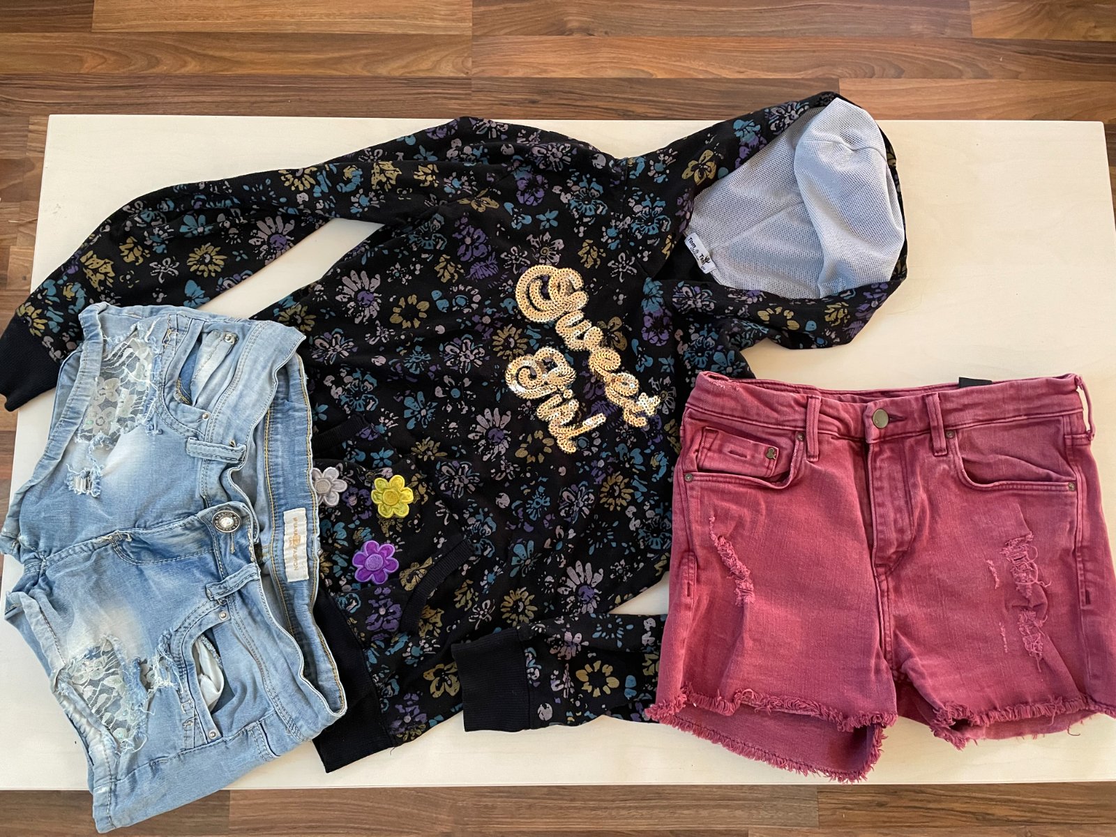 hol. nabízím k prodeji tento set 3 kousků. Věci nošené, vliv praní a u modrých je krajka a struktura dření protrhlá, na několika místech dření, zapadá to ve vzhledu. Vínové a mikča nošené a vliv praní. Vše viz fota, myslím ještě poslouží. Velikosti nejsou uvedené (jen na mikče S/M), dcera měla kolem S.