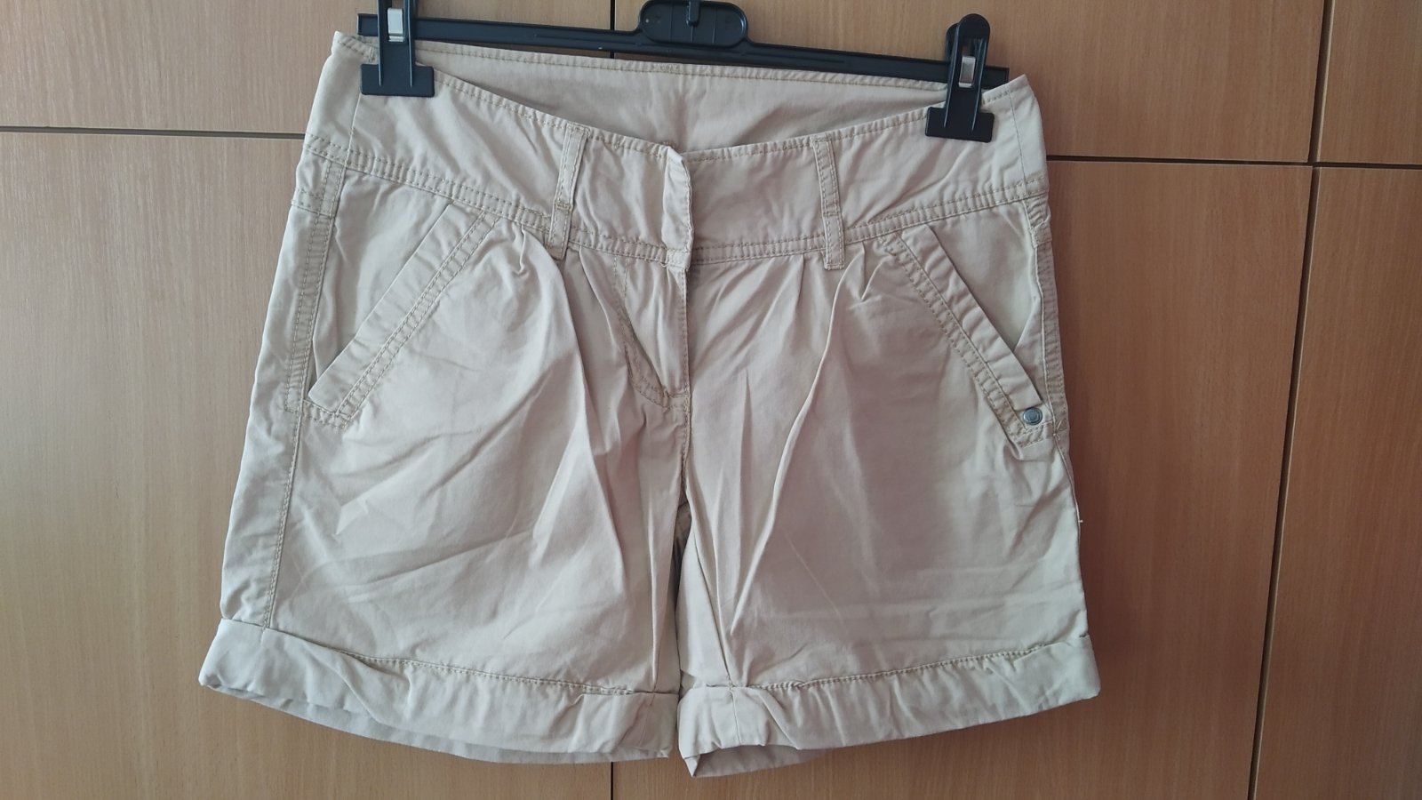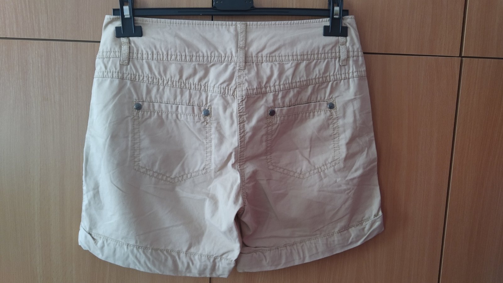 Nové zboží k prodeji Krásné béžové kraťasy, boční kapsy,zap. na drukový knoflík a zip. 97% bavlna, 3% elastan. Rozměry: dél.-25cm,,,dél.zad.sedu-29cm,,,dél.před sedu-22cm,,,pas-2x35cm,,,boky-2x42cm...