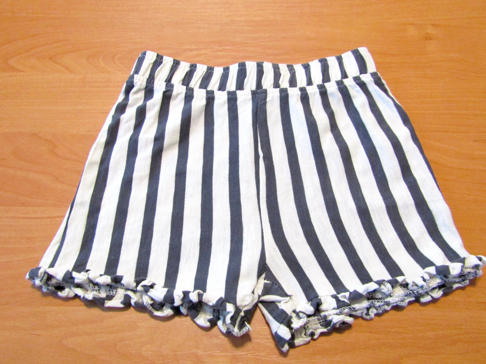 Příjemné kraťasky, jemné plátýnko, pas na gumu+zdobný páseček v ceně, vzadu potisk, falešný poklopec, d. 29, od rozkroku dolů 10, pas 22-26cm, lze i více stáhnout pásečkem