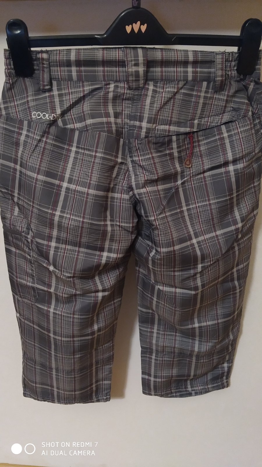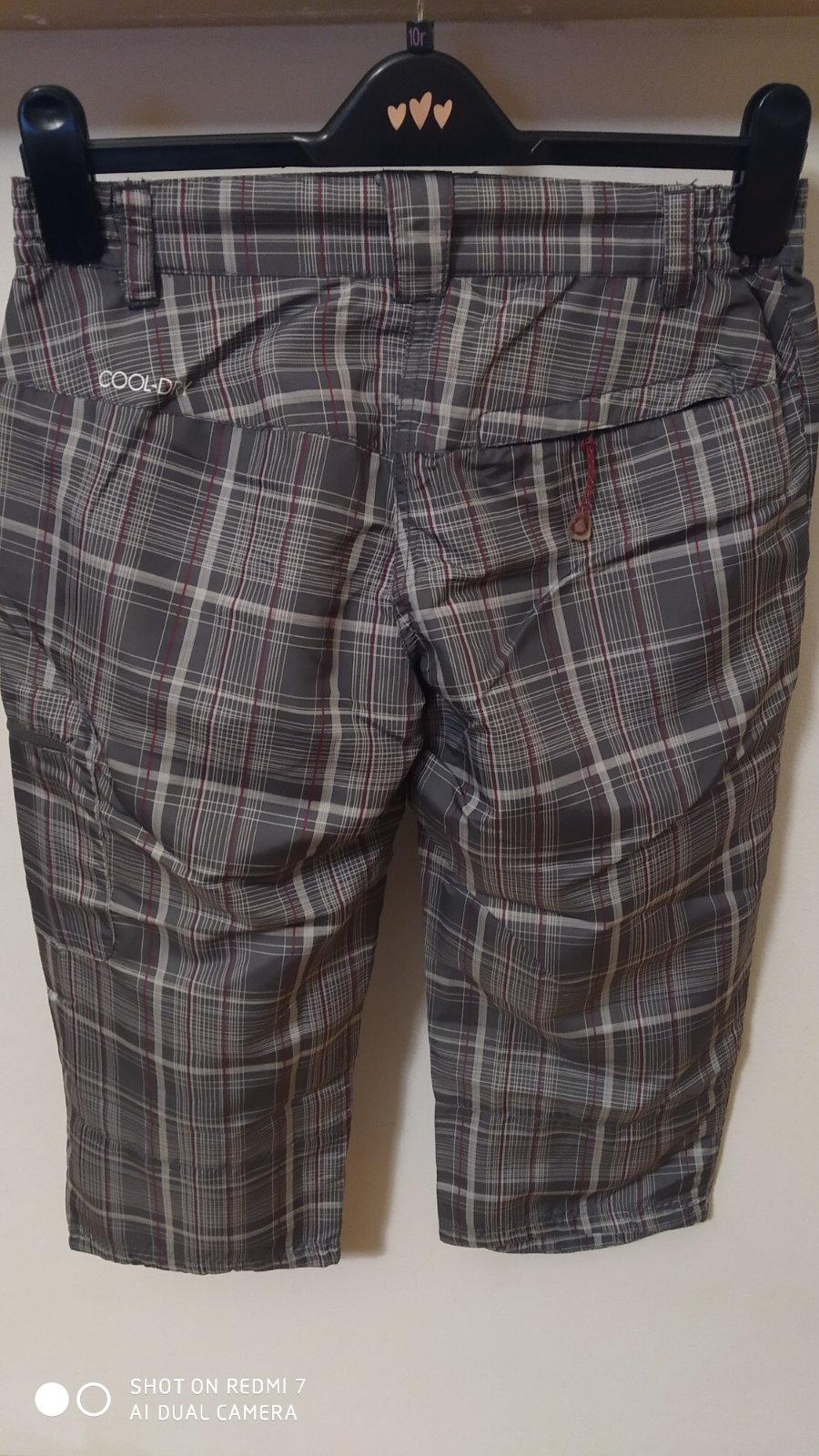 Krásné capri - materiál větruodolný, rychleschnoucí, s UV ochranou, celopotištěný, střih polopřiléhavý, pas zvýšený na zadním dílu, nařasený do gumy, s poutky na pásek. Kolena anatomicky tvarovaná, kapsy 4 celkem, 1 lepené po straně se zipy, 2 přední, 1 zadní se zipy. Potisk na předním dílu, na zadním dílu, na boku, taháčky delší pro snadnou manipulaci.