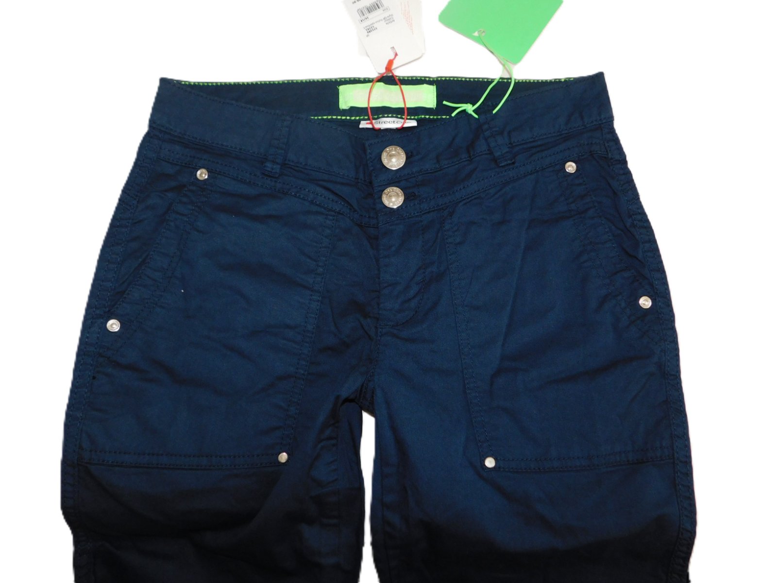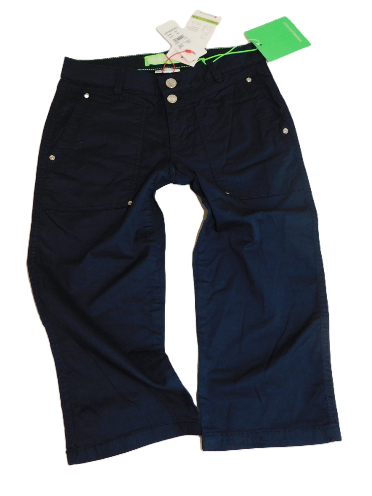 Krásné dámské sportovně elegantní kraťasy .... skvěla vypadající na vašem těle .... nové s visačkou ... zapínání na zip a knoflíky ... barva tmavě modrá ...na předním i zadním díle jsou kapsy ... pružný příjemný materiál ... vyrobeno z 97% bavlny a 3% elastan ... velikost 34/18 ....