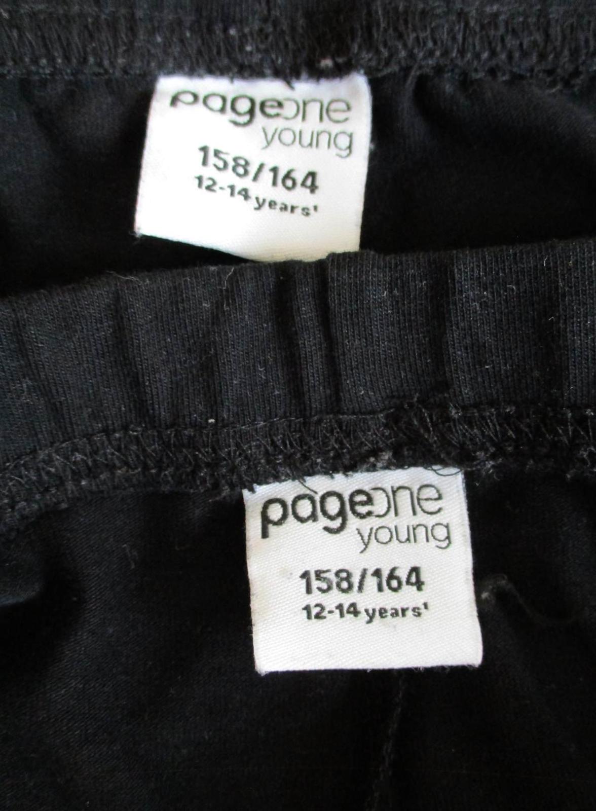 Prodám dvoje dívčí kapri legíny zn. Page One Young, velikost 158/164, téměř nenošené, top stav. Barva sytě černá, nezaprané. Materiál 95% bavlna + 5% elastan. Pas 32 cm v klidu (44 cm po natažení), celková délka 70 cm. Uvedená cena je za oba kusy.