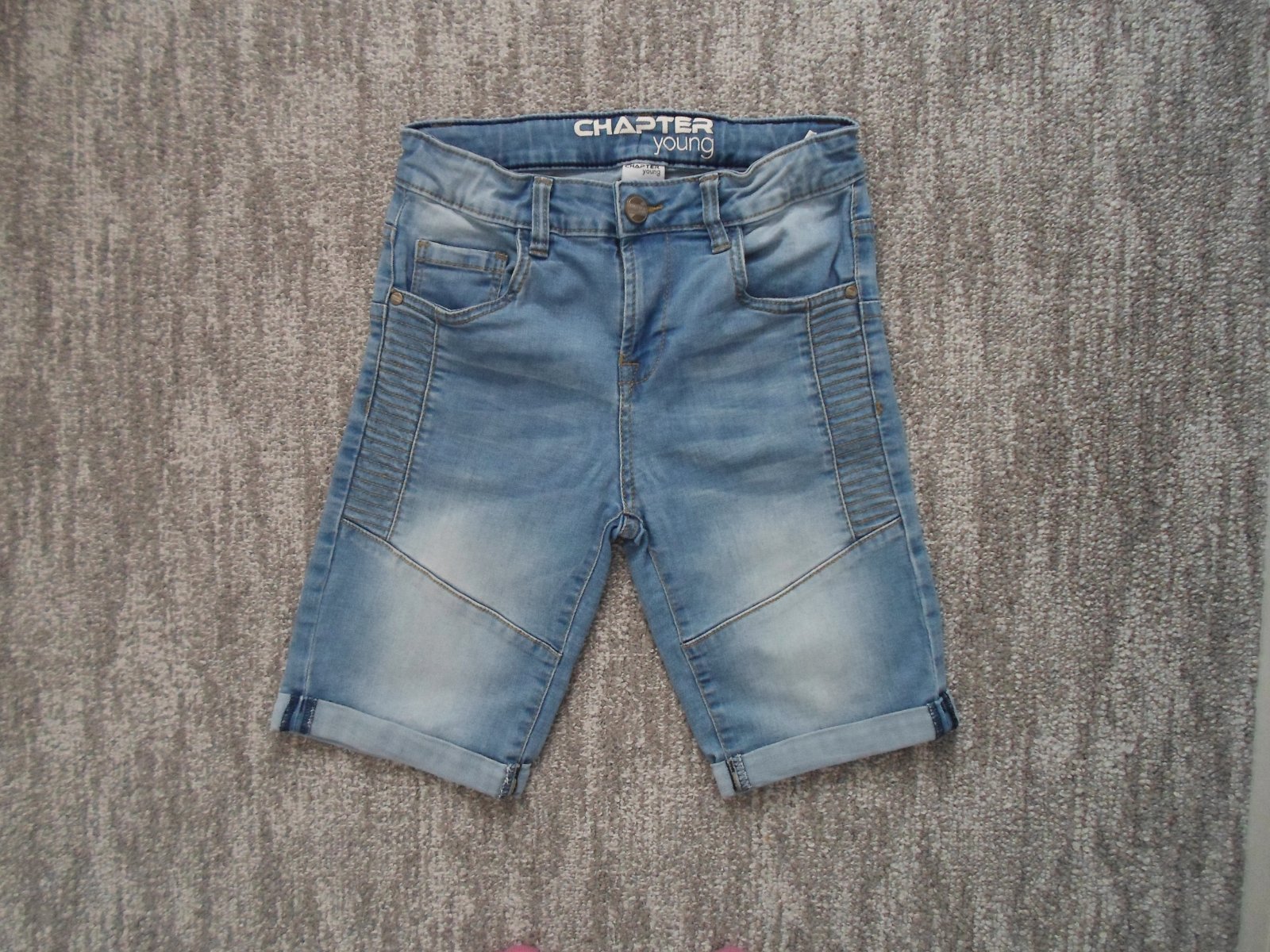 Ve skvělém stavu bez vad, vel. 146, mám dva stejné kusy, 71% bavlna, 27% polyester, 2% elastan, regulace v pase.