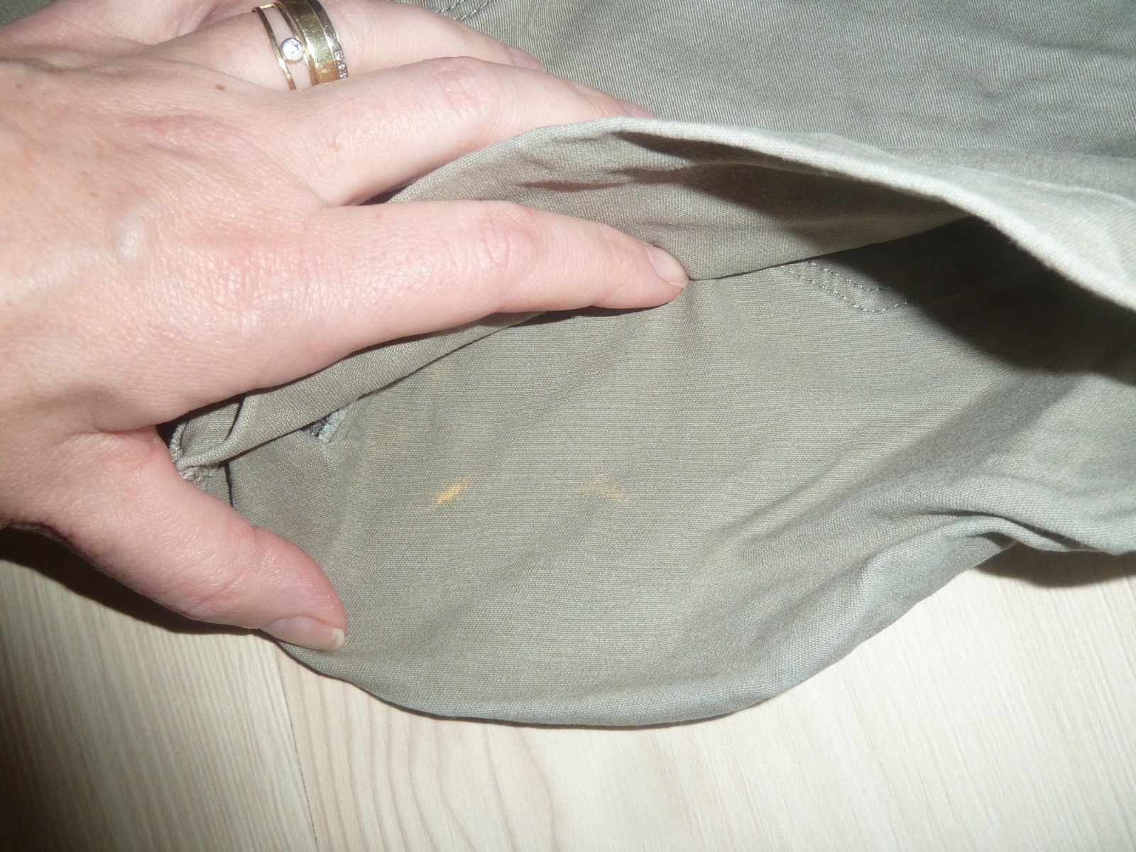 Na vnitřní straně nohavice světlé šmouhy, zvenku není vidět. Nošené. Rozměr d27 š35