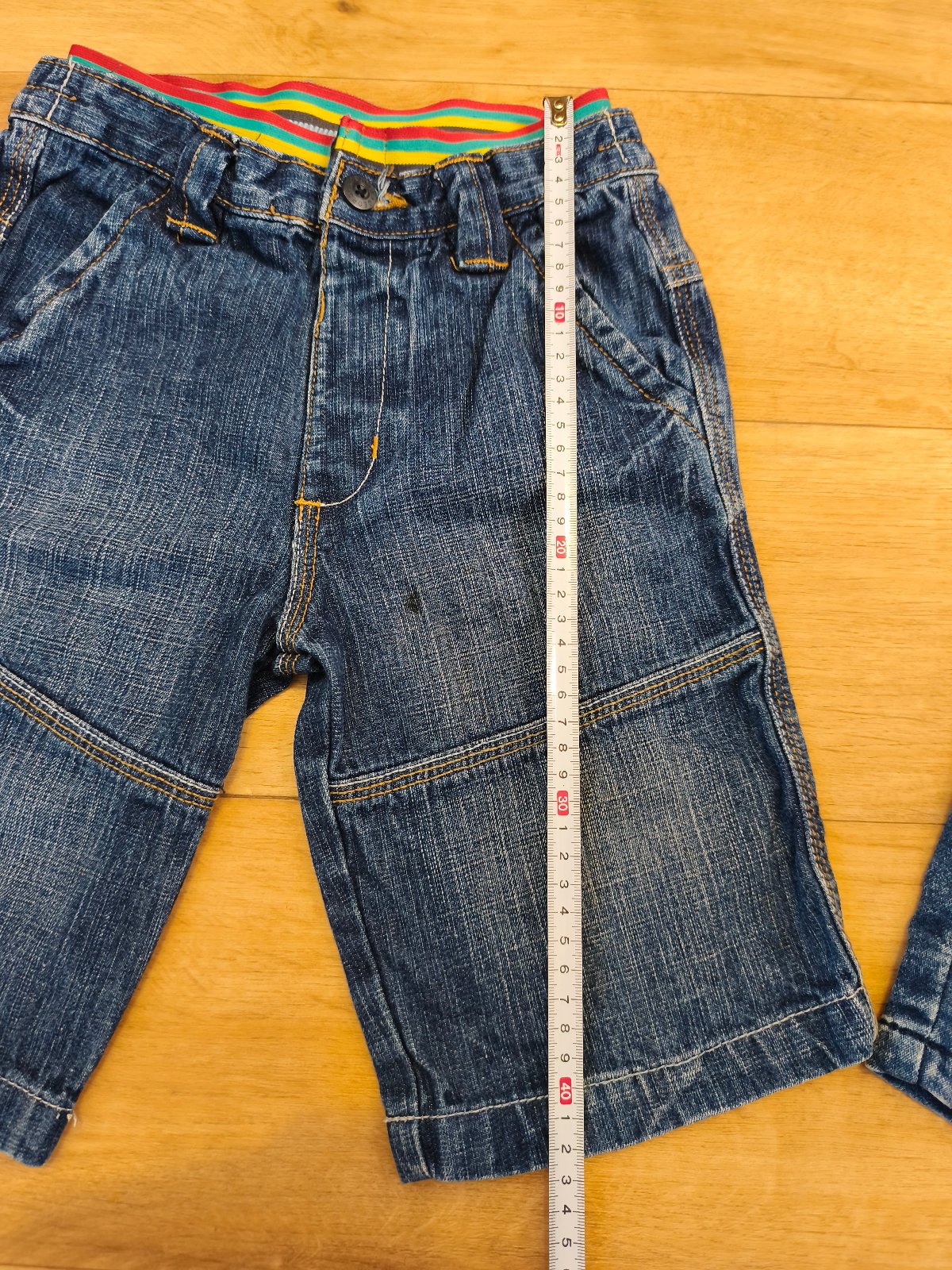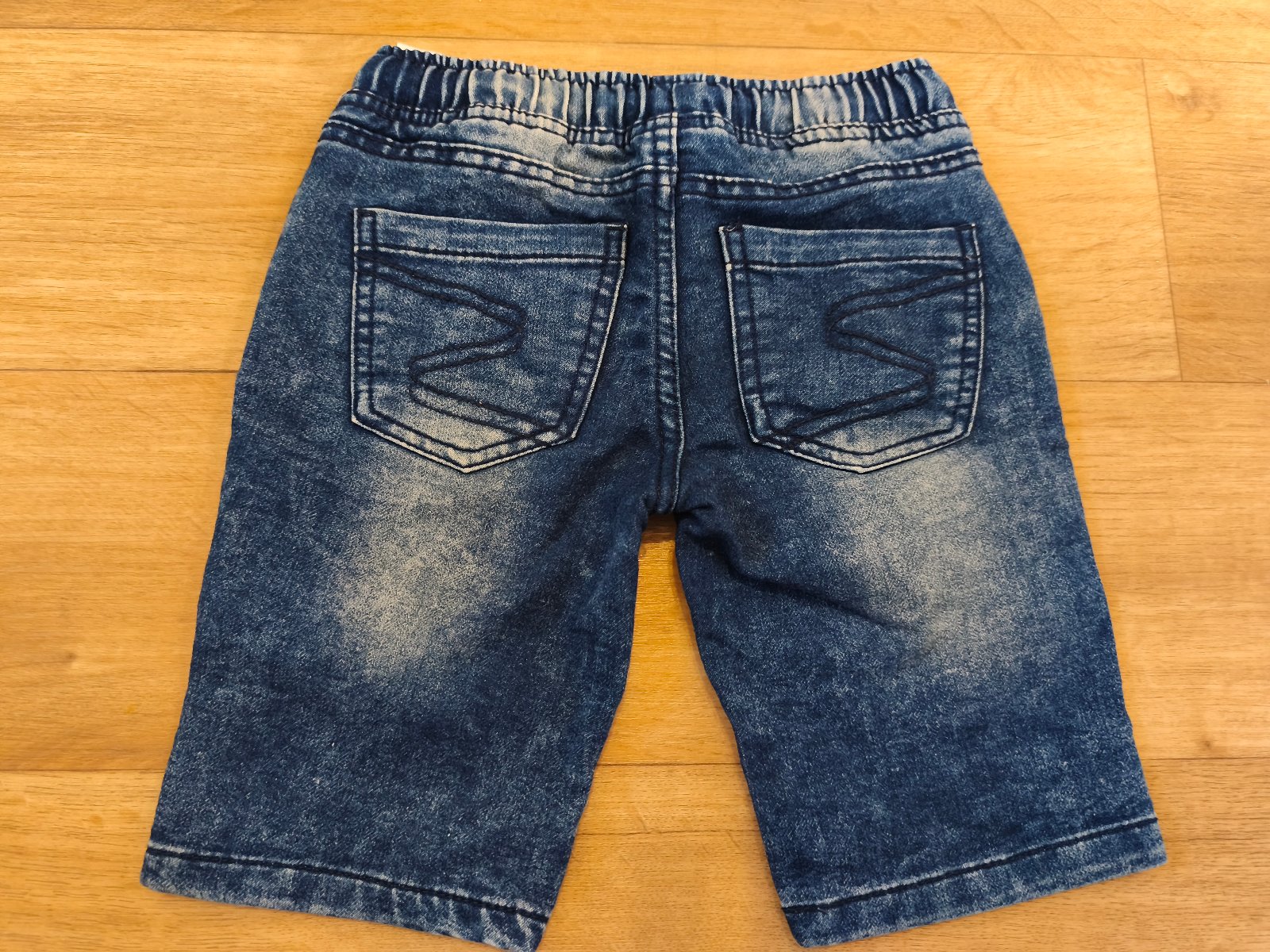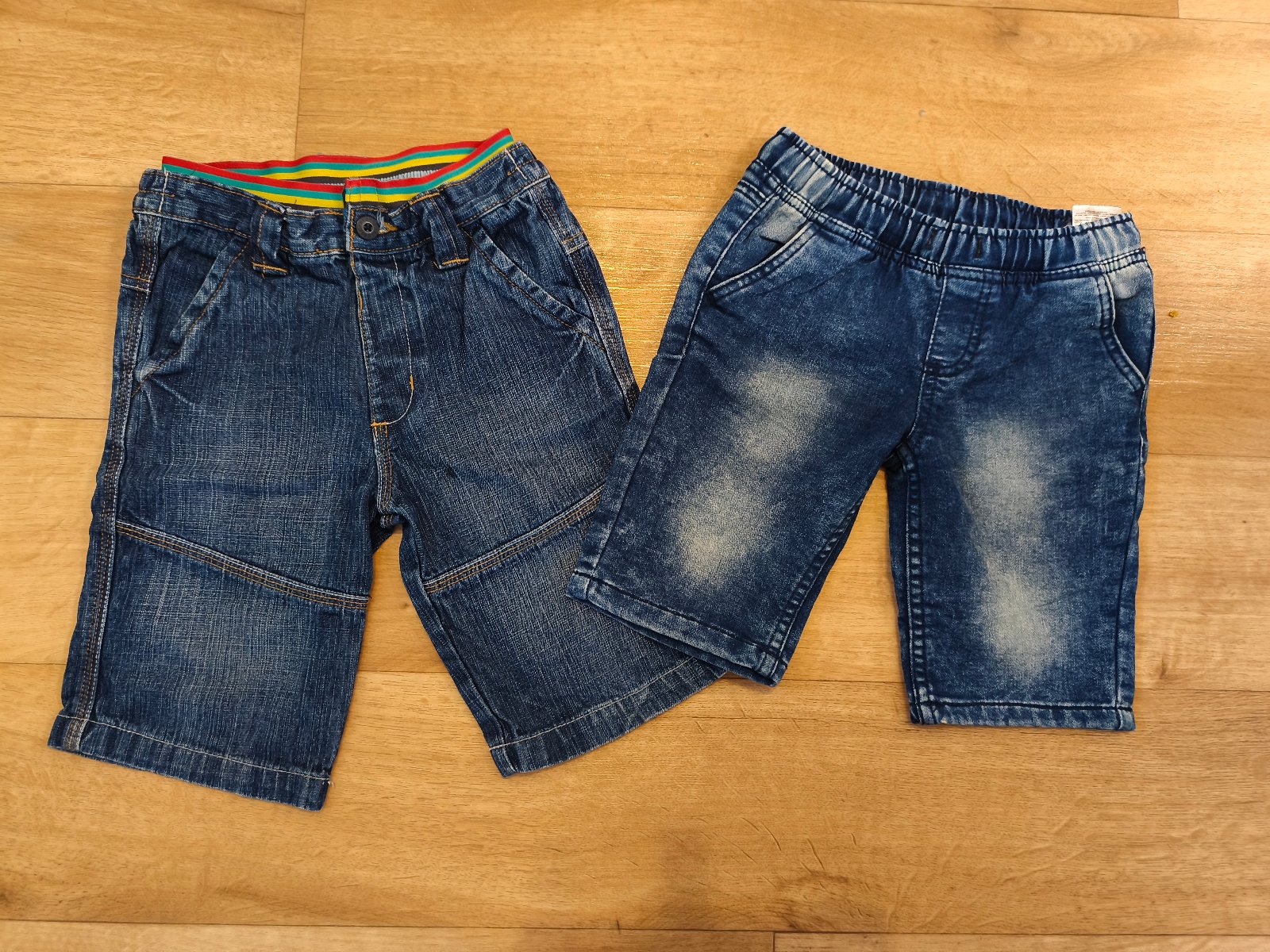 Dvoje džínové kraťasy (velikost 104/110 a 110). Syn nosil déle. Rozměry a stav na fotkách. S barevnou gumou mají flíček (na fotce), možná půjde vyprat.