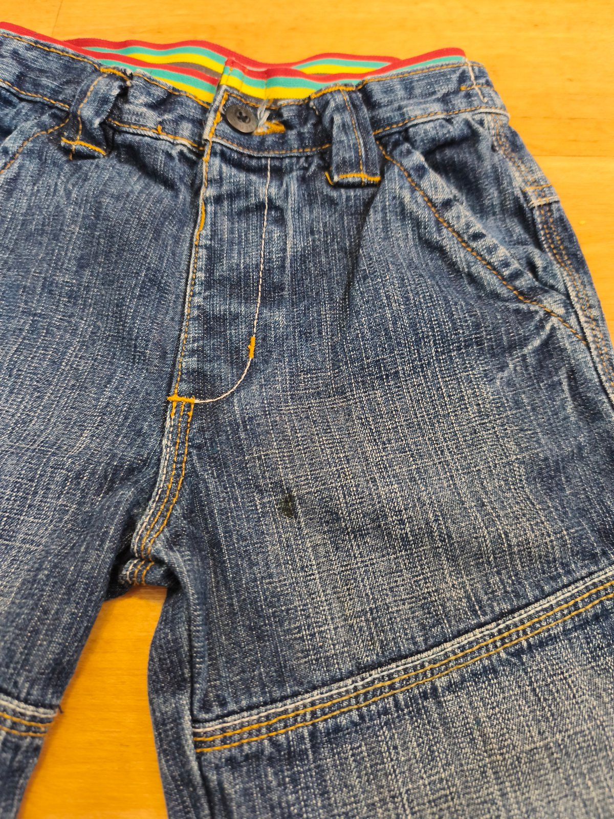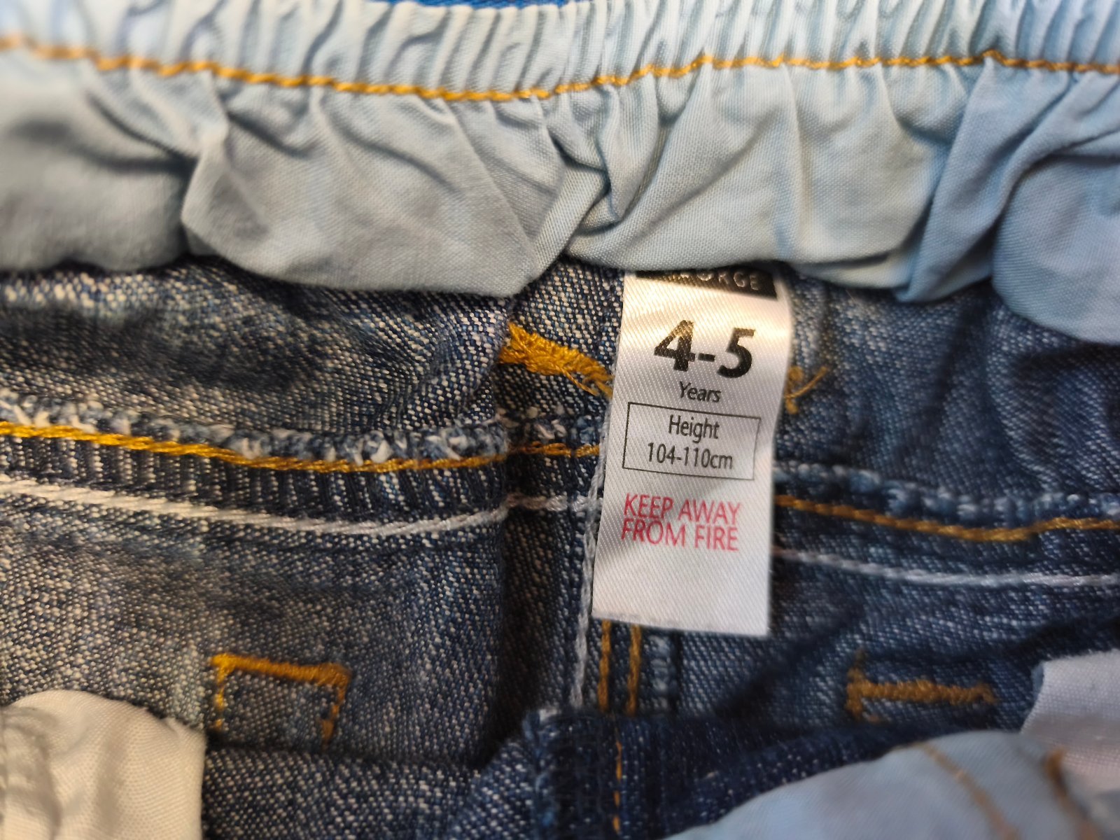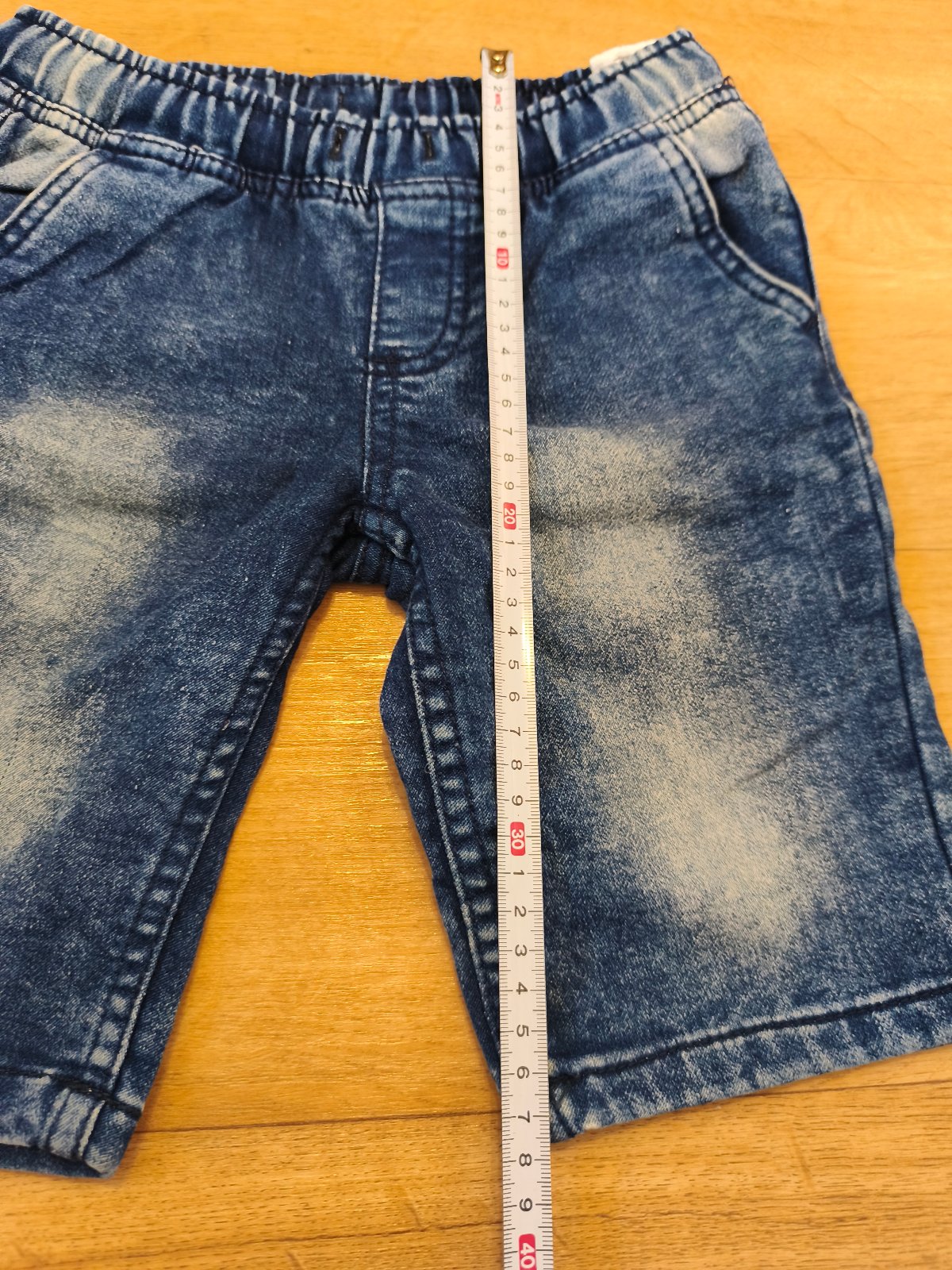 Dvoje džínové kraťasy (velikost 104/110 a 110). Syn nosil déle. Rozměry a stav na fotkách. S barevnou gumou mají flíček (na fotce), možná půjde vyprat.