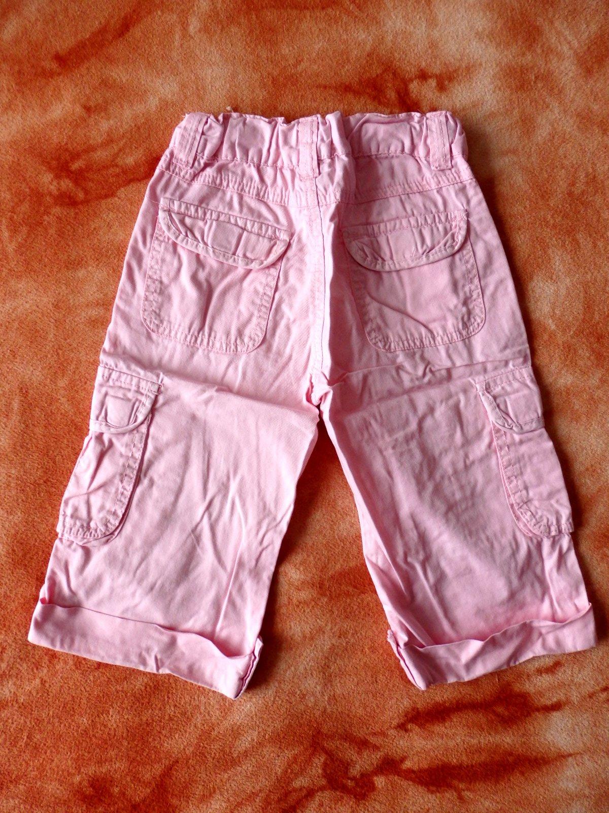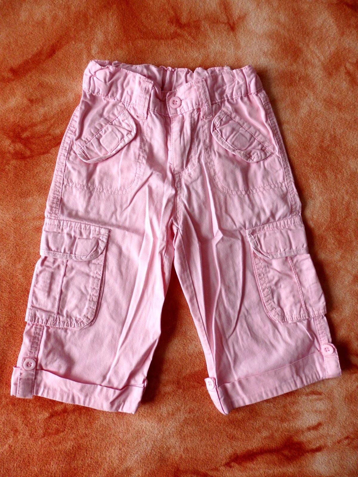 Růžové tříčtvrťáky, dvě boční kapsy, dvě zadní kapsy, dvě postranní kapsy, zapínání na zip a knoflík, ale dají se přetáhnout přes boky.