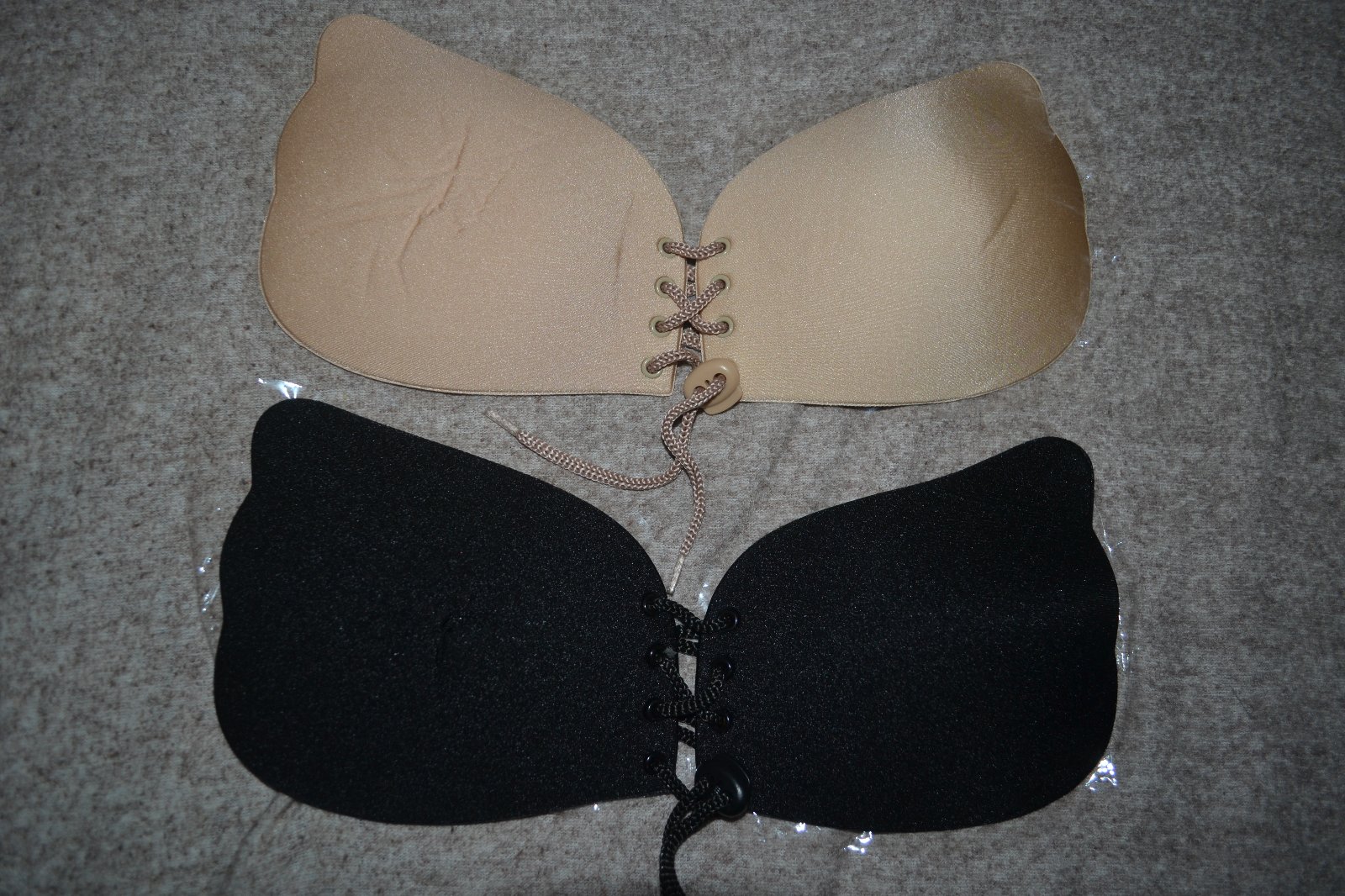 2x podprsenka bez ramínek,bez zad ,lepící, stahovací šňůrka- upravíte si podle potřeby,černá a tělová barva,cena celkem za oba kusy