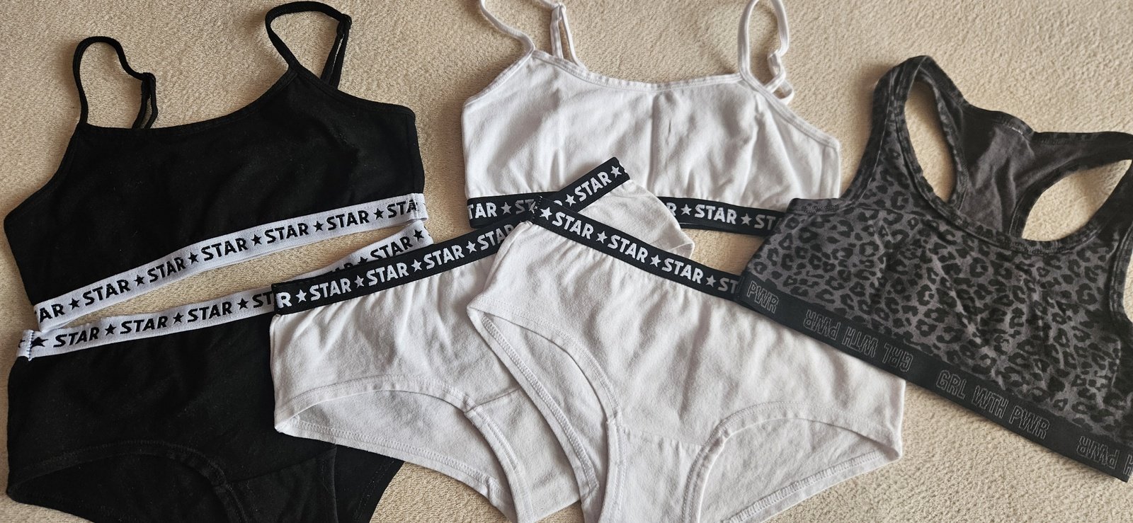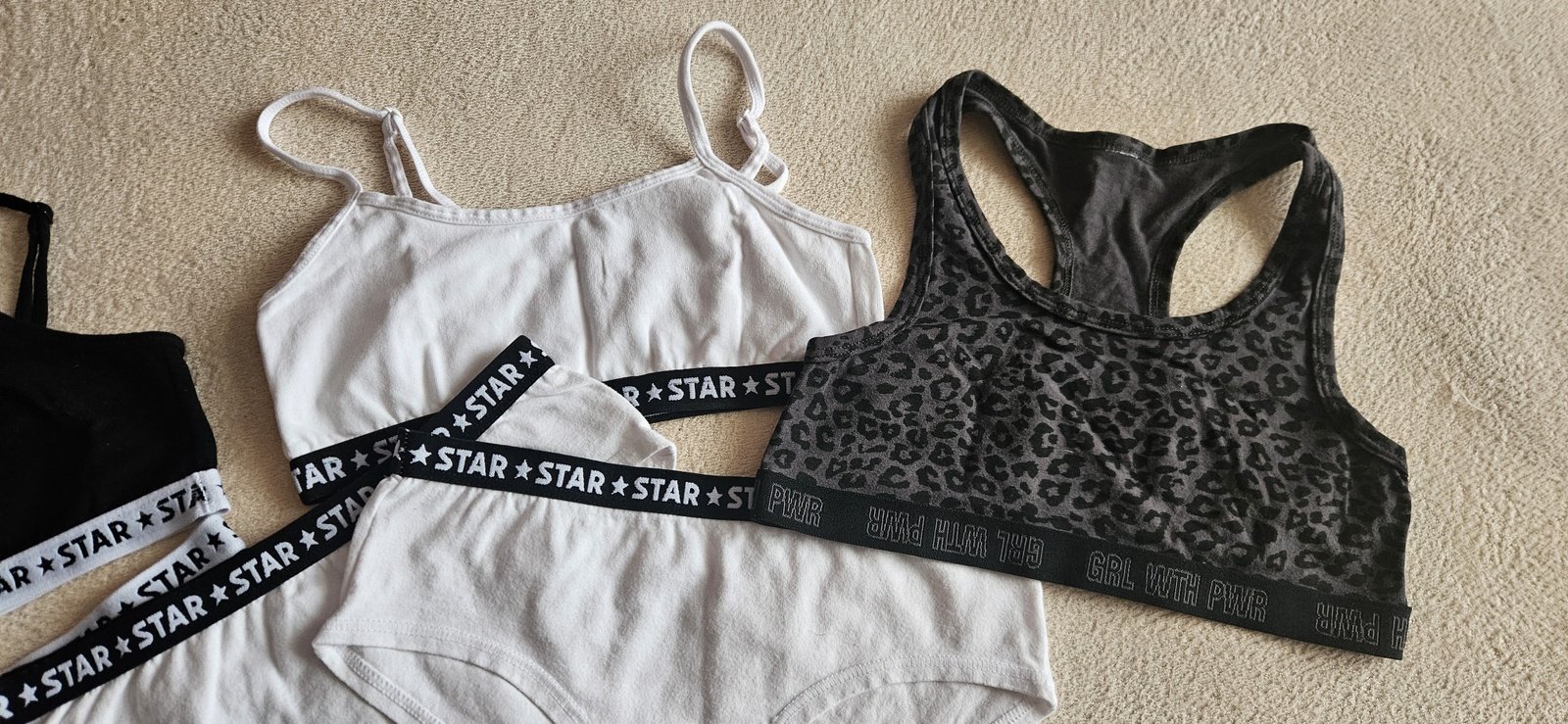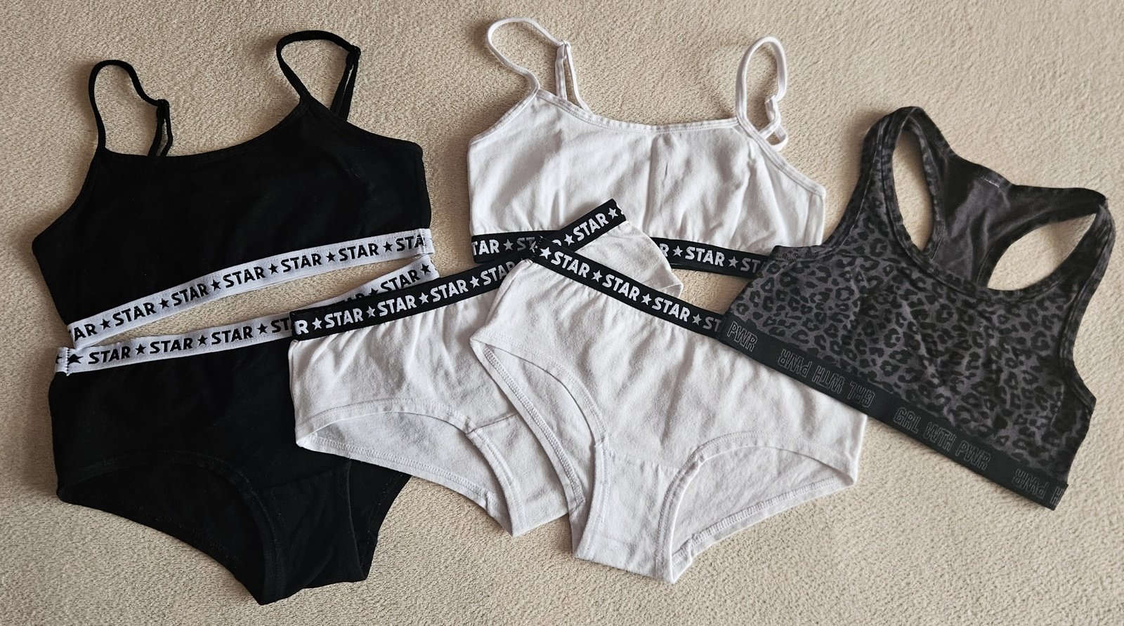 Prodám v pěkném stavu set dívčích sportovních podprsenek a spodních kalhotek kupovaných v Pepco.